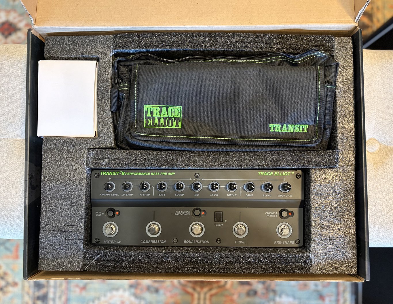This is a used and fully tested Trace Elliot Transit B Bass Pre Amp[ and it ships with the original box, power supply and carry bag.