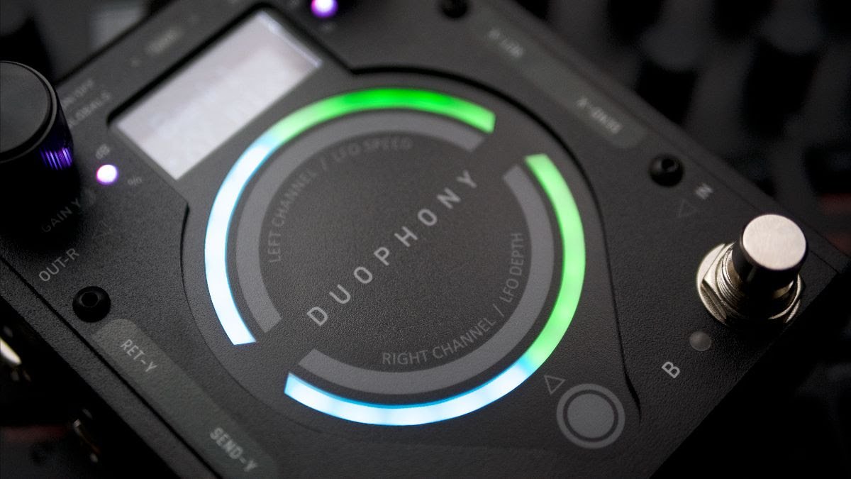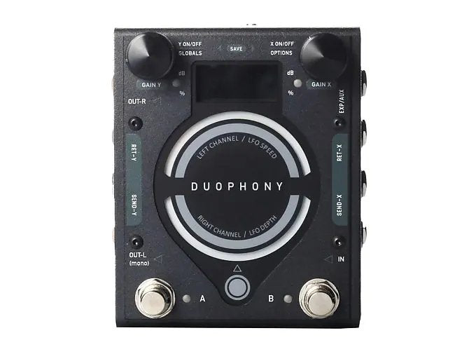 The GFI System Duophony is a mono/stereo parallel blender pedal of unparalleled depth and flexibility, allowing the user to blend two separate signal chains of any kind in myriad different ways.Its rotary touch slider mix control is both intuitive and eye catching, requiring but a swipe of the finger to tweak the blend ratio of Duophony’s X and Y loops.