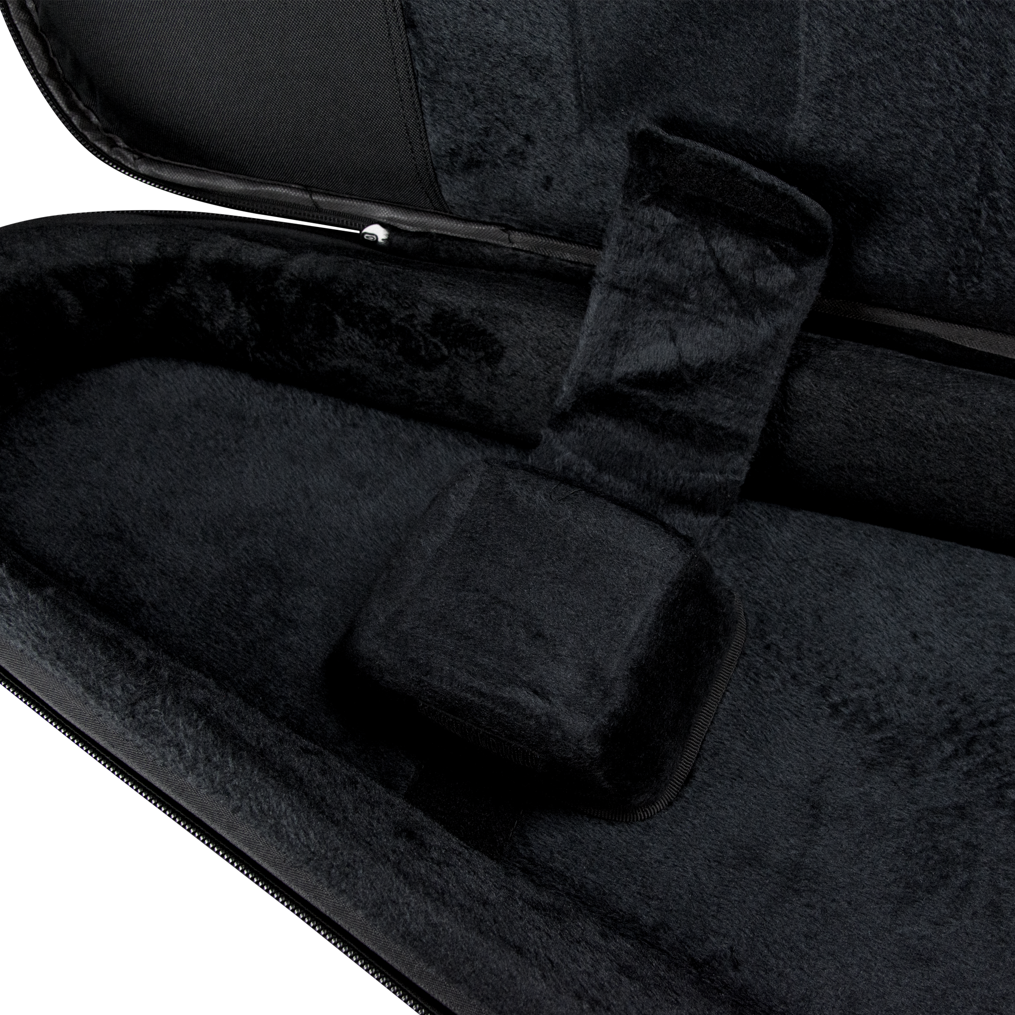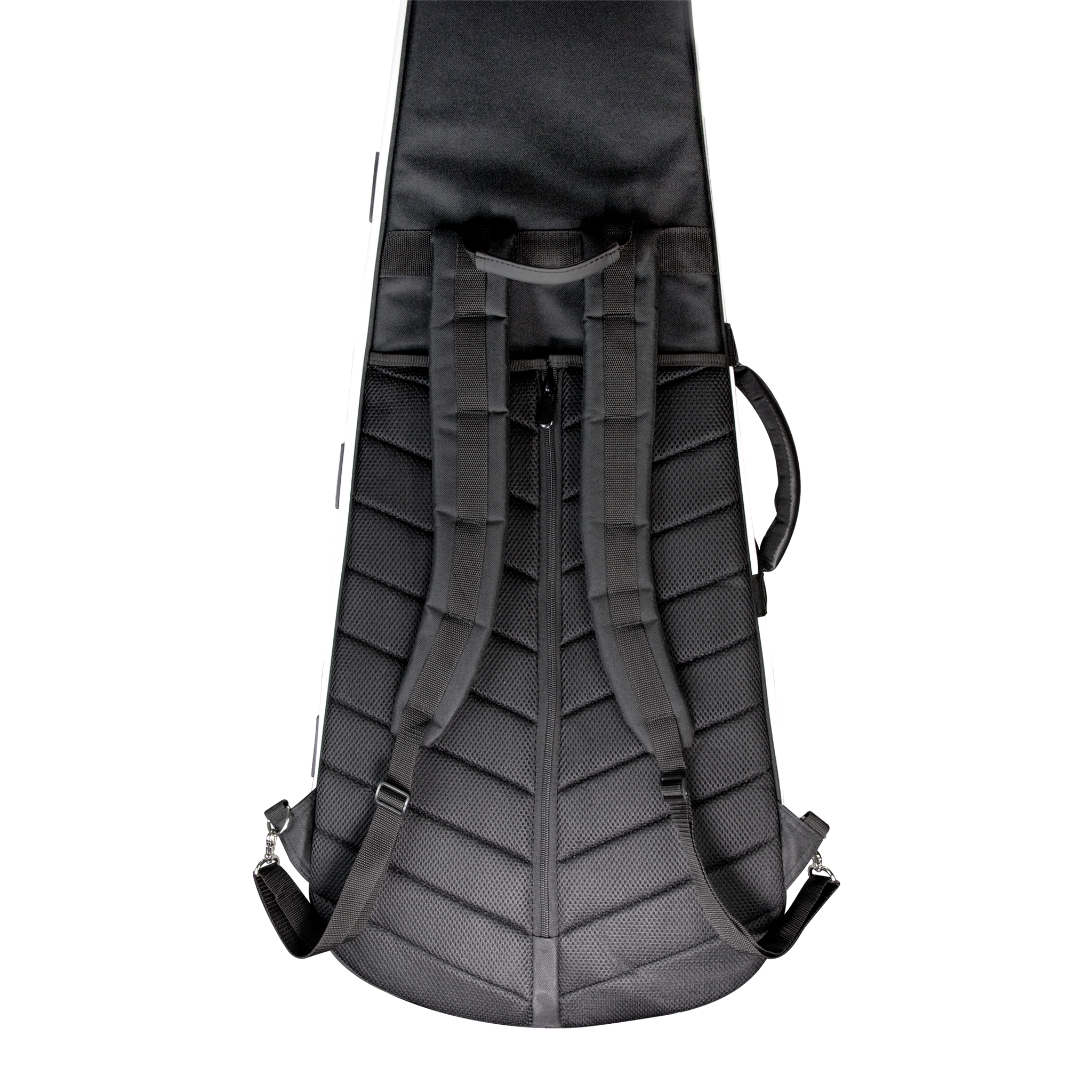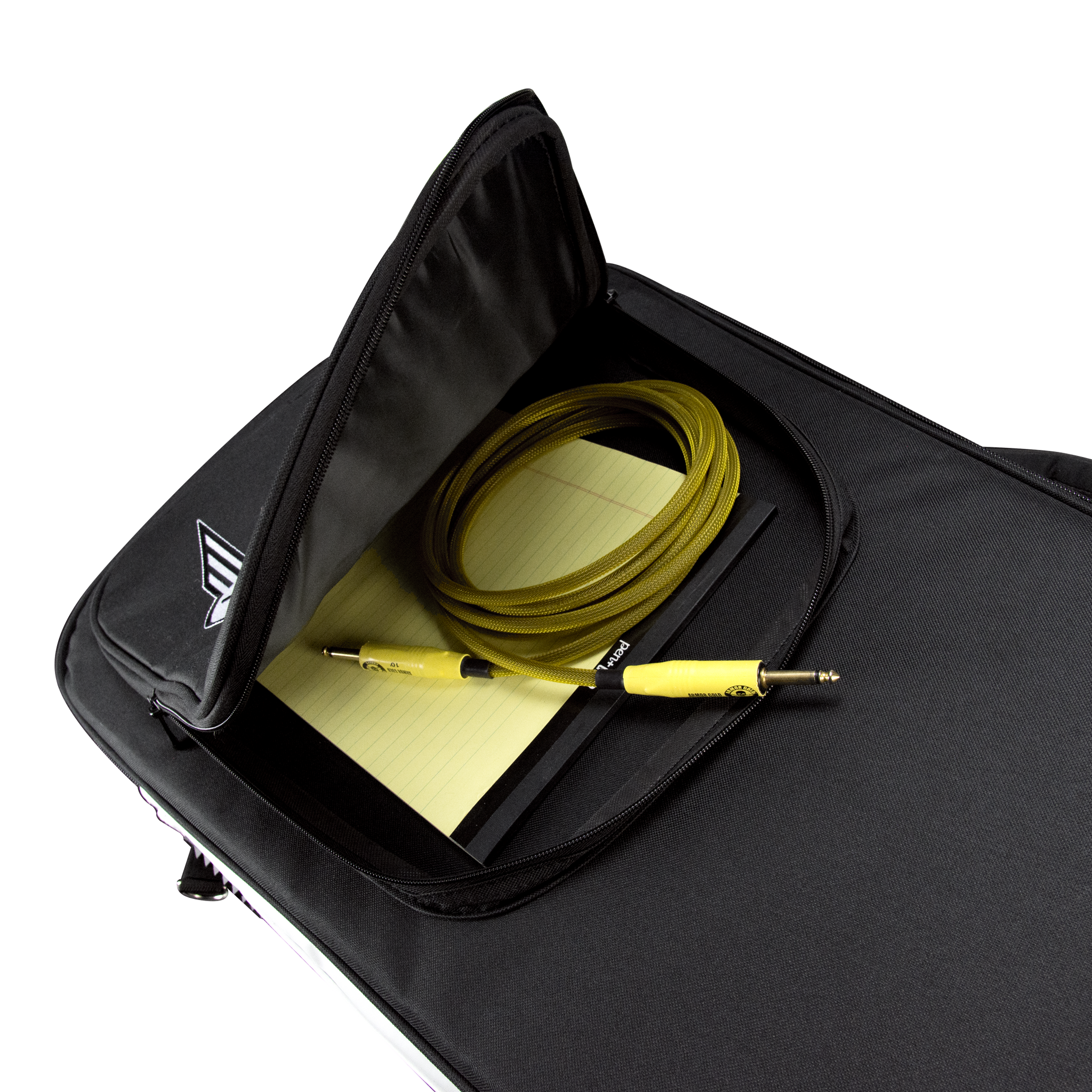 The Reverend Soft Case protects your instrument securely with durable and weather-resistant materials. The interior has thick padding, a removable neck brace, and extra padding on the bottom. The outside features plenty of storage space for your accessories with two large exterior pockets. The padded backside has a carrying handle and two shoulder straps that can be easily tucked away inside a zippable back pad when not in use.