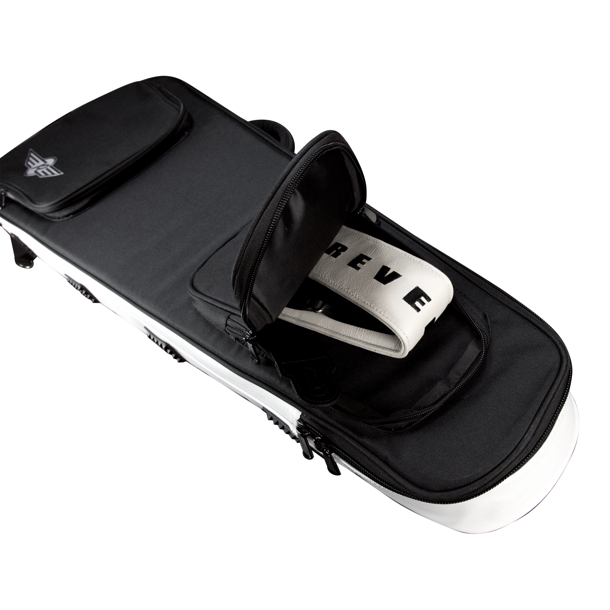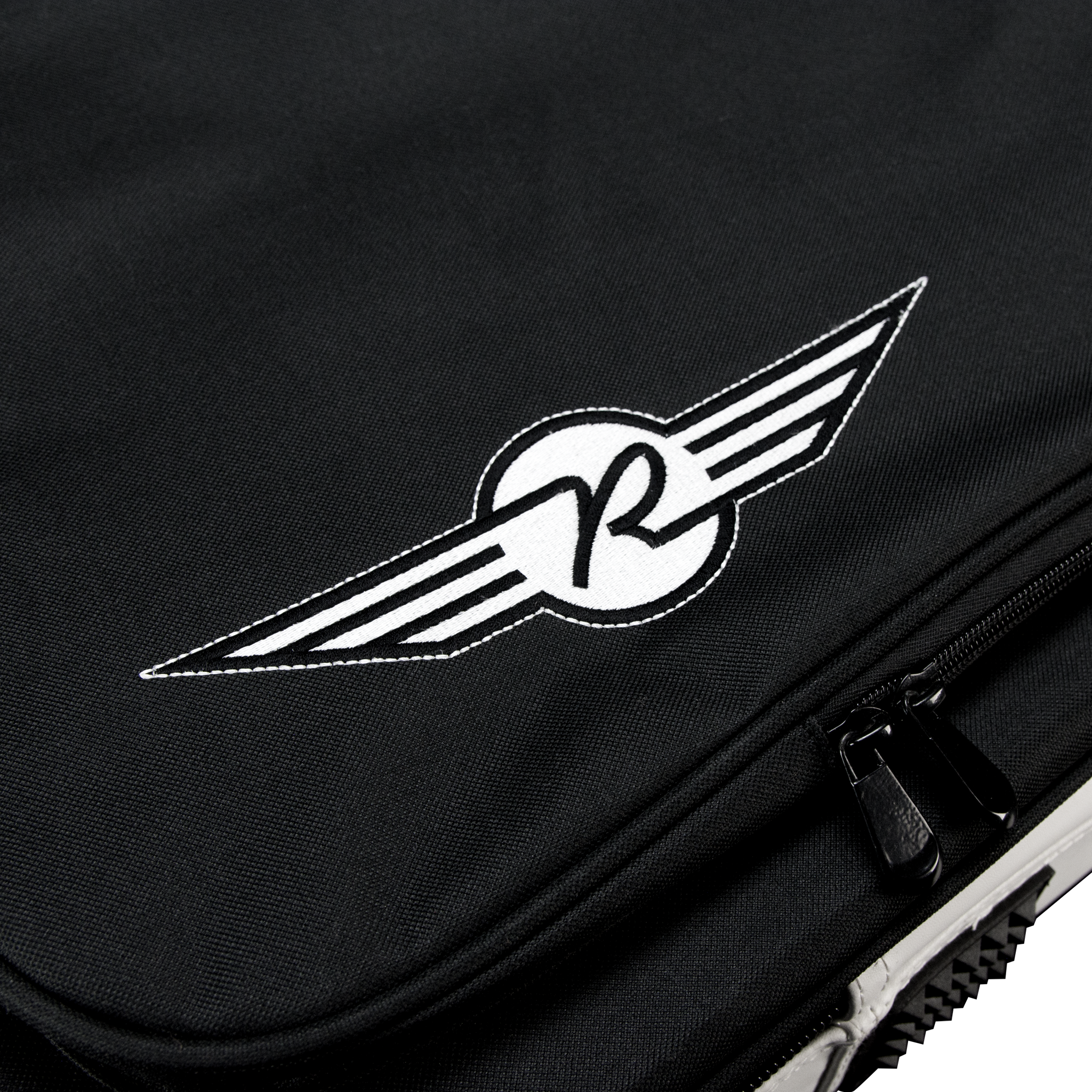 The bag comes in the Reverend Teardrop shape and features the same black and white design and logo placement as the original hard shell case.
