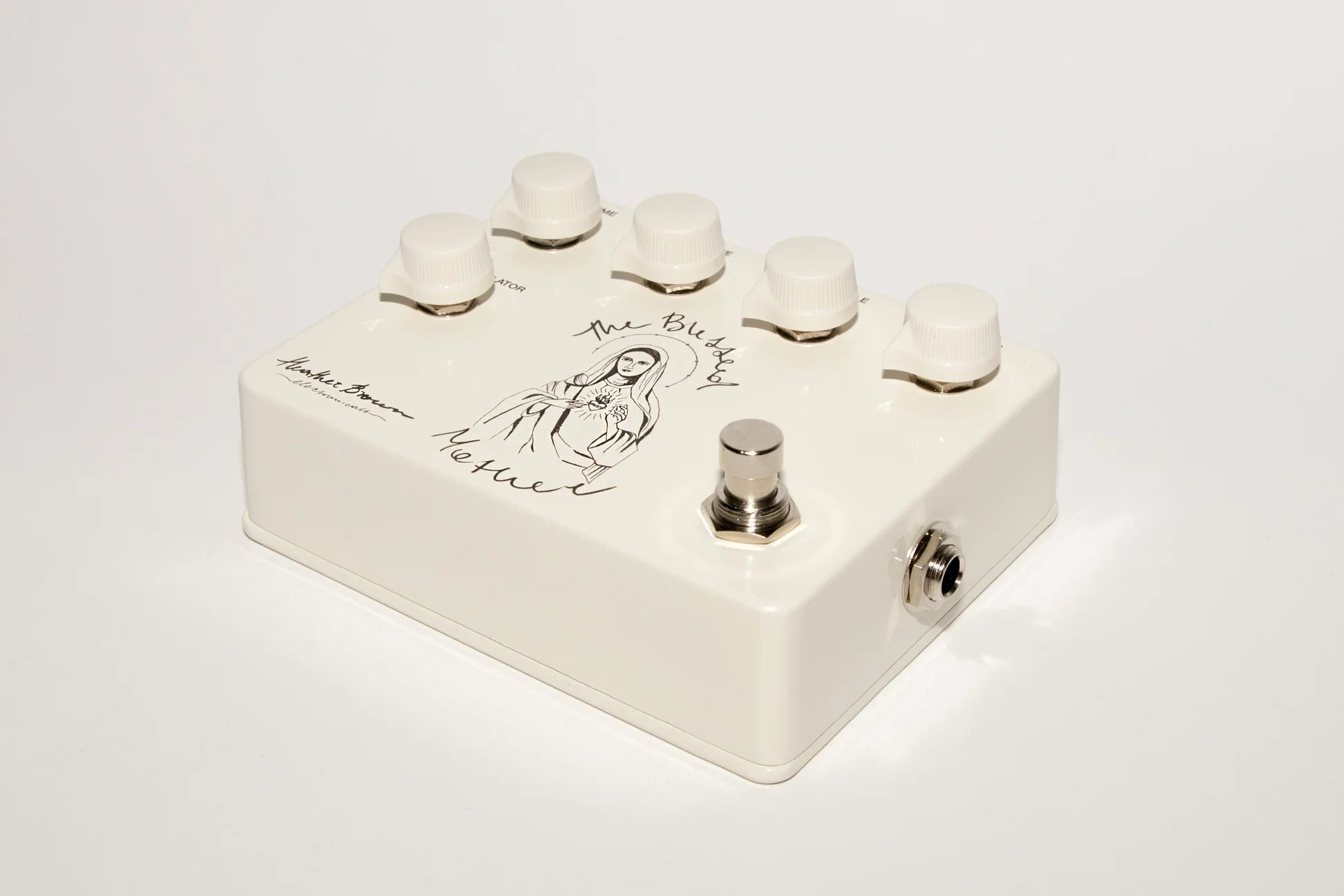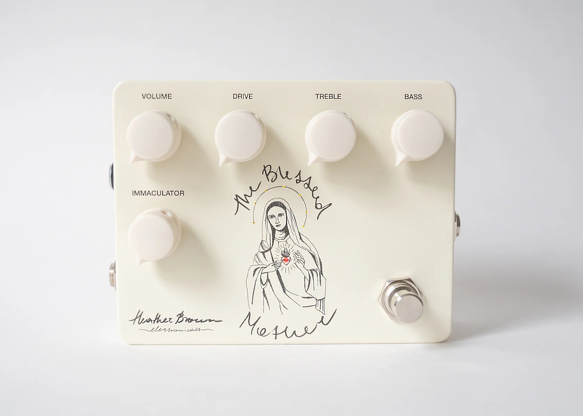 The Blessed Mother V2 births a classic overdrive sound, perfecting that raw, yet velvety tone. The range goes deep and wide thanks to the Immaculator function, which allows you to control the transparency of the drive. Dial in sounds from vintage, Tubescreamer-like grit to a heavenly, transparent boost. The Blessed Mother plays well with others and often enhances other drives in the signal chain. Thanks to a supernatural combination of silicon and germanium diodes, the gain has a warm and sweet character to it, just like you would expect from God's mom. Separate treble and bass controls allow you to really tailor the feel to your liking, but this pedal’s speciality is its powerful midrange that can cut through no matter where on the neck you are playing.