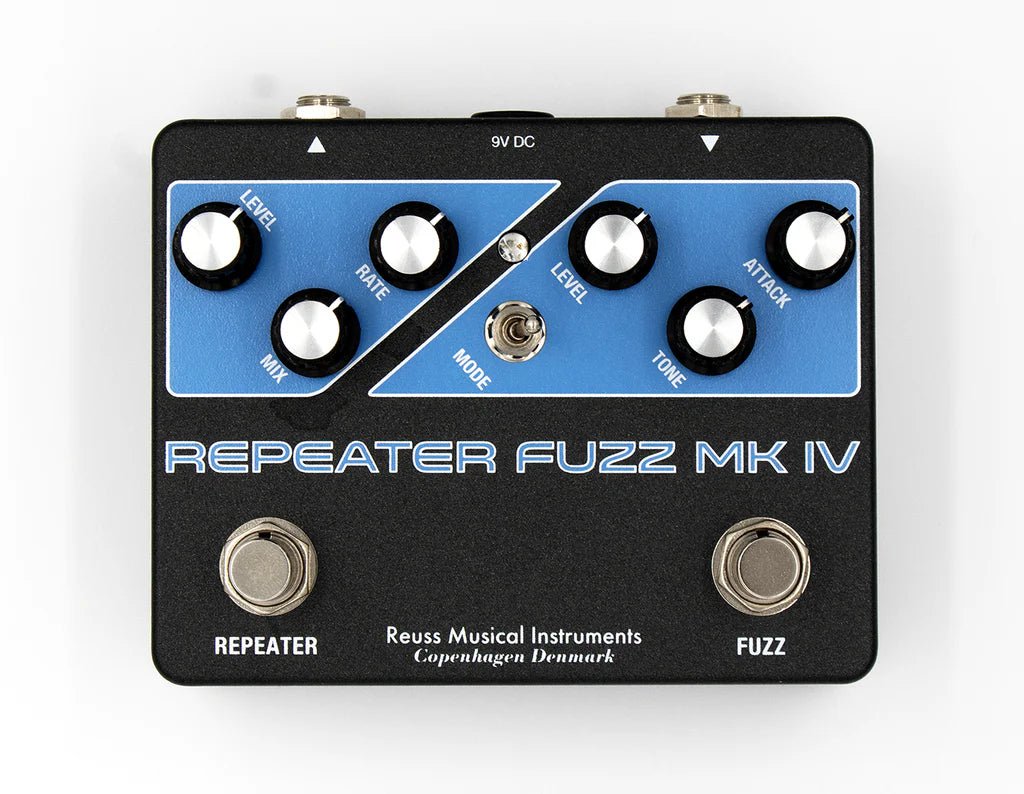 The Reuss Repeater Fuzz Mk IV marks a return to the two-in-one pedal concept of the old Mk I and II. The pedal features a fuzz part and a repeat percussion part, each with their own dedicated footswitch and level control.