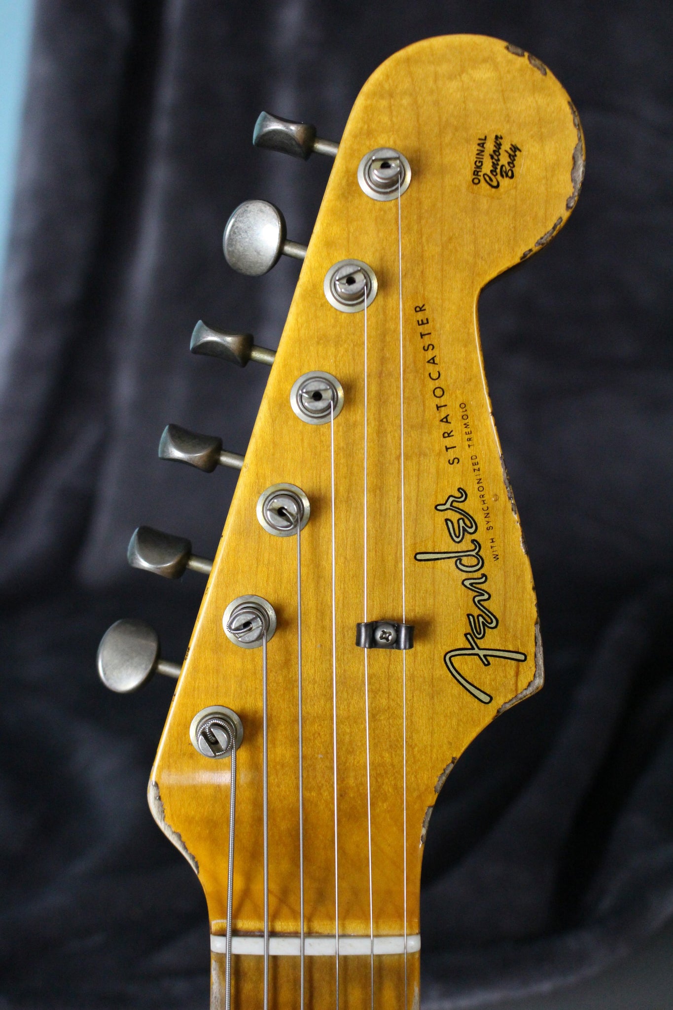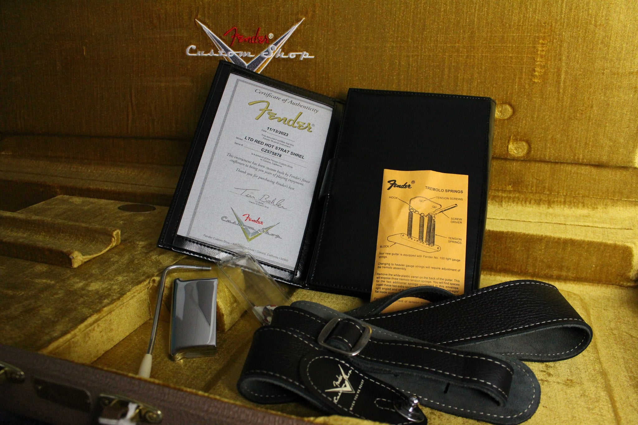 Pickups/Hardware: Fender Custom Shop Hand Wound “Red Hot” Neck, Middle and Bridge, aged tremolo bridge, aged kluson tuners.
