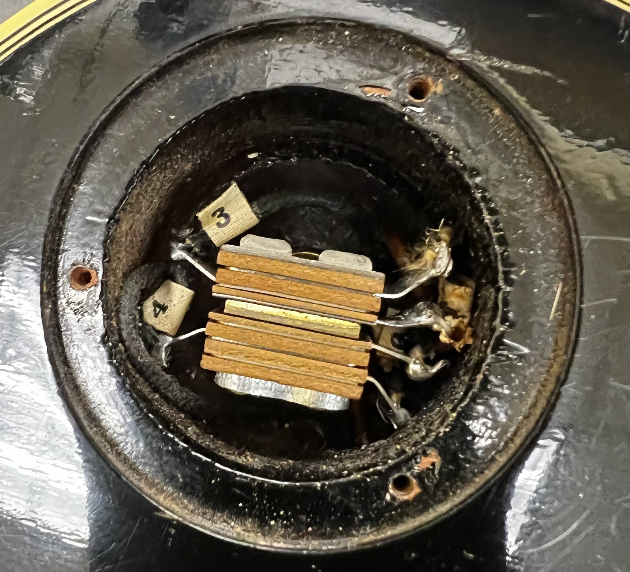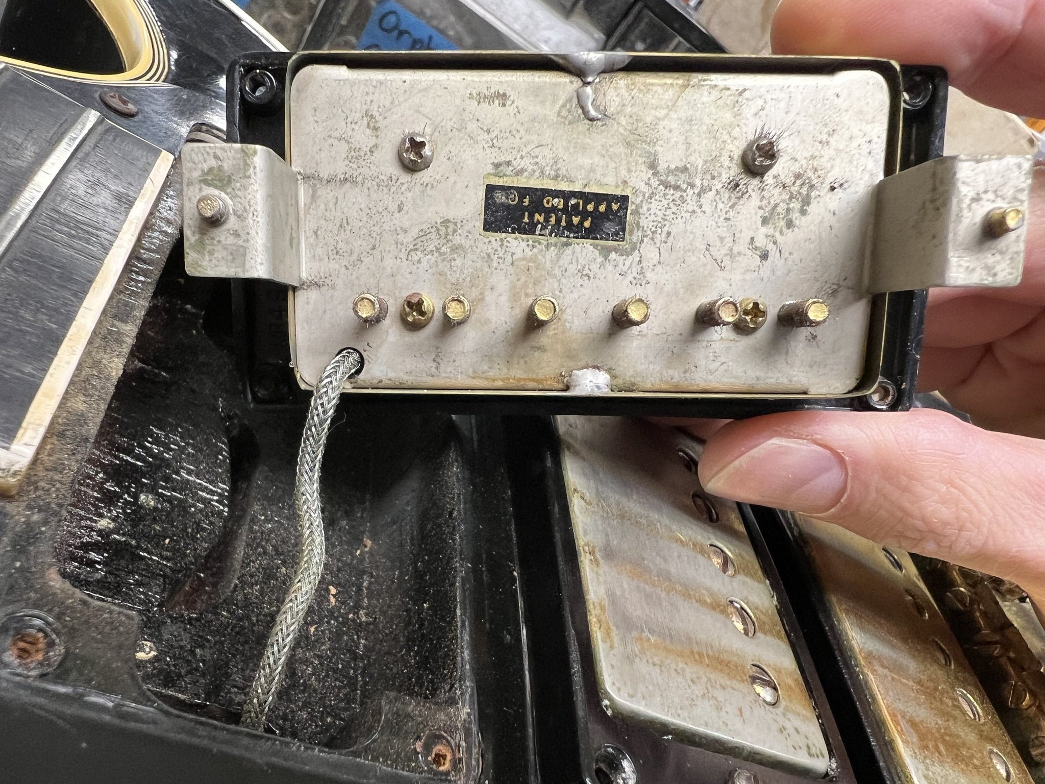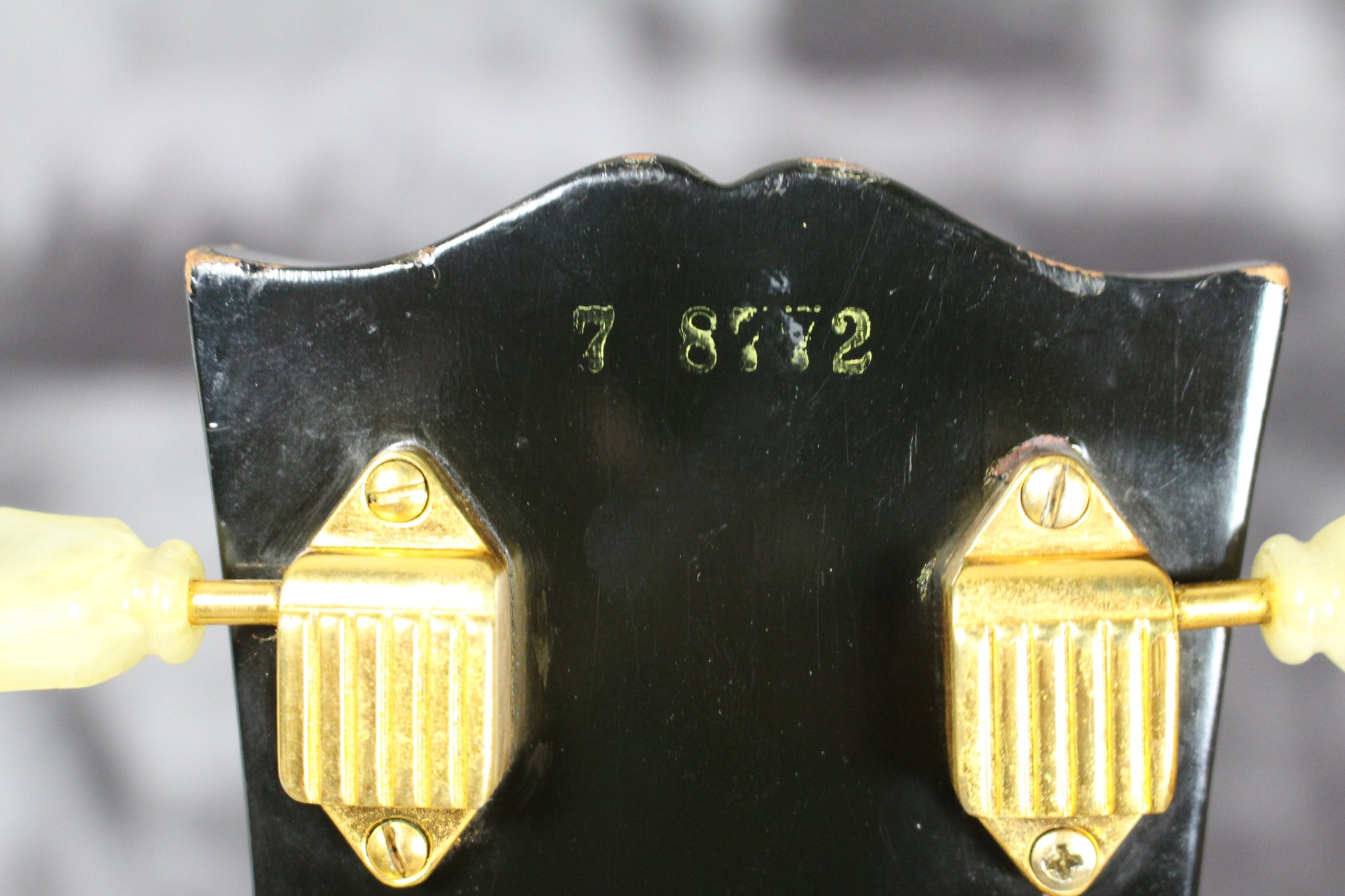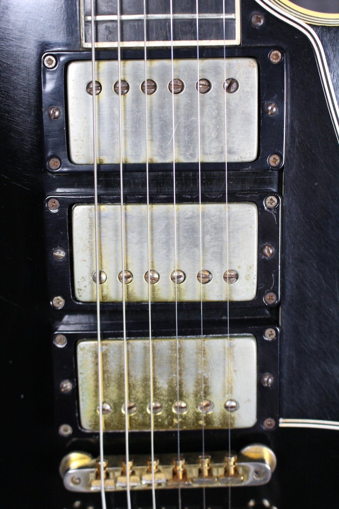 Cosmetics: This 1957 Les Paul Custom is in excellent condition. It has light surface scratches and small indentations. The back of the body has some buckle rash and some other scuffs. The hardware has tarnished and is losing its gold in places. There are two screws that have been changed on the tuning keys on the back of the headstock. “Rhythm” and “Treble” have started to wear off on the pickup selector ring. Under a black light you can see where the last owner had three stickers with his initials right below the tailpiece. These stickers have since been removed. This can now only be seen under a black light. Most of the fret wear is on the bottom four strings and up to about the 7th fret. The back of the neck is in great shape with light wear that includes light scuffs and small indentations. The binding on the body is in great shape and has aged beautifully. There is a scuff in the binding on the bottom of the cutaway. (See Photos Please)