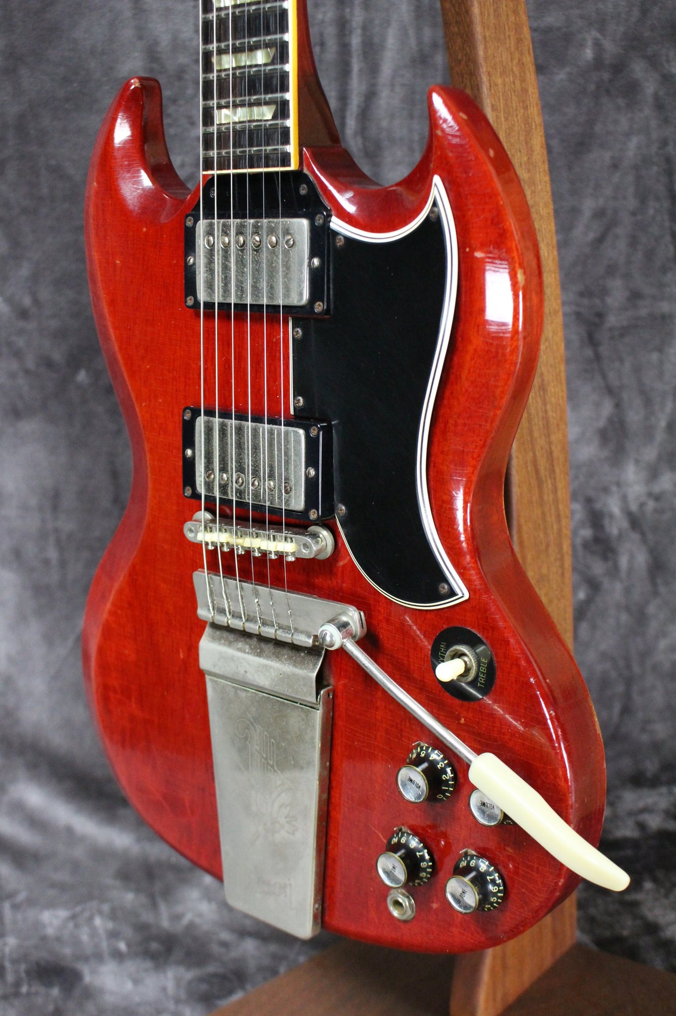This 1965 Gibson SG Standard boasts the original Patent Number humbuckers and the original bridge and Maestro Vibrola. Super light, loud and resonant acoustically, this SG is the epitome of beveled grace. Plugged in it has all the classic, vintage Gibson electric guitar character you would expect from a pair killer PAF Humbucker pickups, ready for your slide dreams or slashing chords.