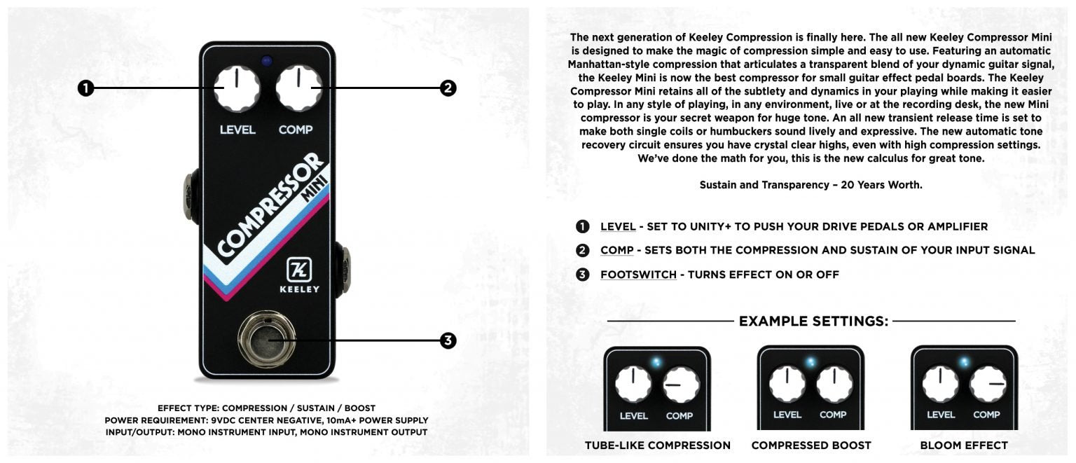 Featuring Manhattan-style compression, the Compressor Mini intuitively and automatically delivers the perfect blend of dynamic and compressed guitar signal. This is how the Compressor Mini retains all of the subtlety and dynamics in your playing, making it effortless to play and sound your best. An all-new transient release time is set to make both single coils or humbuckers sound lively and expressive. The new automatic tone recovery circuit ensures crystal clear highs, even with high compression settings. The Compressor Mini’s pre-amp tone is legendary; pushing both pedals and amplifiers to their greatest potential. With any style of guitar, playing live or at the recording desk, the Compressor Mini is your secret weapon. We’ve done the math for you, this is the new calculus for great tone.