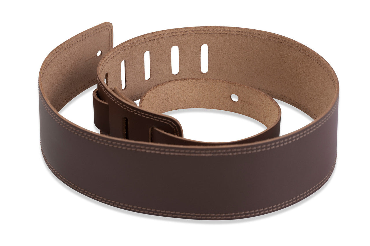 2 1/2" Leather Guitar Strap With Suede Backing And Decorative Double Edge Stitch. Adjustable From 37" To 51". Brown Color. Suede backing and decorative double edge stitch.