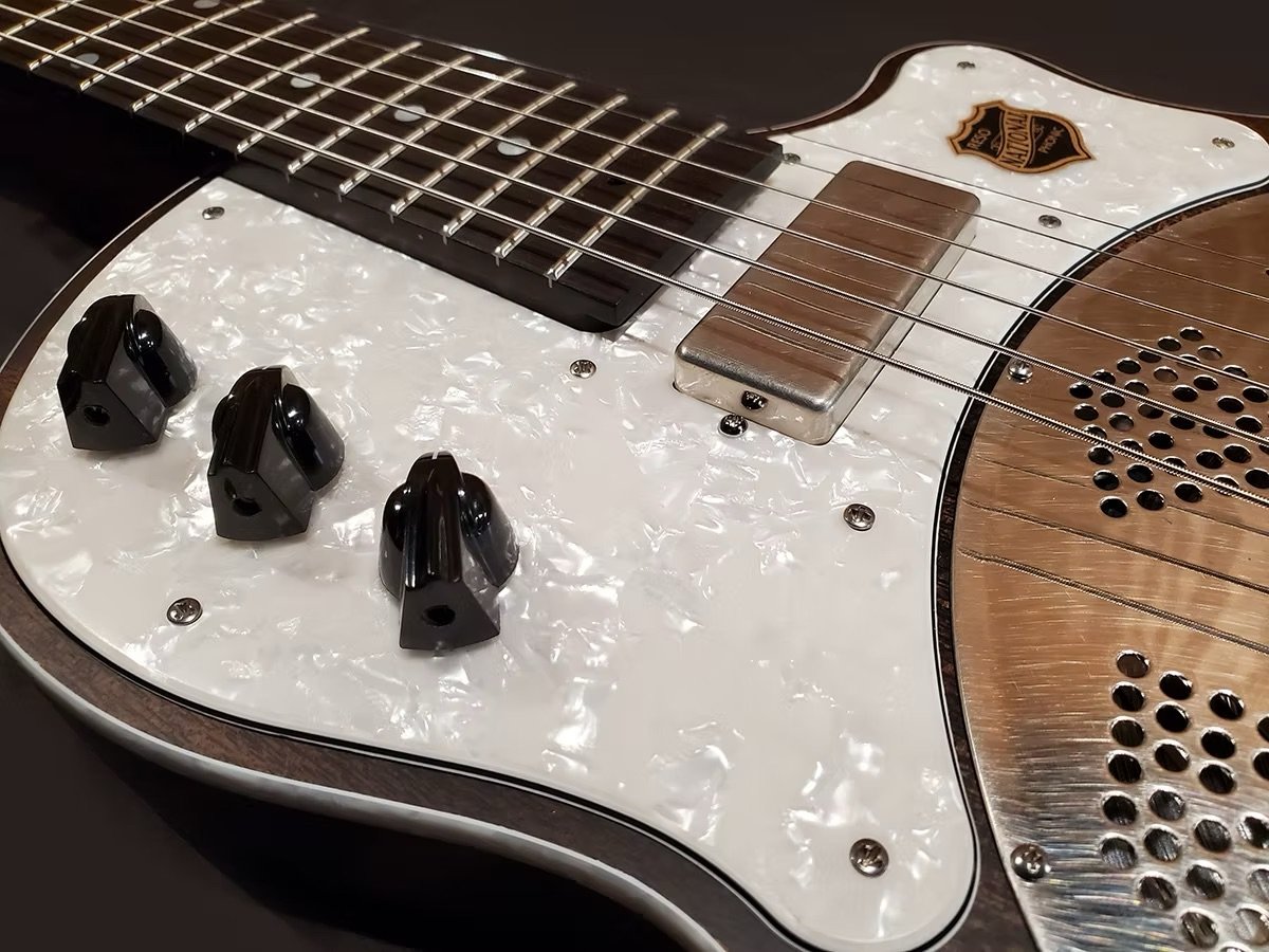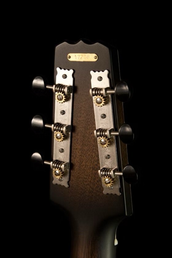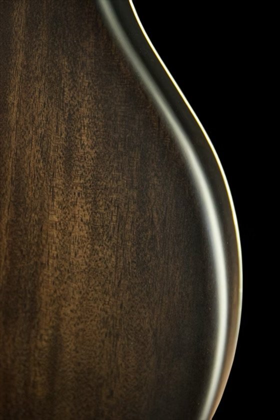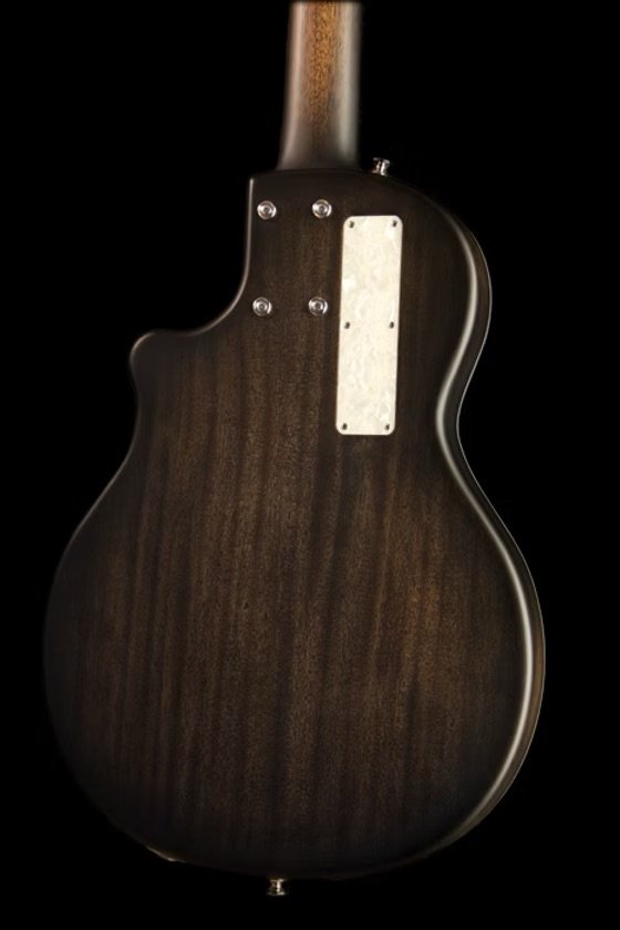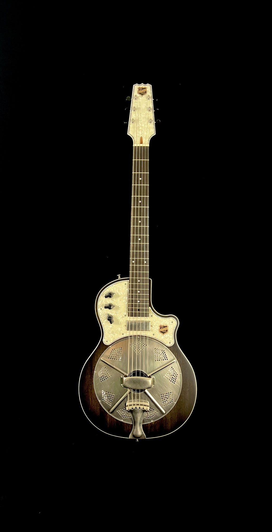 Our Resolectric features a Lollar Firebird pickup in the neck position with a Fishman Nashville Series pickup at the bridge. The onboard preamp allows for smooth blending between the two. The solid mahogany body is capped with an ivoroid-bound, figured maple top. The neck clears 14 frets to the body and has an ebony fingerboard and mother-of-pearl position markers.