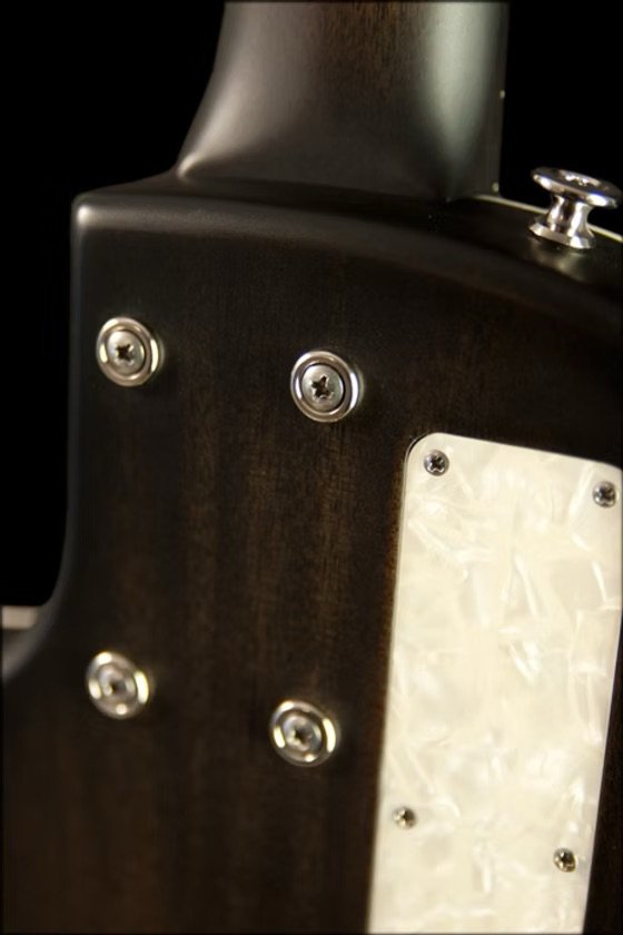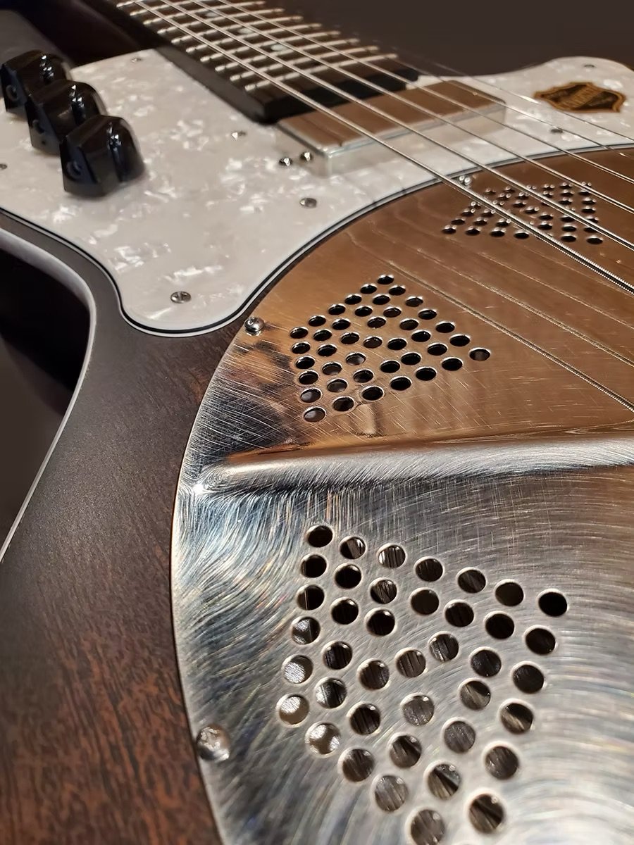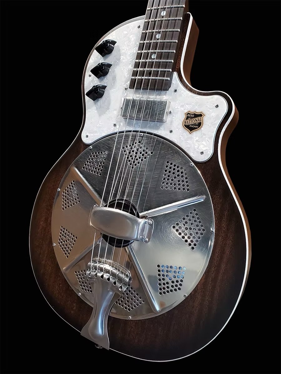 Our Resolectric features a Lollar Firebird pickup in the neck position with a Fishman Nashville Series pickup at the bridge. The onboard preamp allows for smooth blending between the two. The solid mahogany body is capped with an ivoroid-bound, figured maple top. The neck clears 14 frets to the body and has an ebony fingerboard and mother-of-pearl position markers.