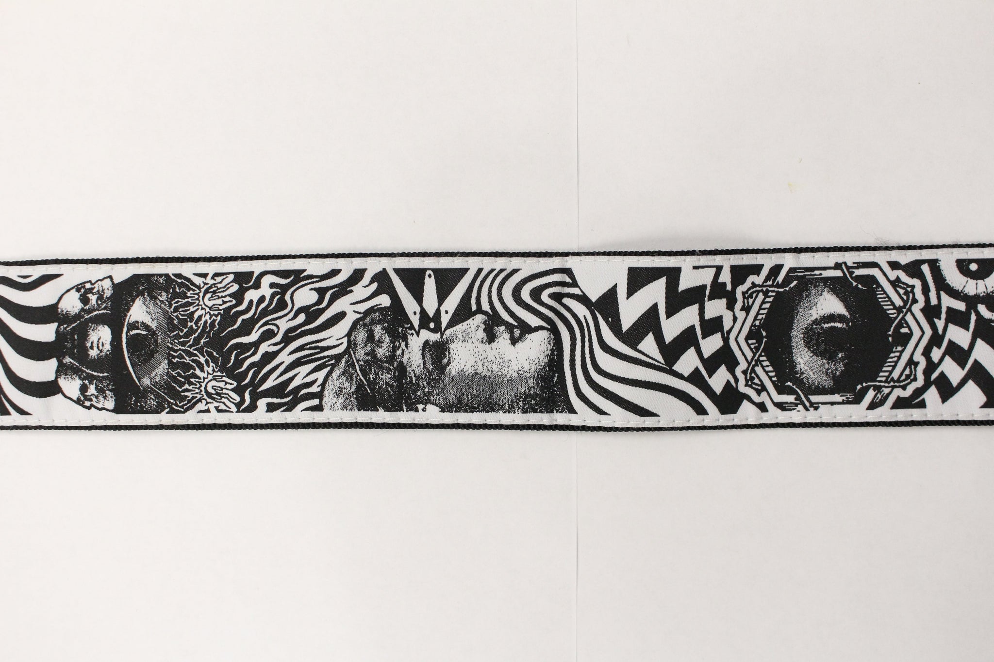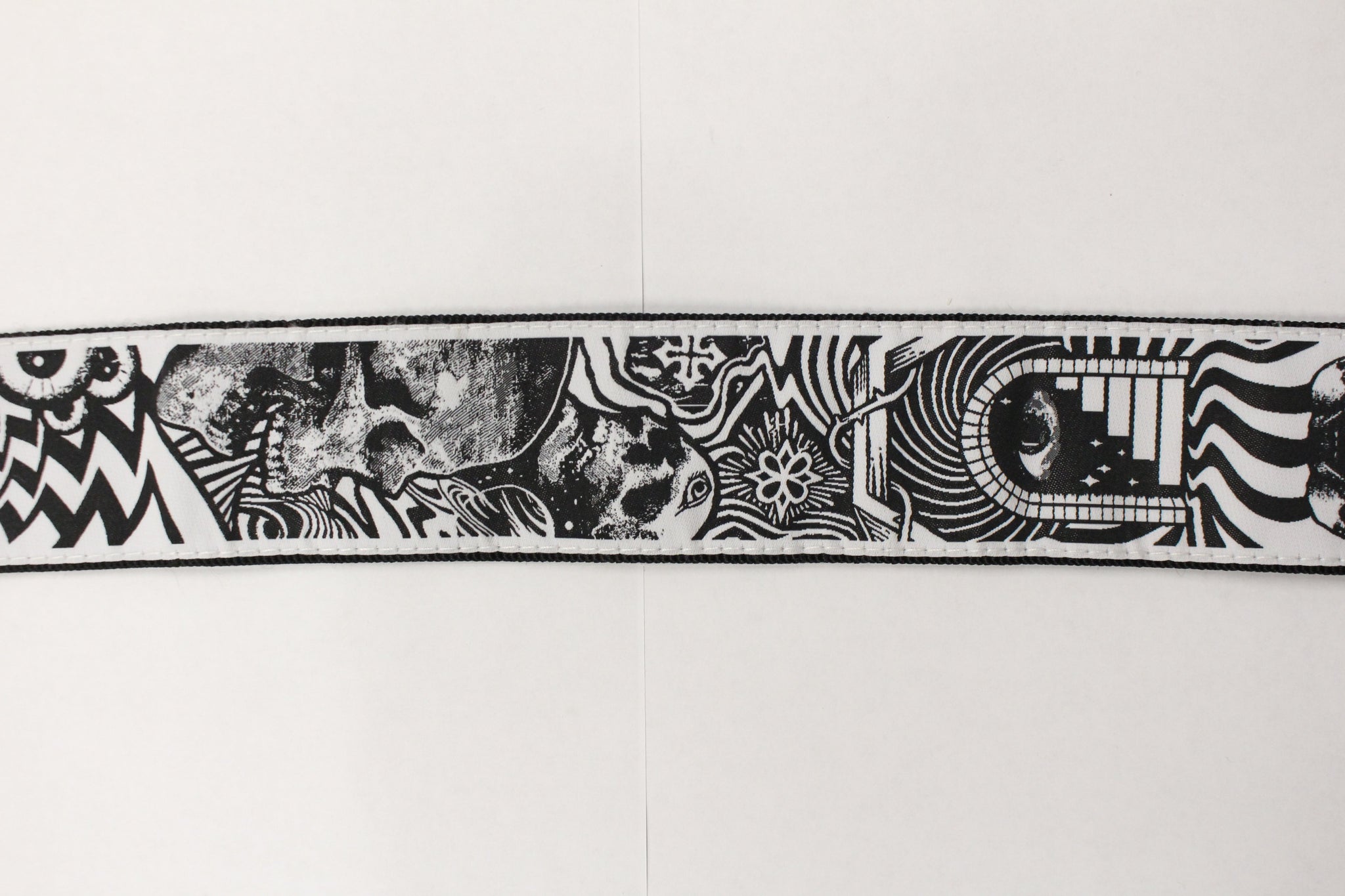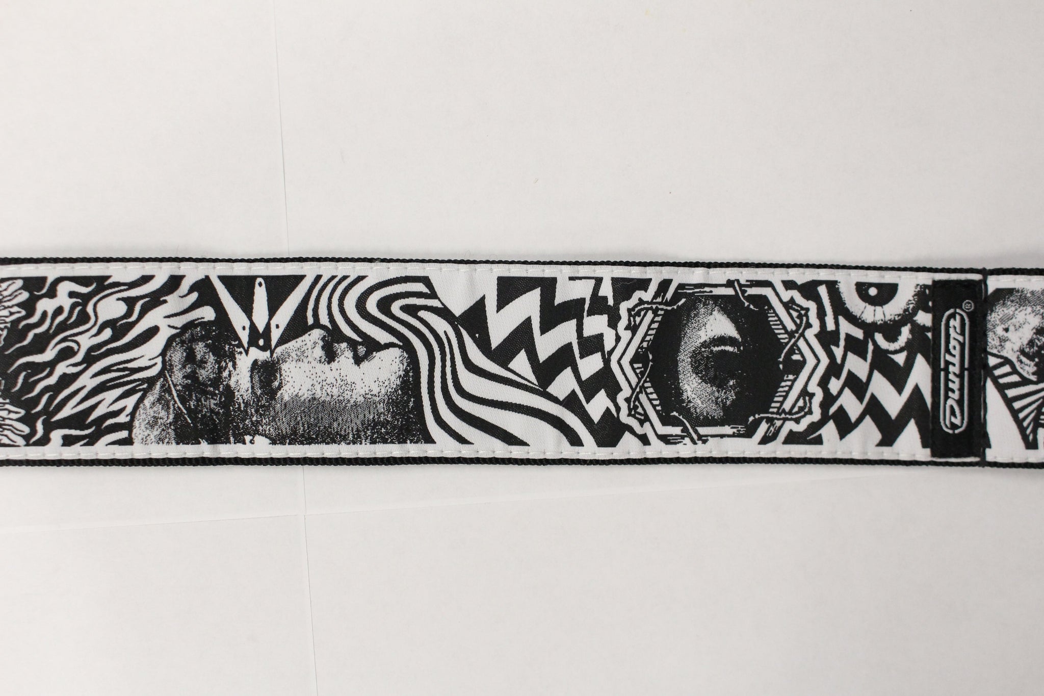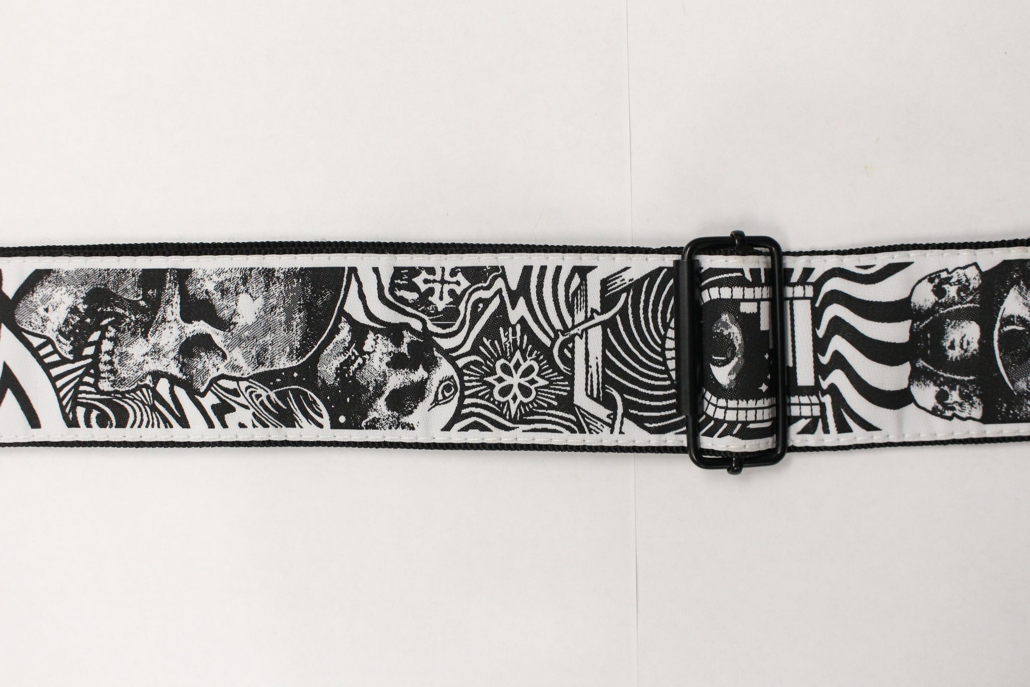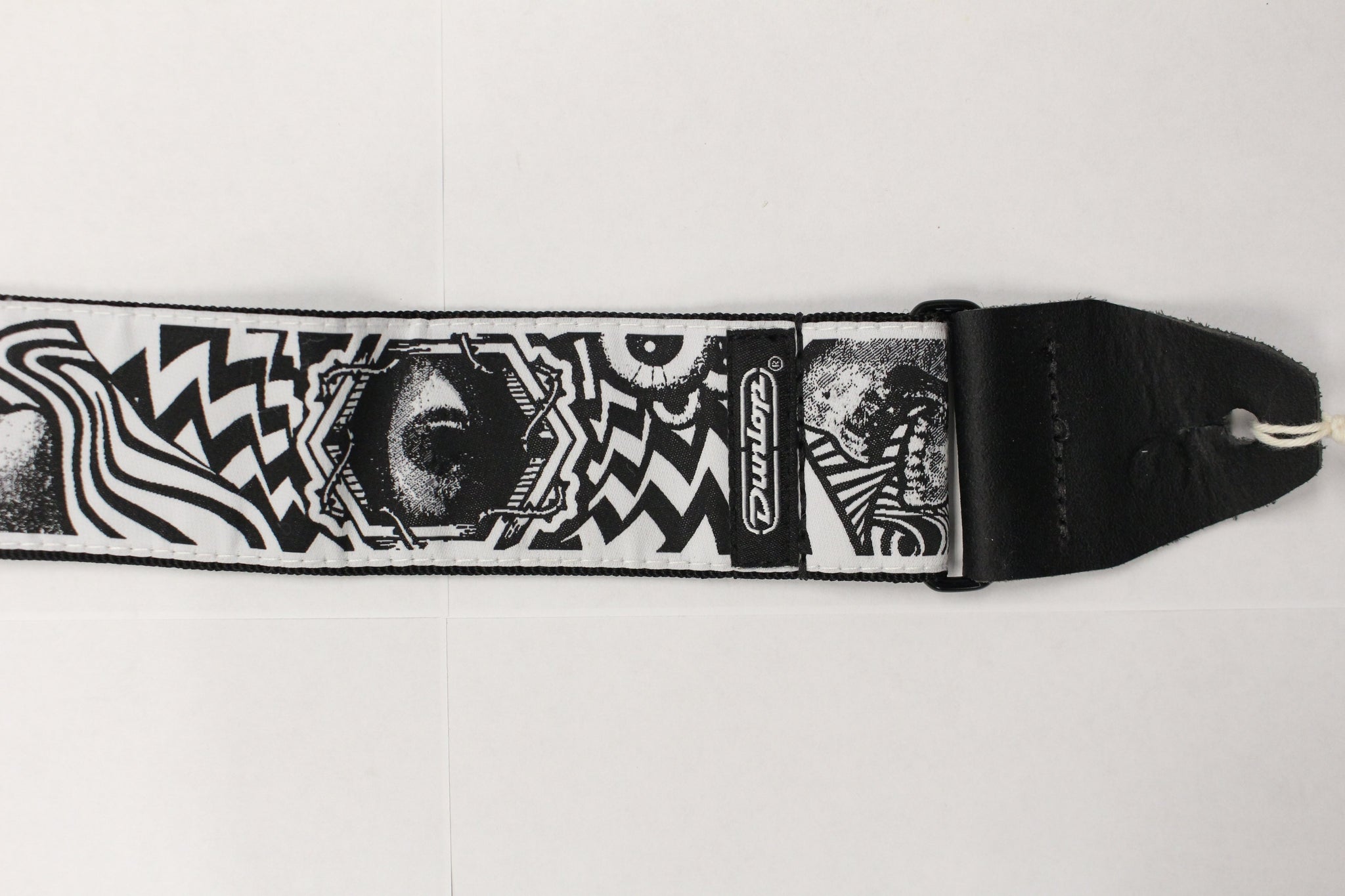 This is a Dunlop strap with skulls, eyeballs, a women's face, and flames on it. The pattern is on both sides of the strap. It is black and white. It is clean and in great condition.