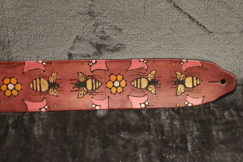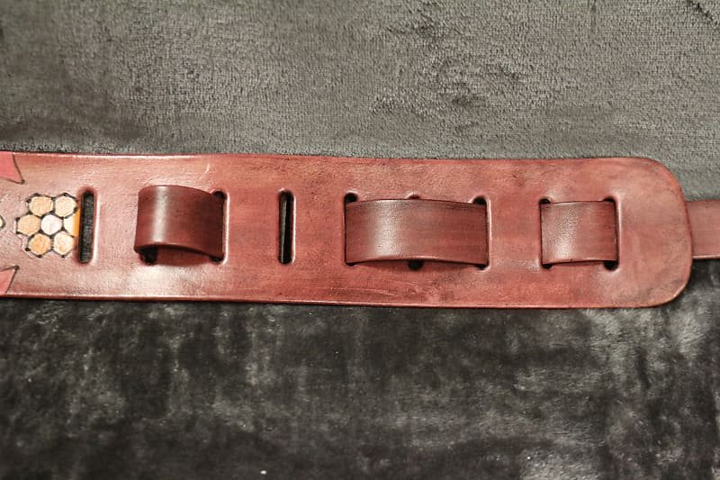 Radiant patterns of flowers, honeycomb and bees create the design for the handmade leather Meadow Guitar Strap. The warm colors bring life and energy to the pattern.