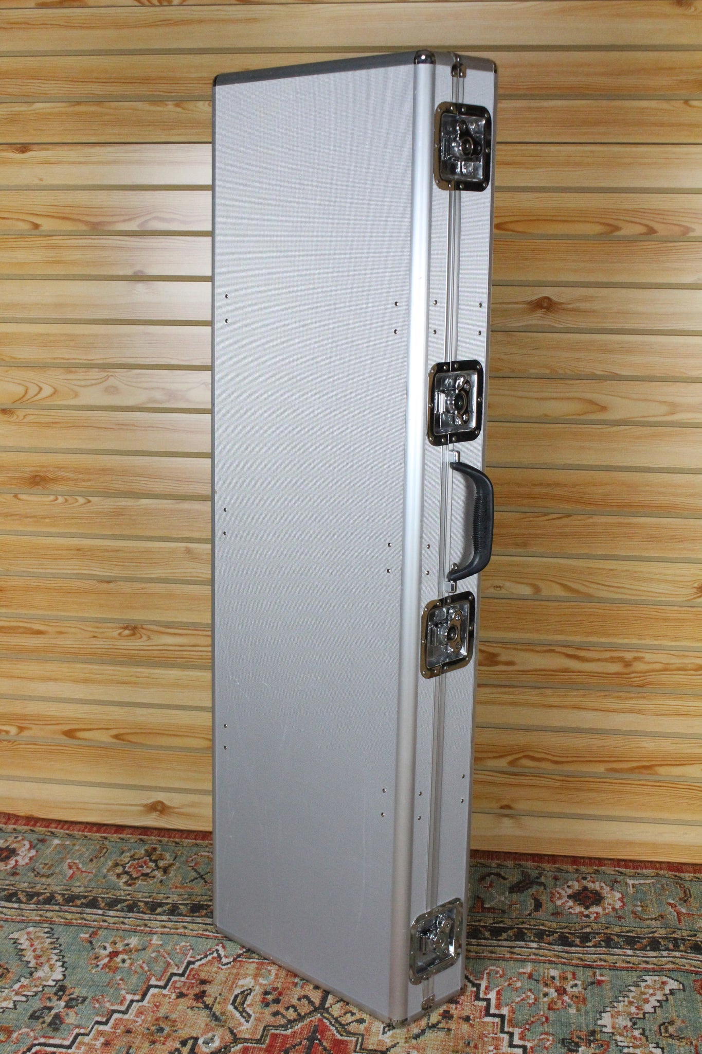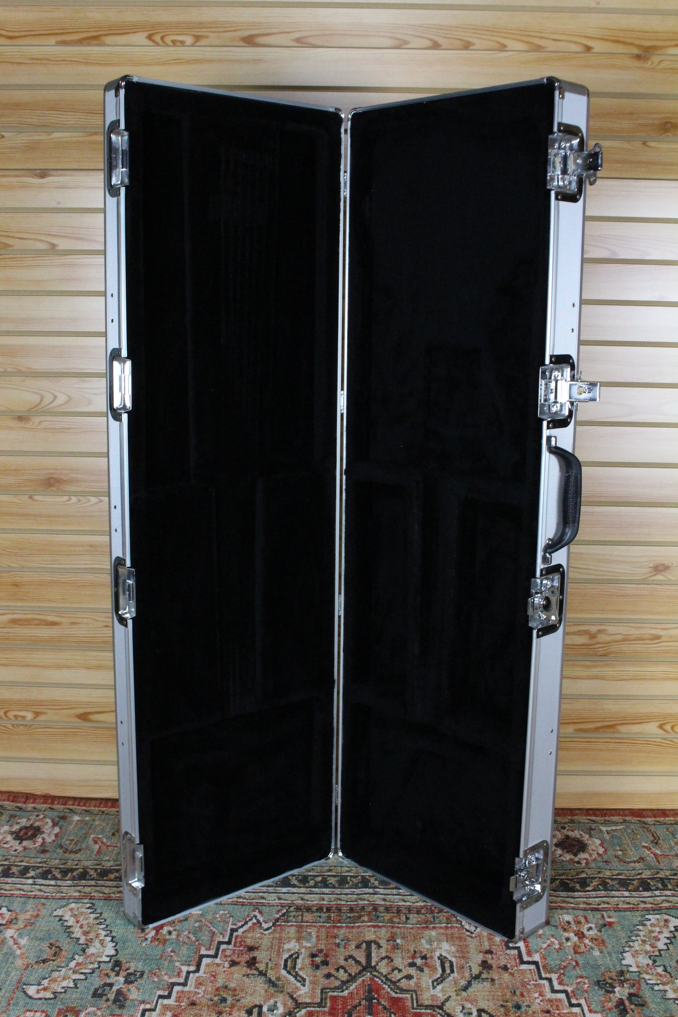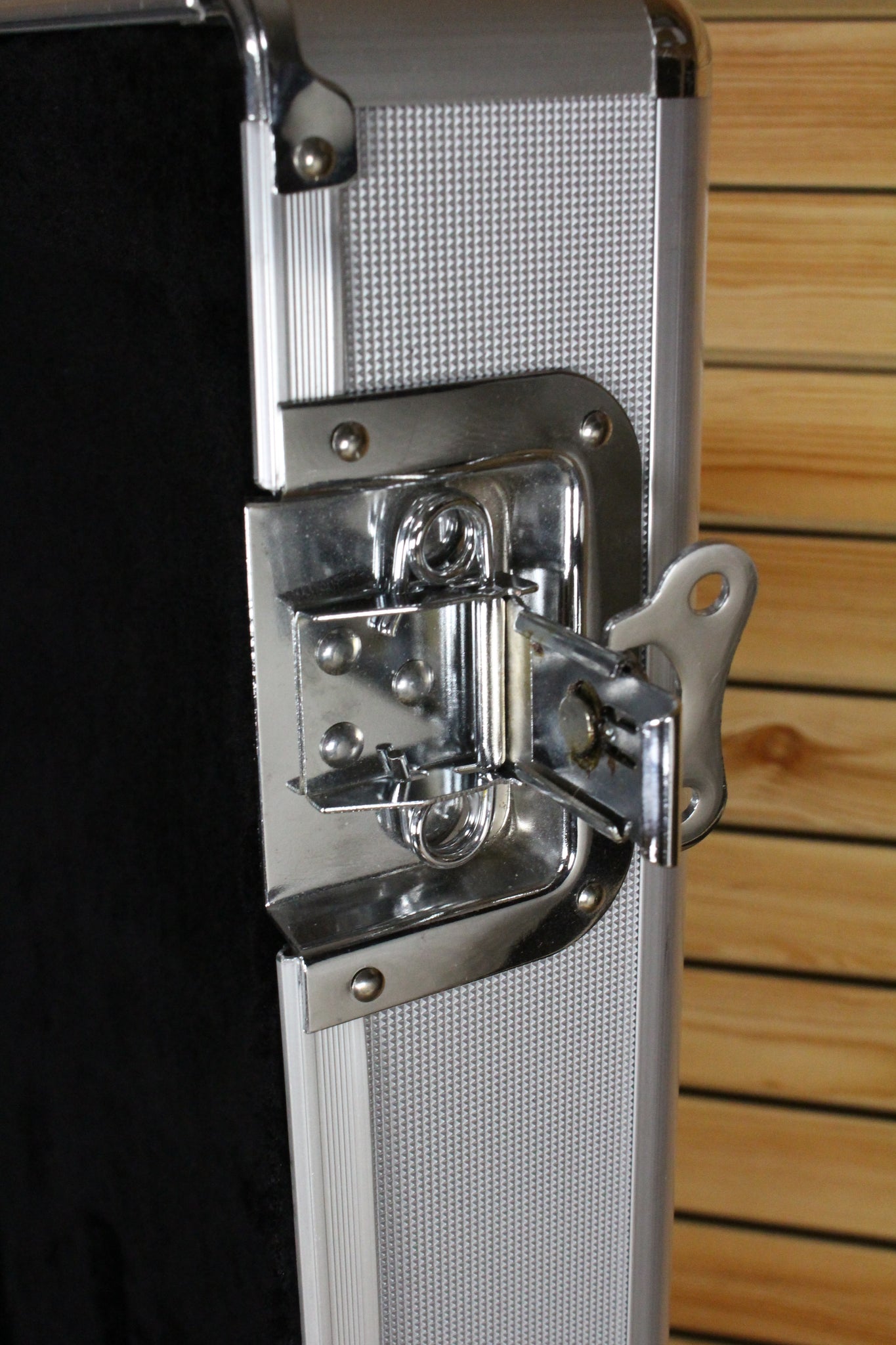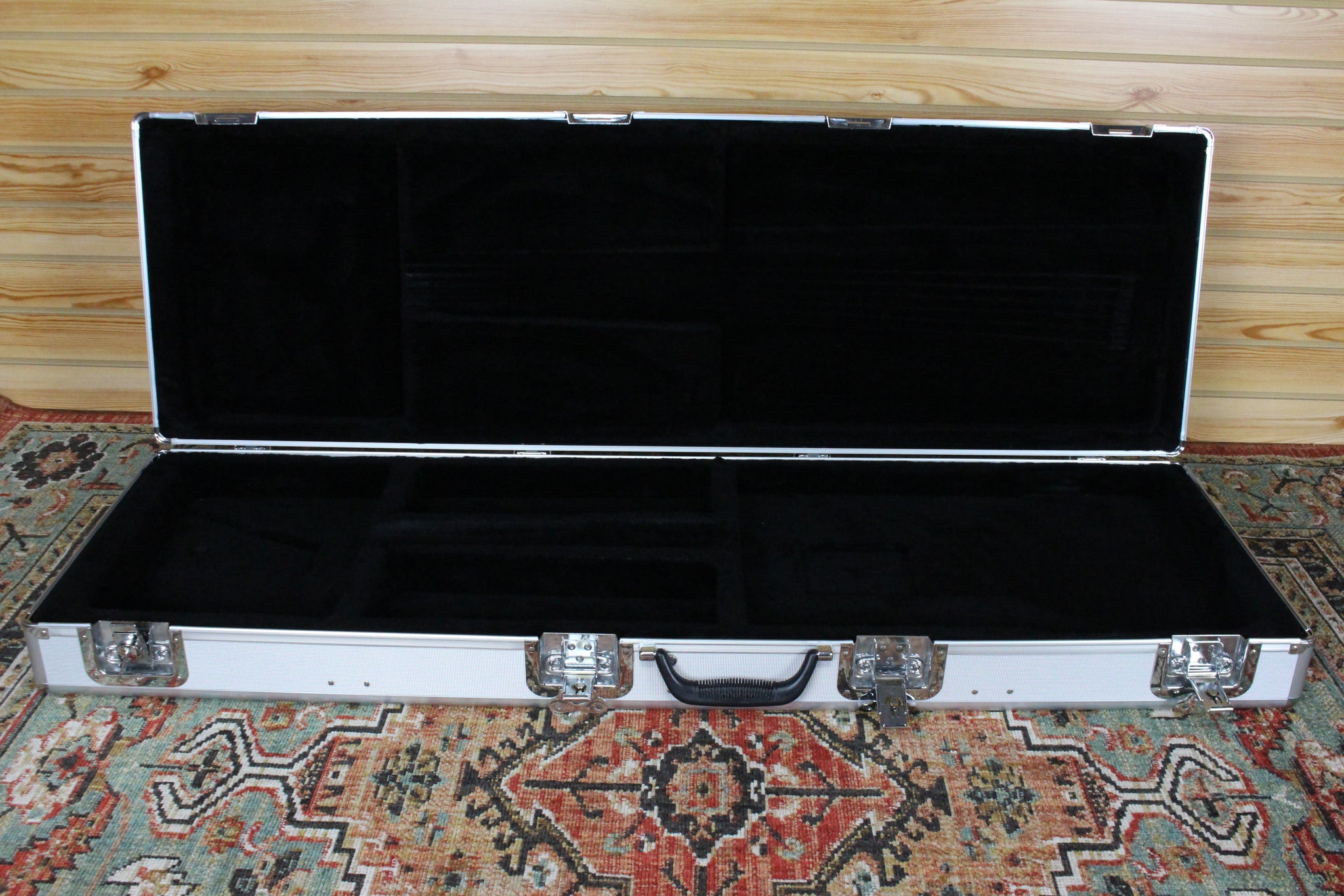 Unbranded metal flight case for a solid body electric guitar. Latches are sturdy and work as intended.