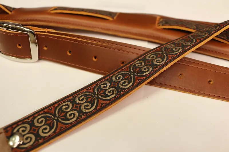 Our take on the vintage Bobby Lee strap with a few upgrades. The leather pad is backed with suede for a solid grip and is extended to cradle both sides of your shoulder. Packed with shock absorbing rubber inlay that reduces discomfort with heavy instruments. Each strap can be worn with or without the belted tail extender. Leather wears beautifully as it ages. Enjoy.
