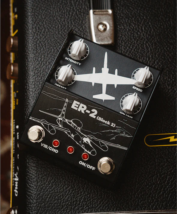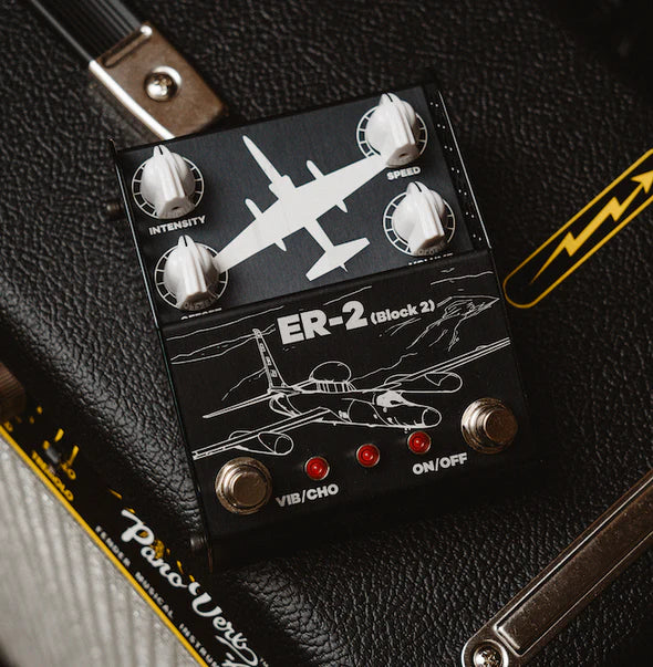 When you design a pedal, it can take years to get it into production and because of the march of time you can be blindsided by a sudden obsolescence issue with parts. The ER-2 suffered this fate, in these circumstances you can either retire the pedal or you can take the opportunity to redesign and improve the pedal… we opted for the latter. So, ER-2 Block 2 was born. Block 2 refers to the iterative process of improvement that aircraft go through during their service life. In this case, the ER-2 Block 2 has at its heart our same innovative take on the Univibe circuit but with a much-reduced current requirement so that it is more compatible with a larger variety of power supplies. The noise floor is just as low as it was before but the ability for the ER-2 Block 2 to absorb and relish aggressive fuzz and overdrive levels is greatly increased.ER-2 Block 2 is the same as ER-2 but improved where it counts, and to go with its improvements it is furnished with a new art design.