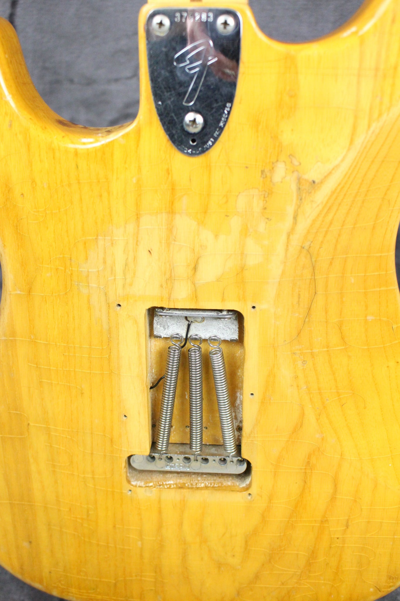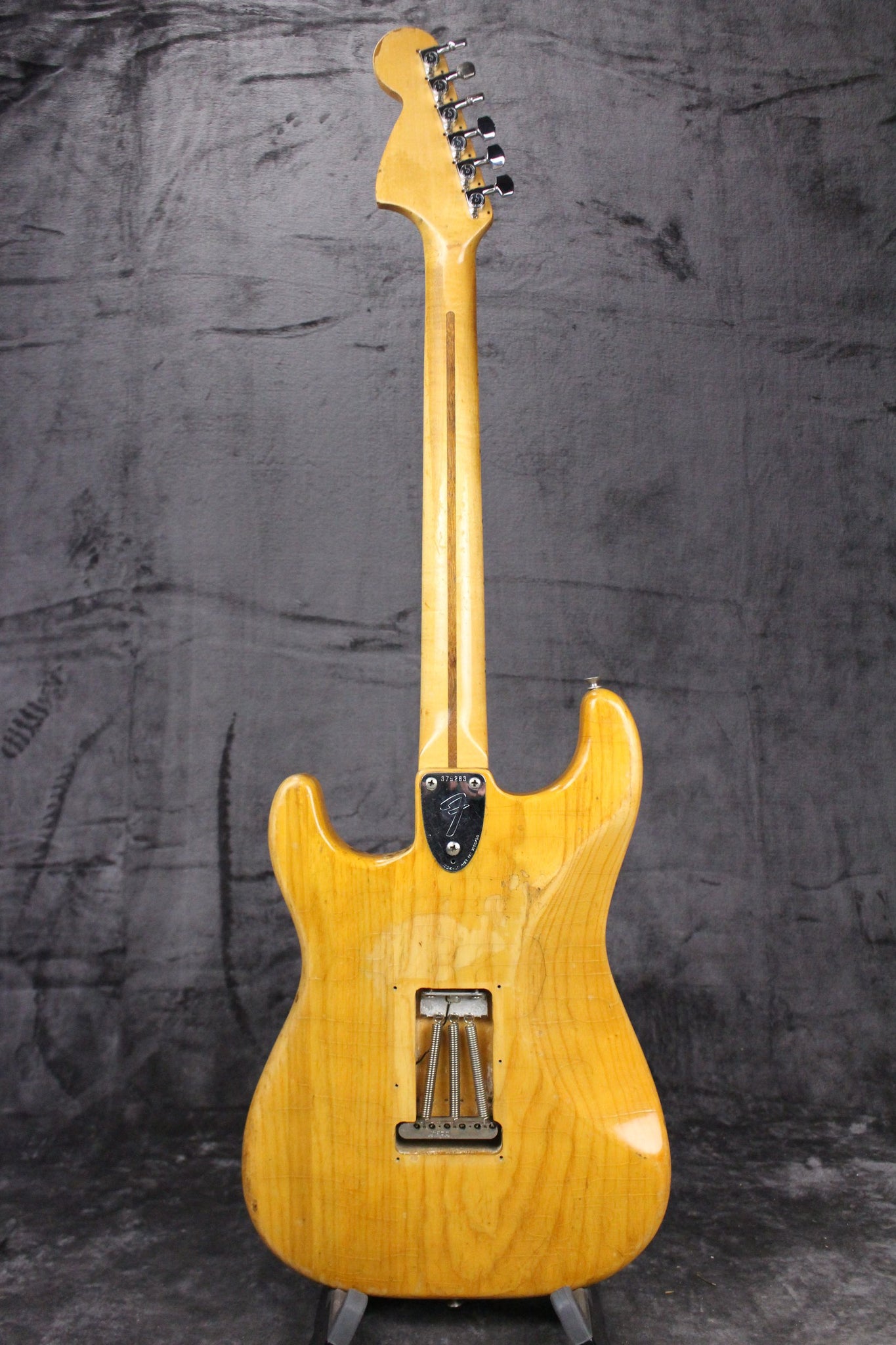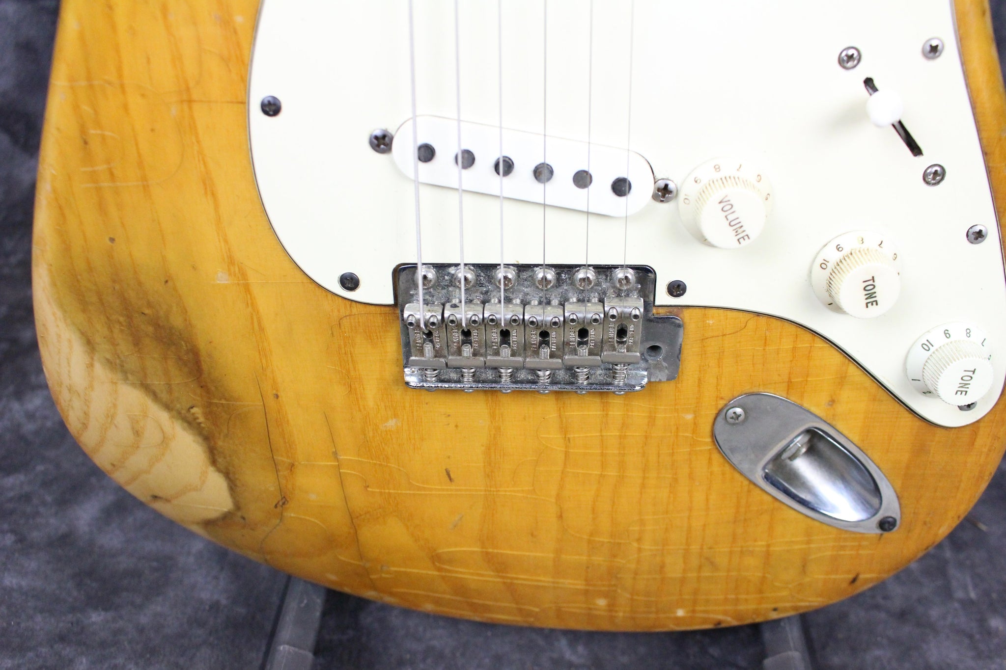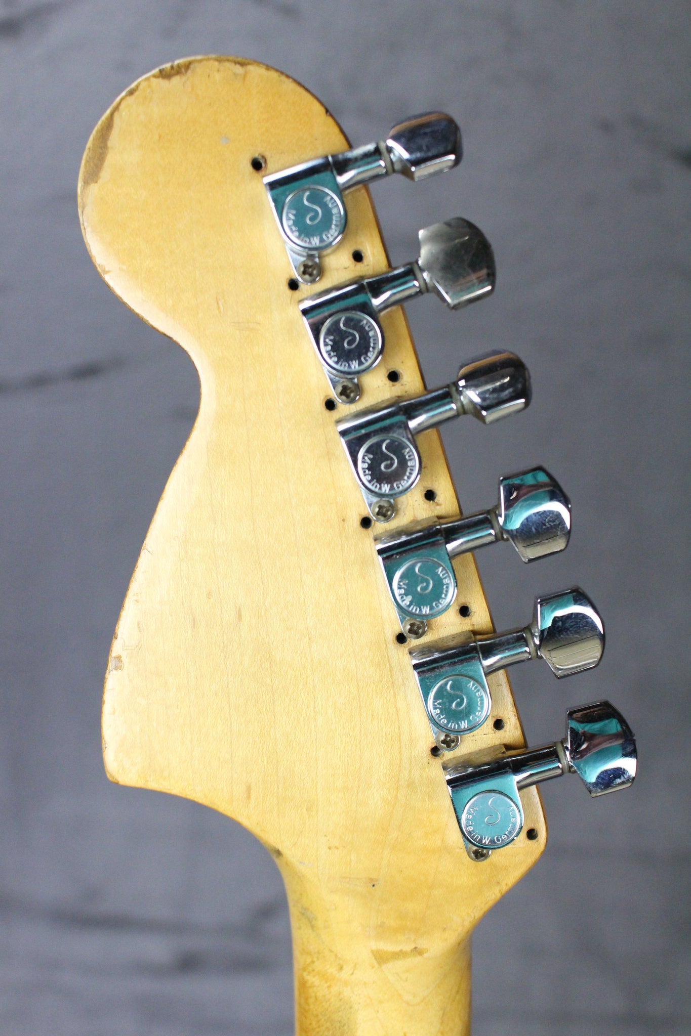 Modifications: The tuning keys have been replaced with Schaller tuning keys. You can see the original holes on the backside of the headstock. The back plate is missing.