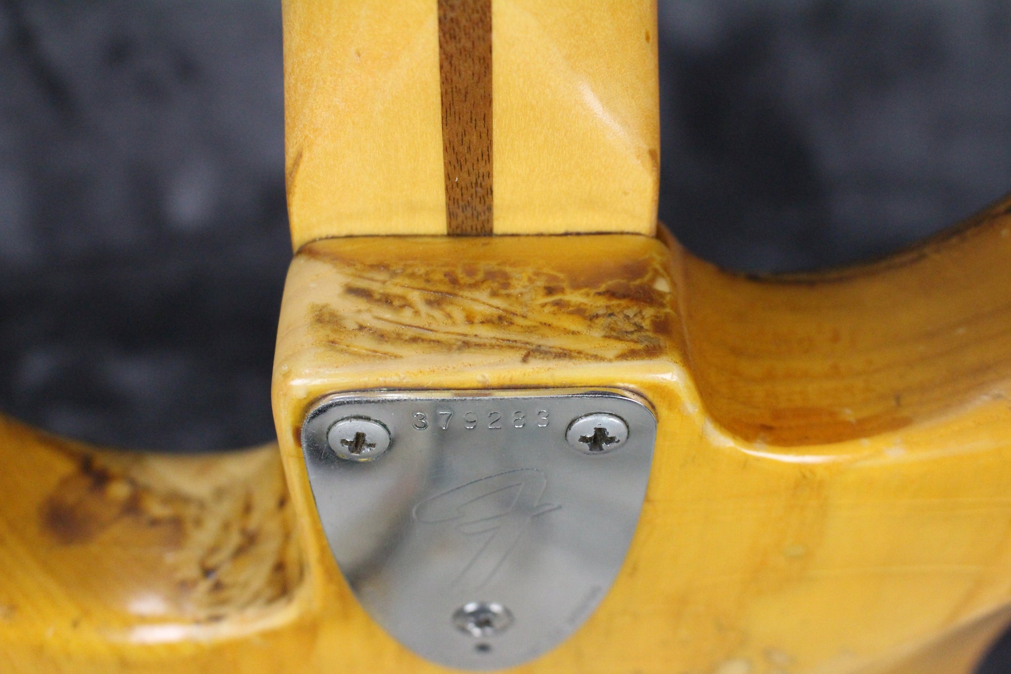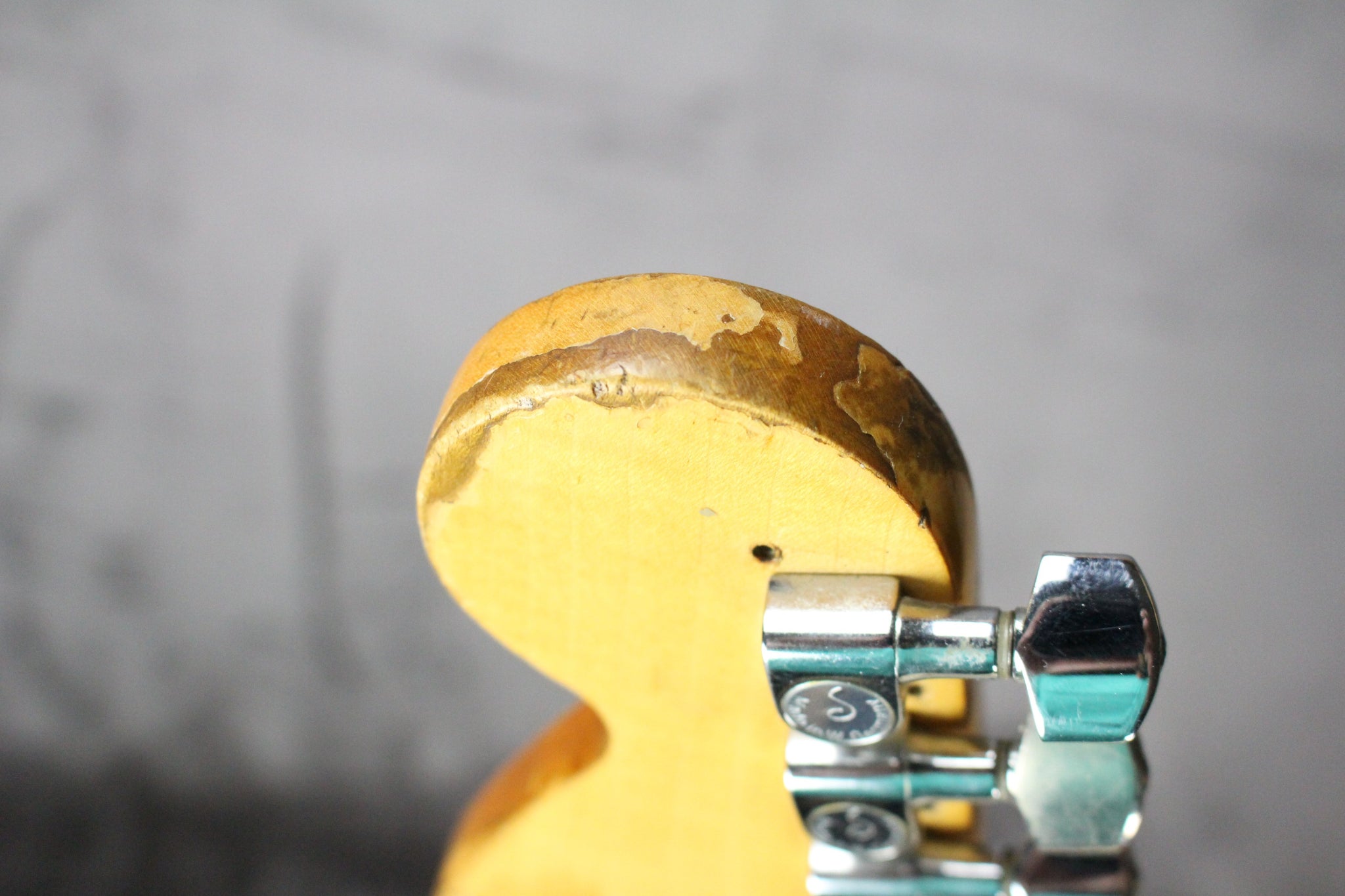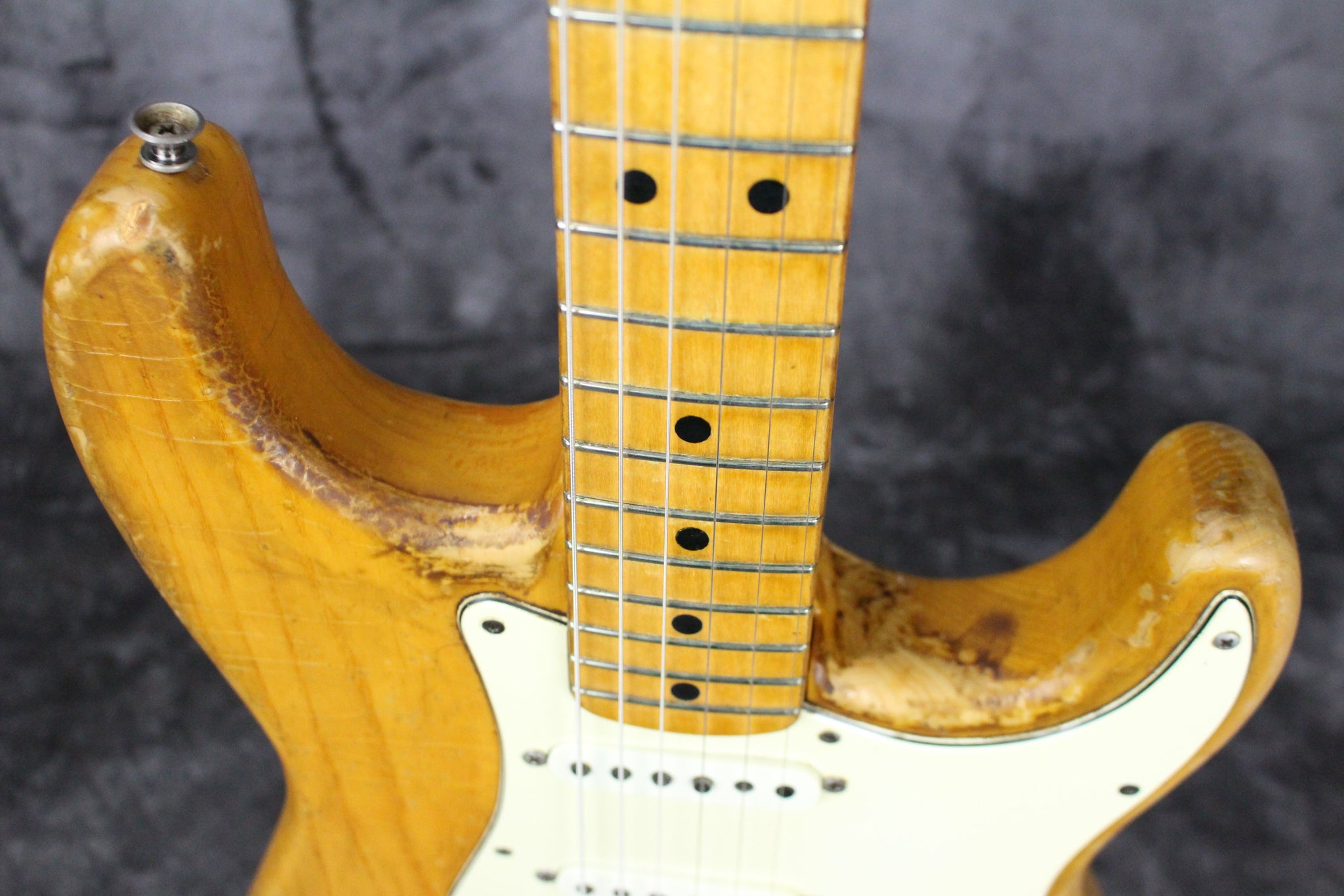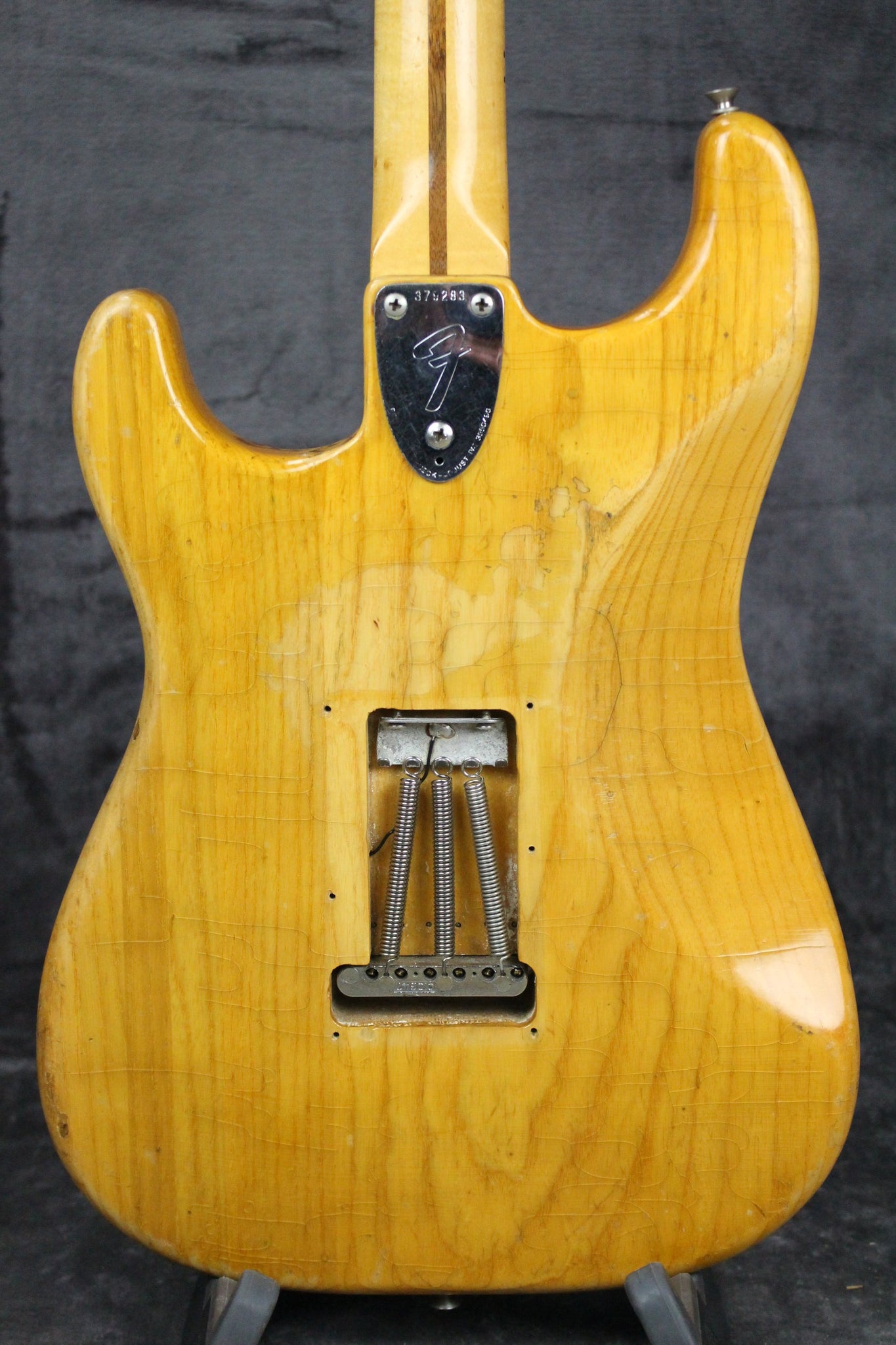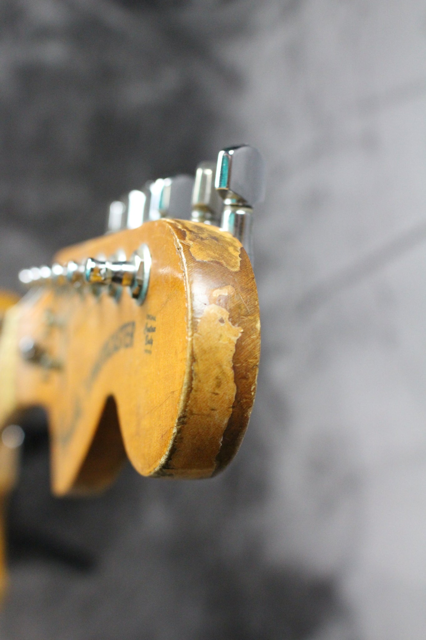 Modifications: The tuning keys have been replaced with Schaller tuning keys. You can see the original holes on the backside of the headstock. The back plate is missing.