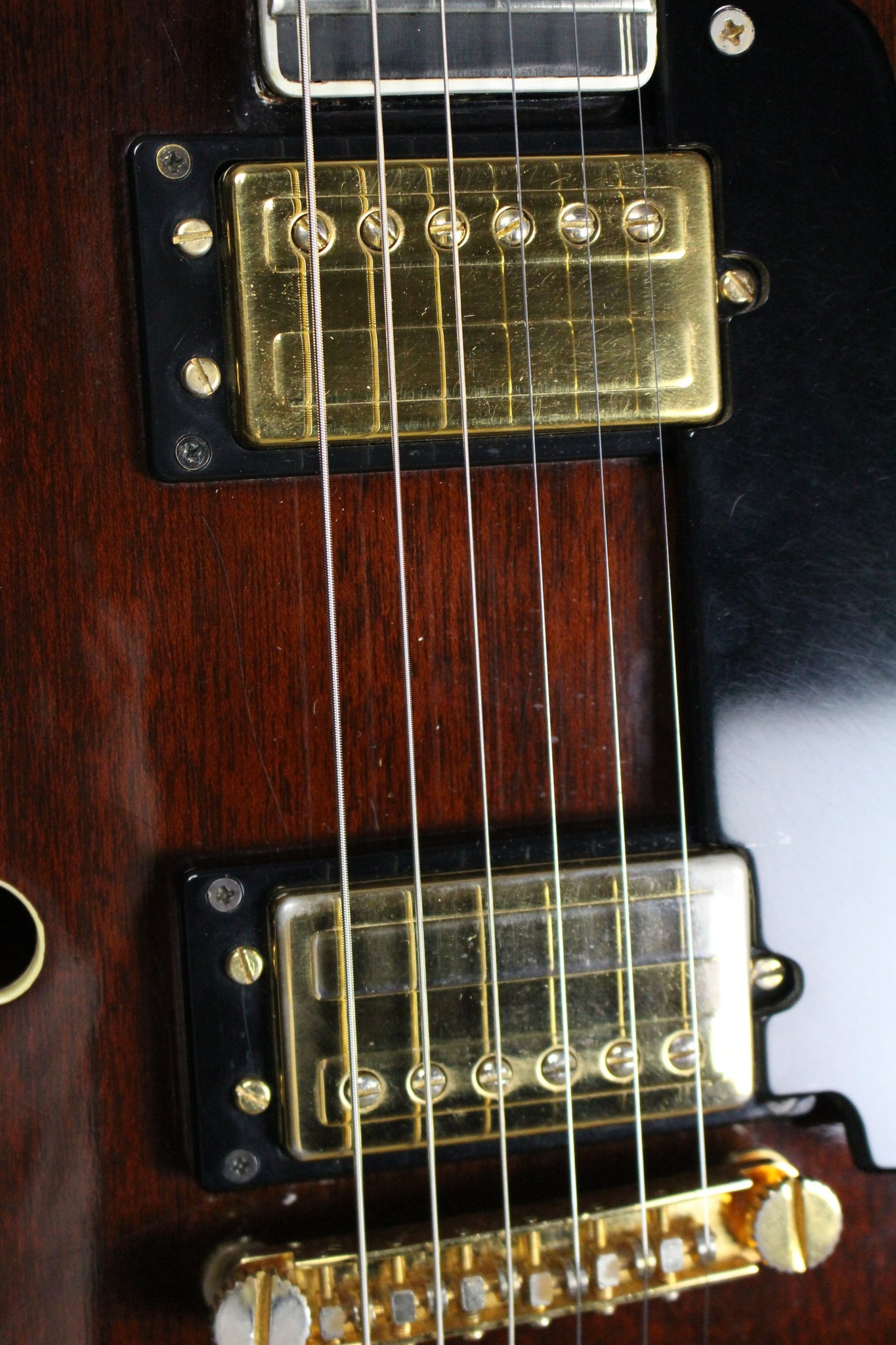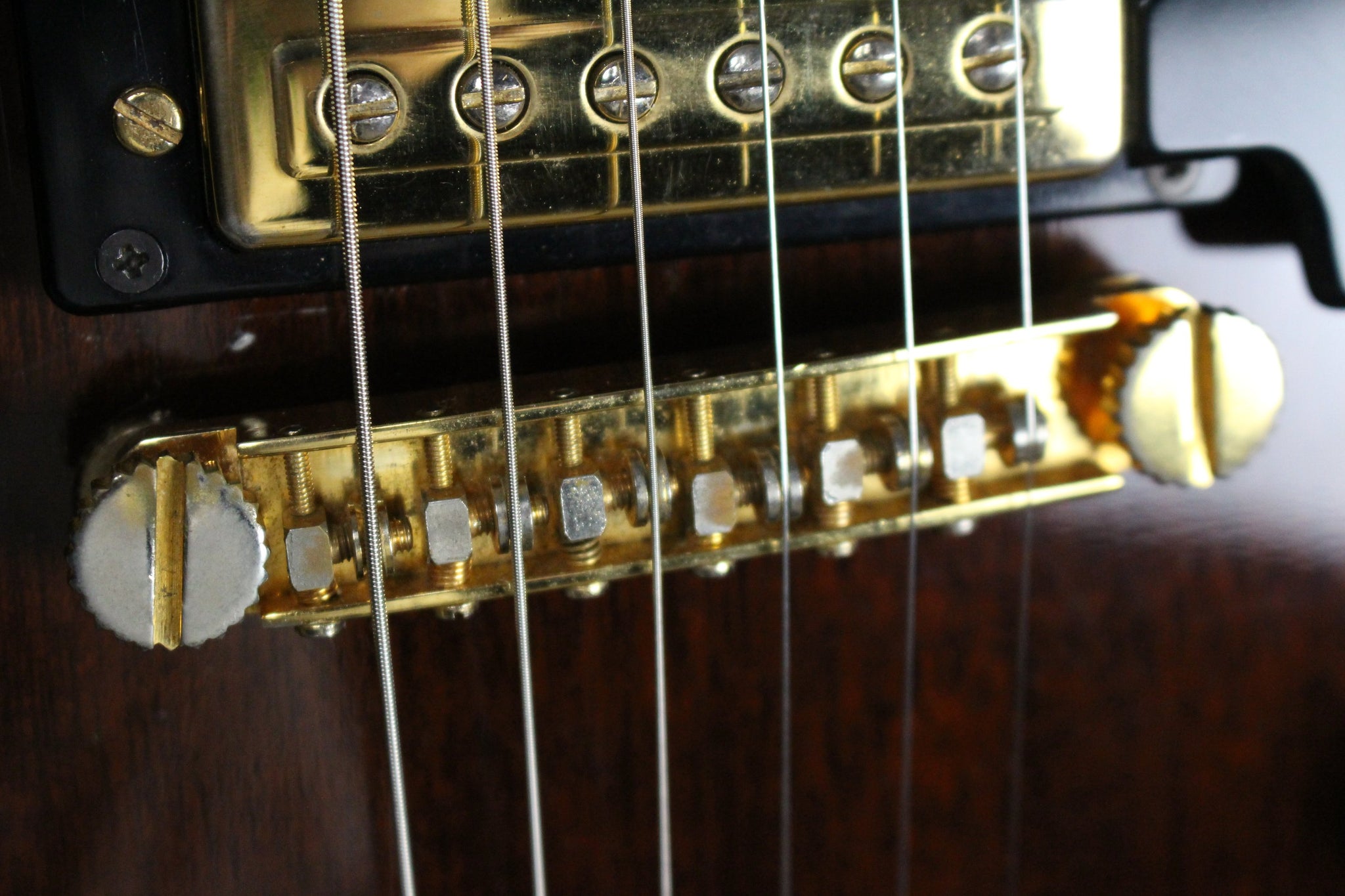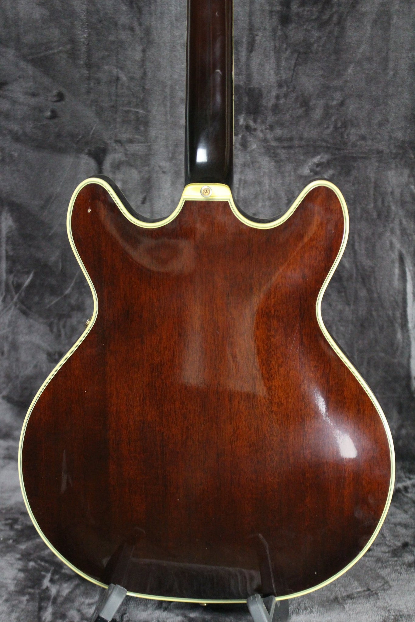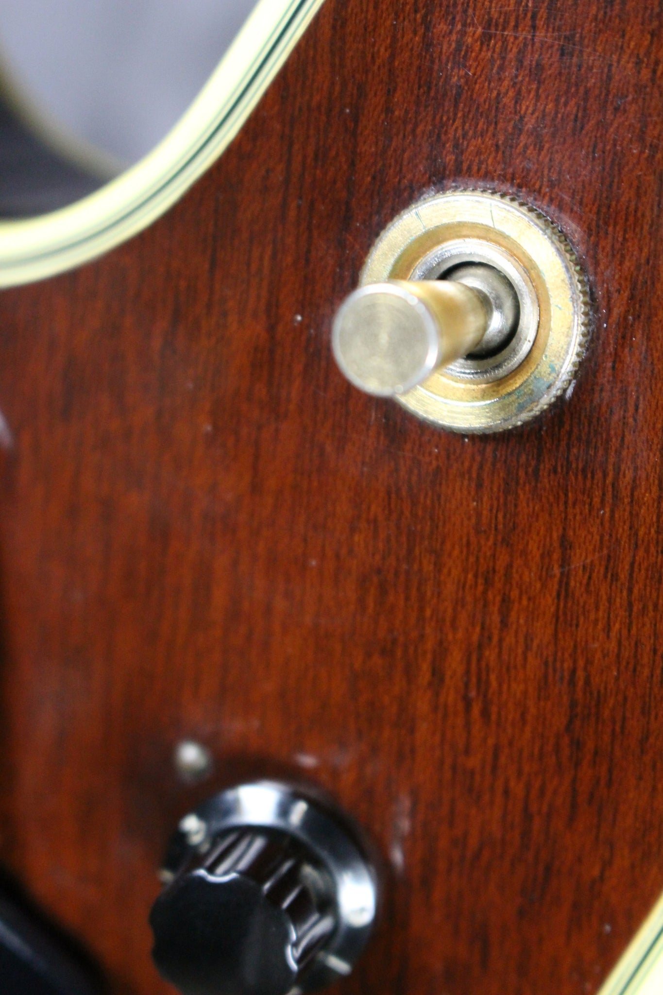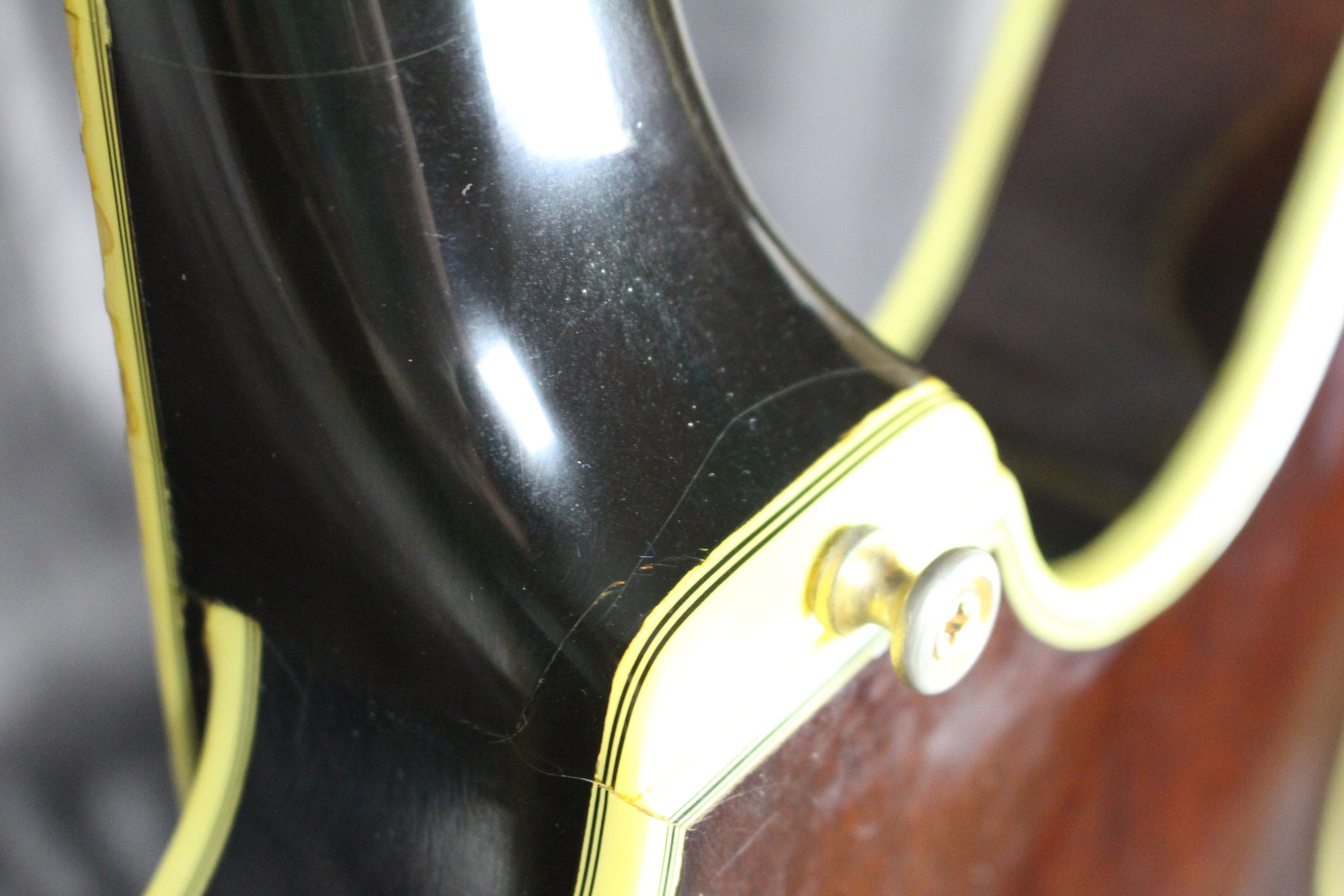 Cosmetics: This guitar has wear that is consistent with a vintage guitar from the early ‘70s. The gold hardware has tarnished a bit. The Walnut finish has some light checking on the body. The finish on the binding around the fingerboard has worn off and the binding has started to crack in areas. The back of the neck also has light finish checking. This guitar has some light dings and dents and surface scratches throughout. There is light finish checking around the input jack. Overall, this guitar is in great shape and plays and sounds fantastic.