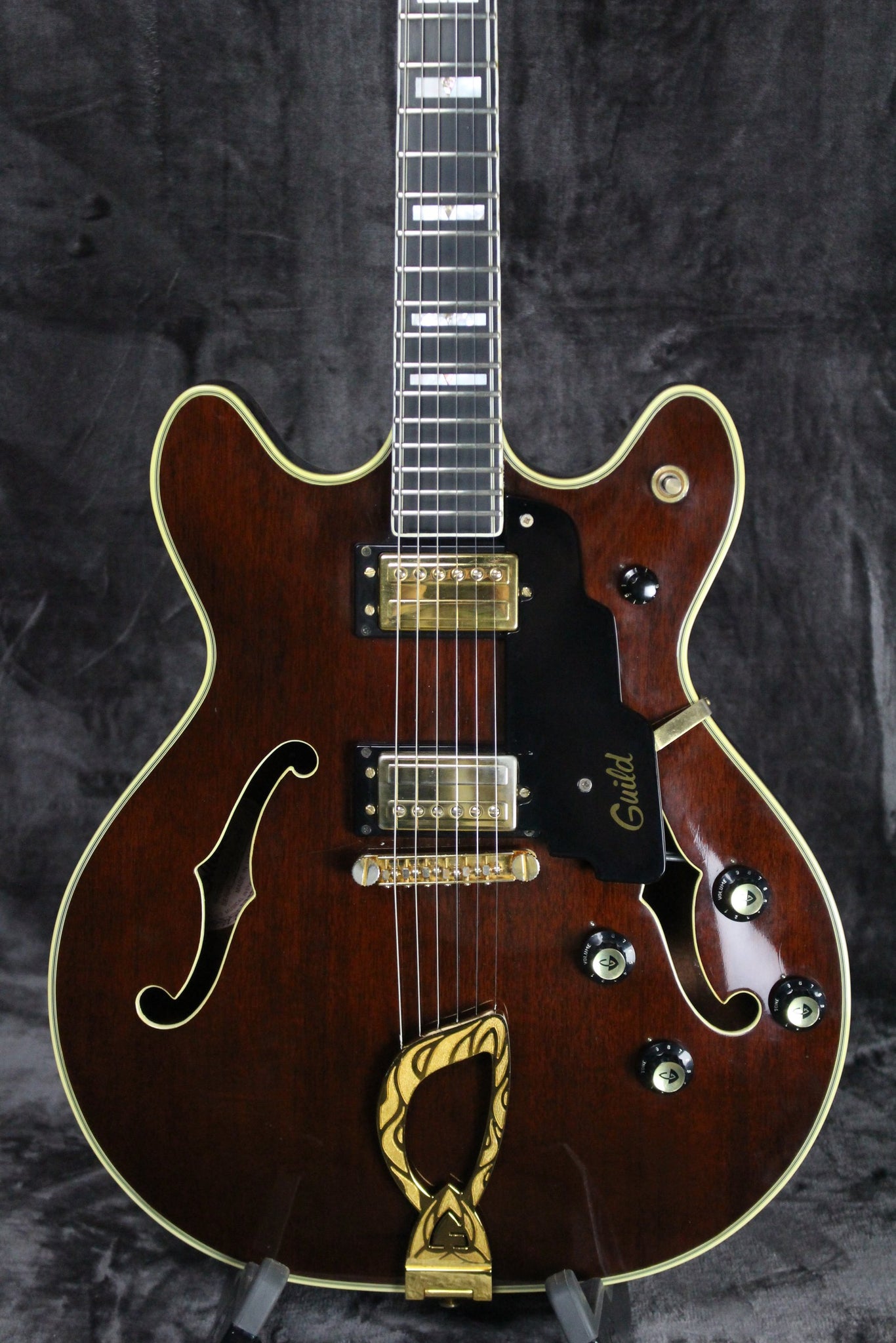 Summary: Featuring Guild’s iconic double-cutaway Starfire body shape, this Starfire VI has a beautiful Walnut finish with a maple top, back, and sides, and a solid center block. Dual humbucker pickups, offer a range of tones well-suited for a variety of playing styles and genres. The Starfire VI has a three-piece maple/walnut/maple neck and a bound ebony fingerboard inlaid with mother-of-pearl and abalone V-blocks. It also features a fully adjustable bridge, and comes adorned with gold hardware, 5-ply black and ivory purfling, deluxe f-hole and body binding, and a Guild harp Tailpiece.