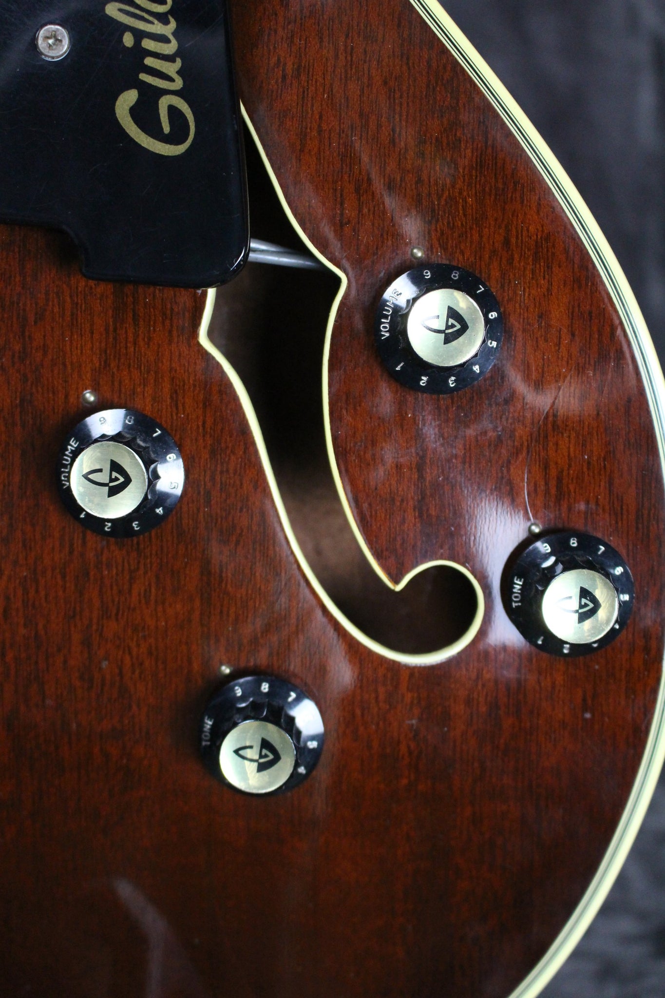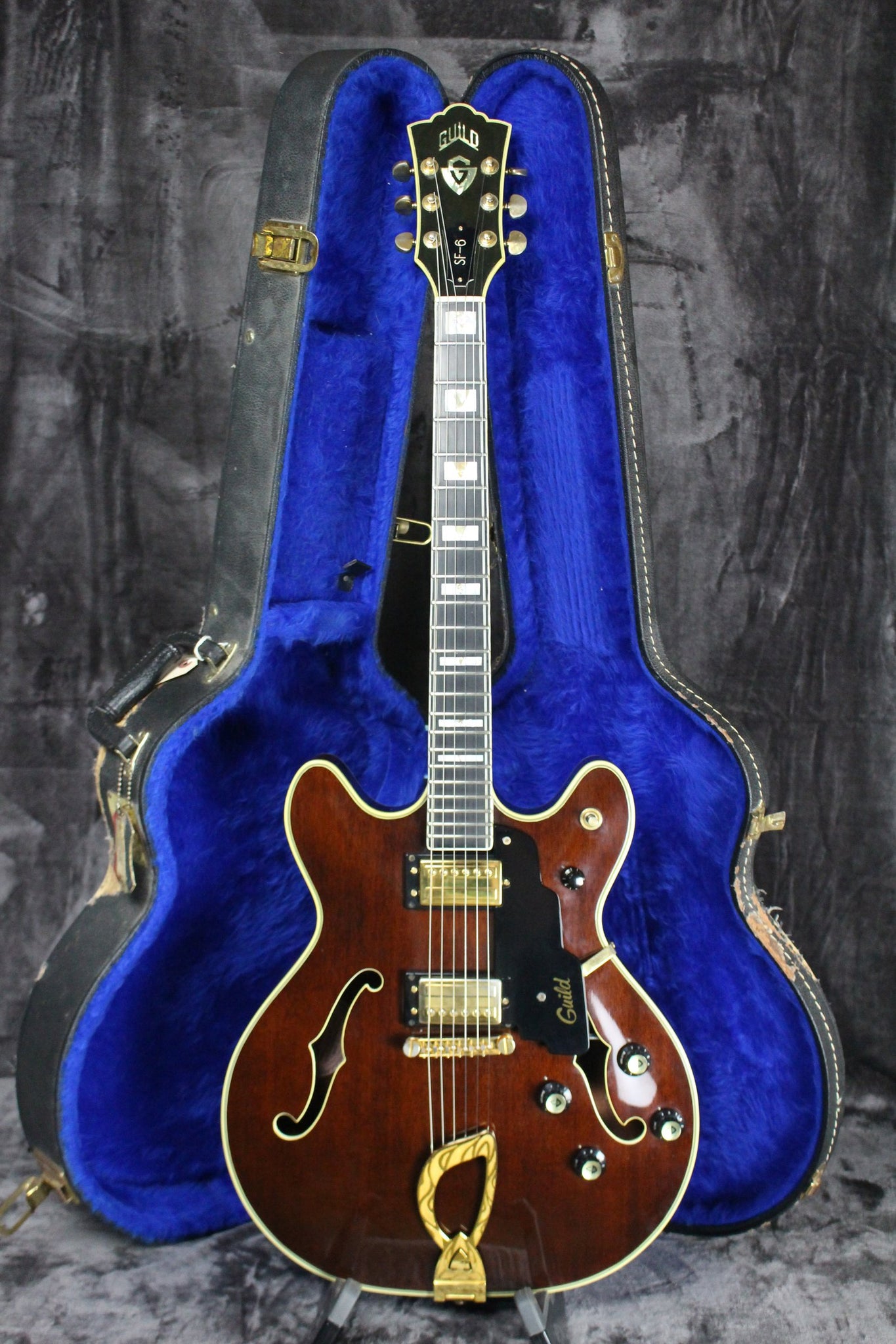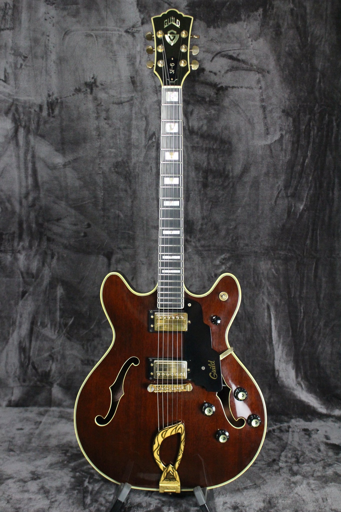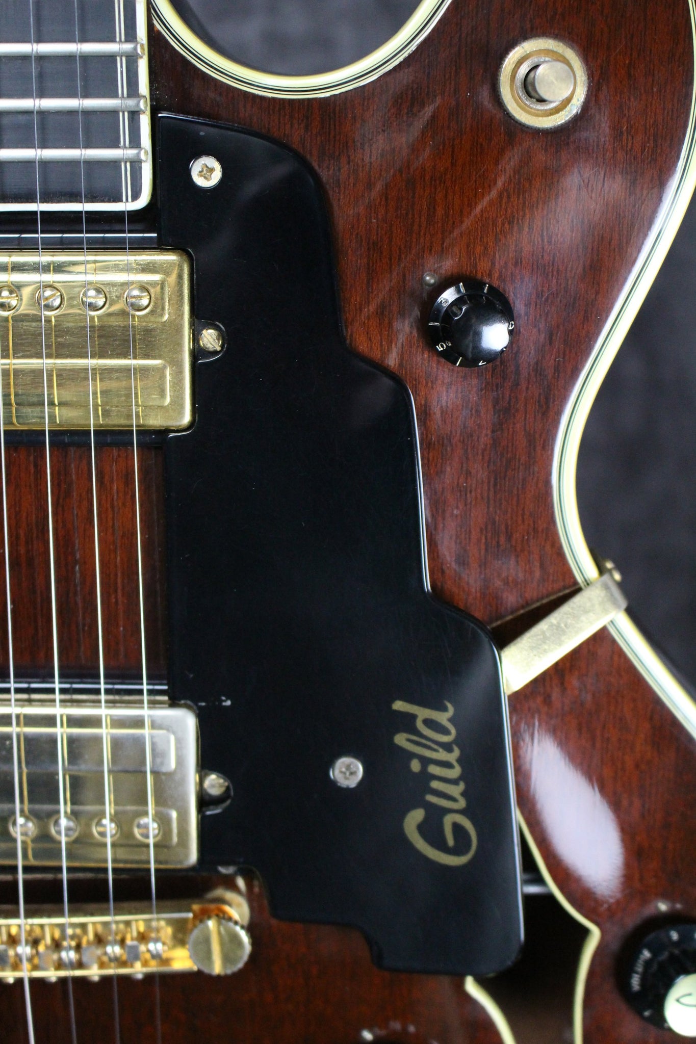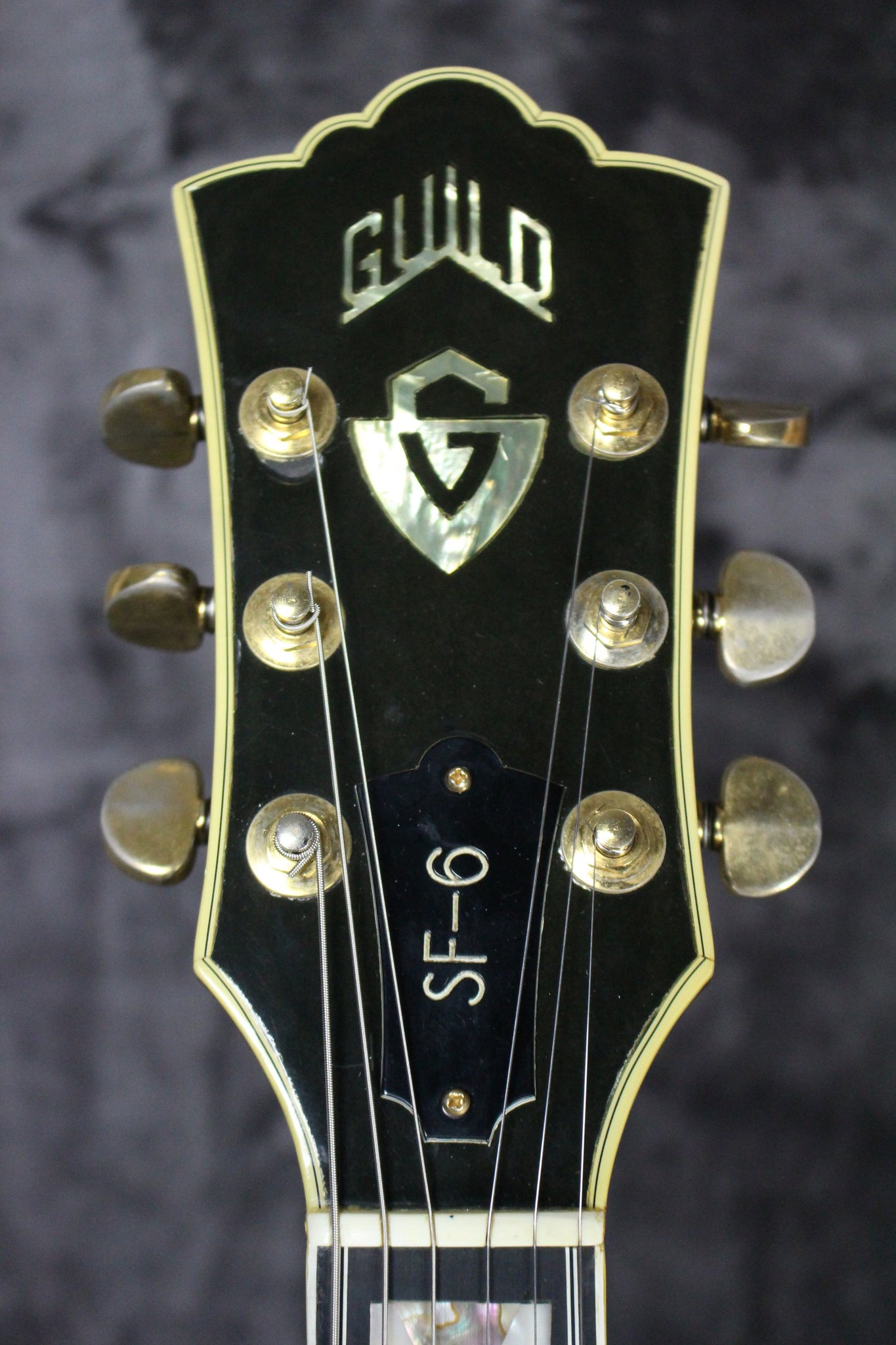 Pickups/Hardware: Dual Guild humbuckers, Grover tuning keys, fully adjustable bridge, black “Guild” pickguard with logo, 2x volume/2x tone controls/master volume/3-way pickup selector (main volume and tone controls wired backwards), Guild “G” harp tailpiece, “SF-6” truss rod cover.