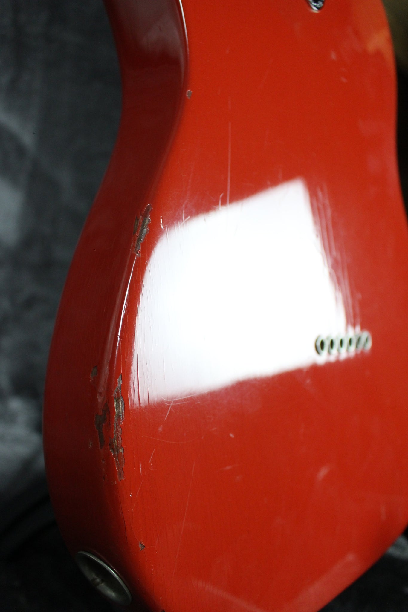 Cosmetics: This guitar is in good shape. It has light surface scratches and small indentations on the body, including some small chips. The back of the neck is clean, and the frets are like new. The back has light buckle rash, and the face of the headstock is showing finish checking and some amount of wear around the edges. Overall, this guitar plays very well and sounds fantastic.