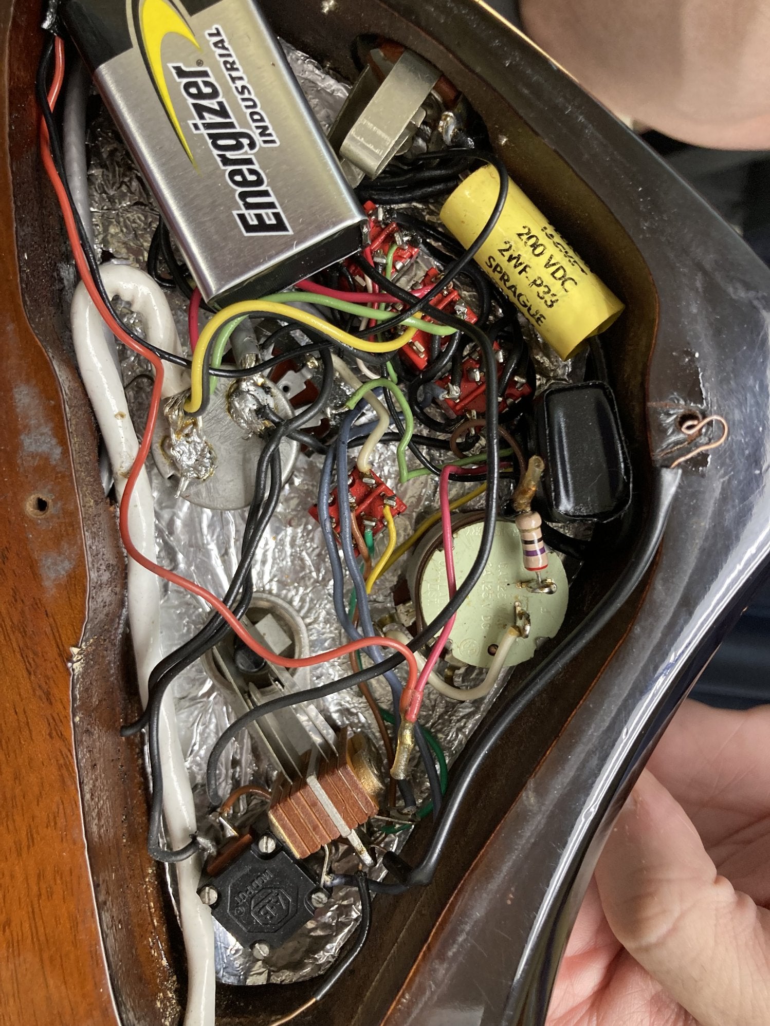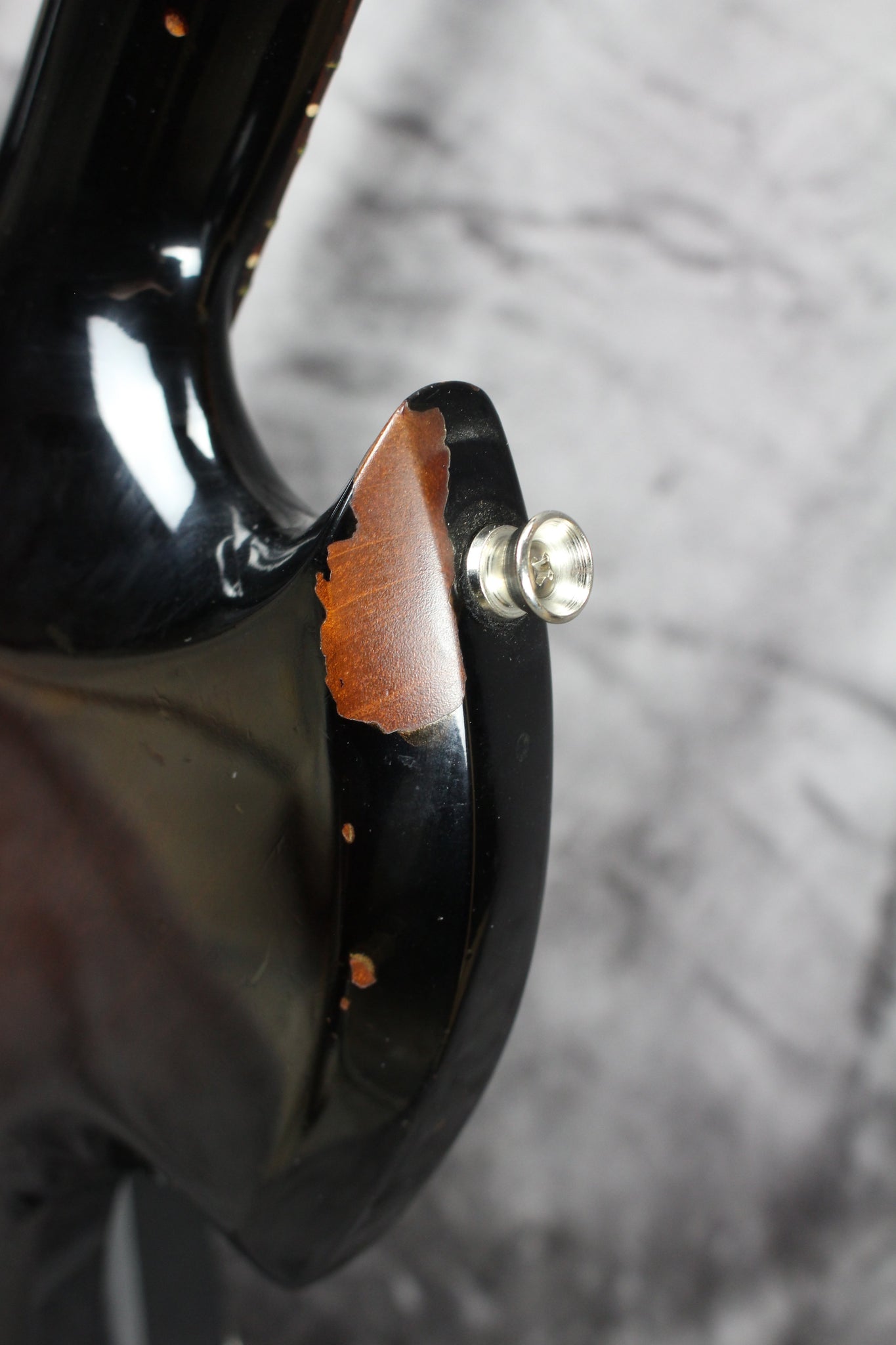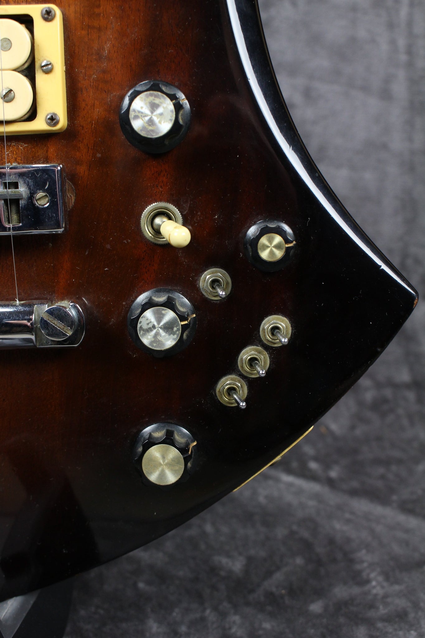 Modifications: The two pickups are both replacements and the toaster bridge is a replacement. Underneath the bridge, you can see where the old holes have been filled in and new holes have been made for the toaster bridge. The electronics are working but the guitar has been re-wired and is not the way it was originally designed (see photos). The varitone switch has been replaced and now is a tone roll off knob.