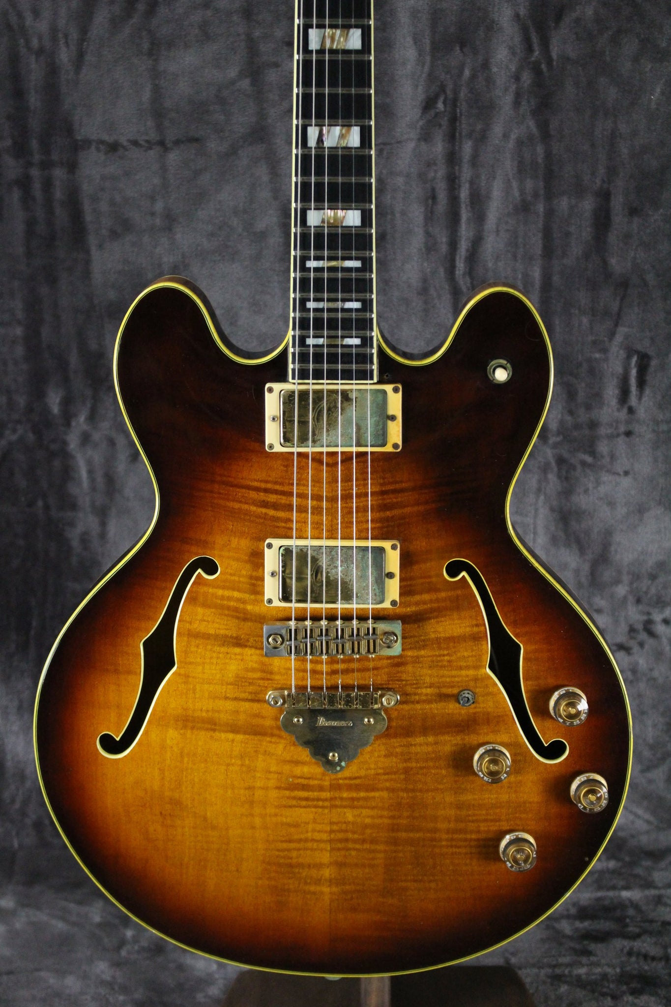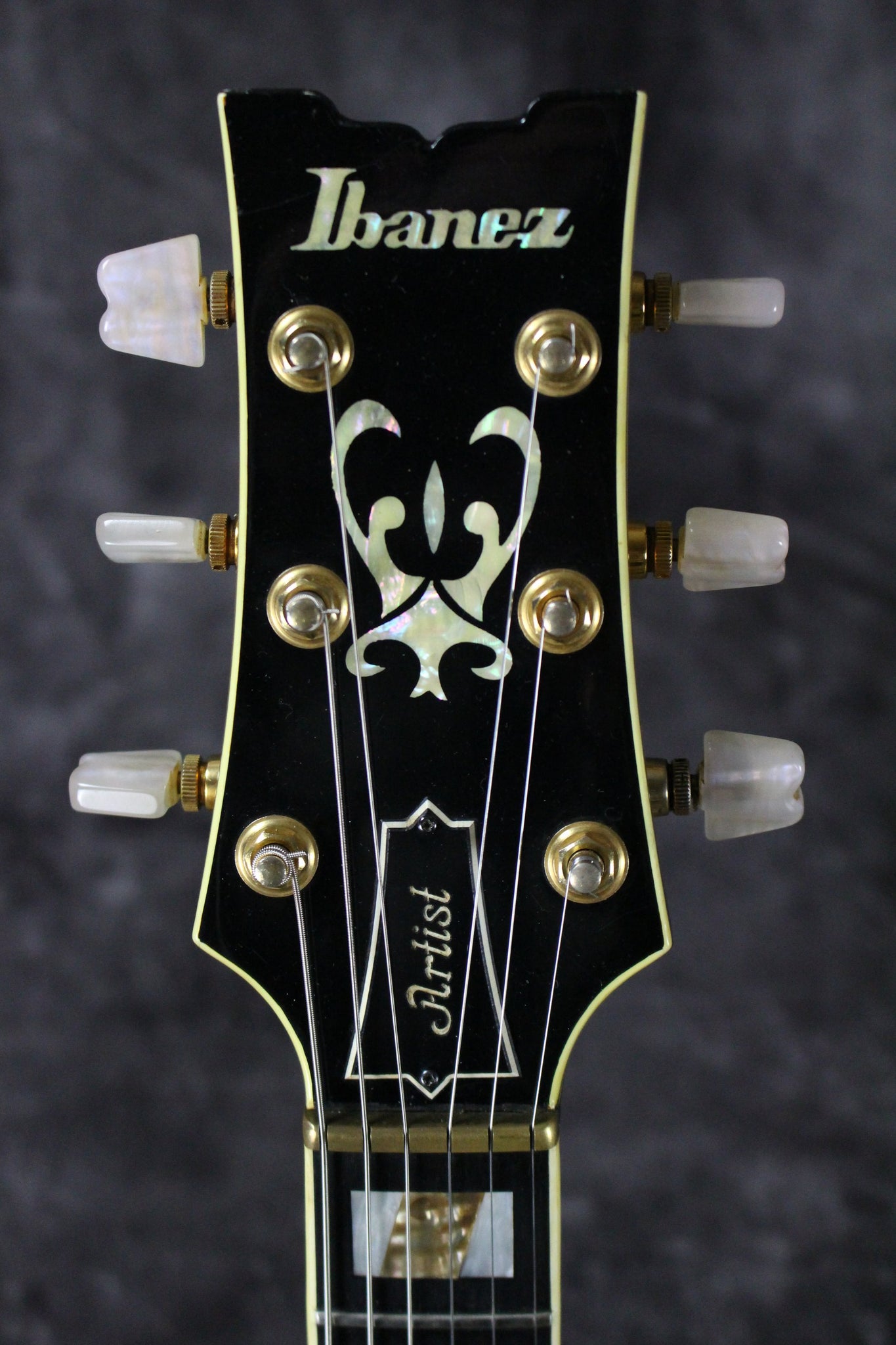 This 1978 Ibanez Artist 2630 features a full-sized, thinline, semi-hollow, double cutaway body design. It has an arched curly maple top with ƒ holes and ivory multi-binding and a curly Maple back on Maple sides with a hard rock Maple center block mated to a set-in rock Maple neck with a 22-fret Ebony fingerboard with ivory binding and pearl and abalone split block position markers. Components include a pair of Ibanez Super 80 humbucking pickups, a Tune-o-matic style Gibraltar bridge with heavy brass tone block set into the body, a Gibraltar tailpiece with a scalloped ornament, a half bone/ half brass nut, Sure Grip knobs, and VelveTune tuning machines with ivory buttons.