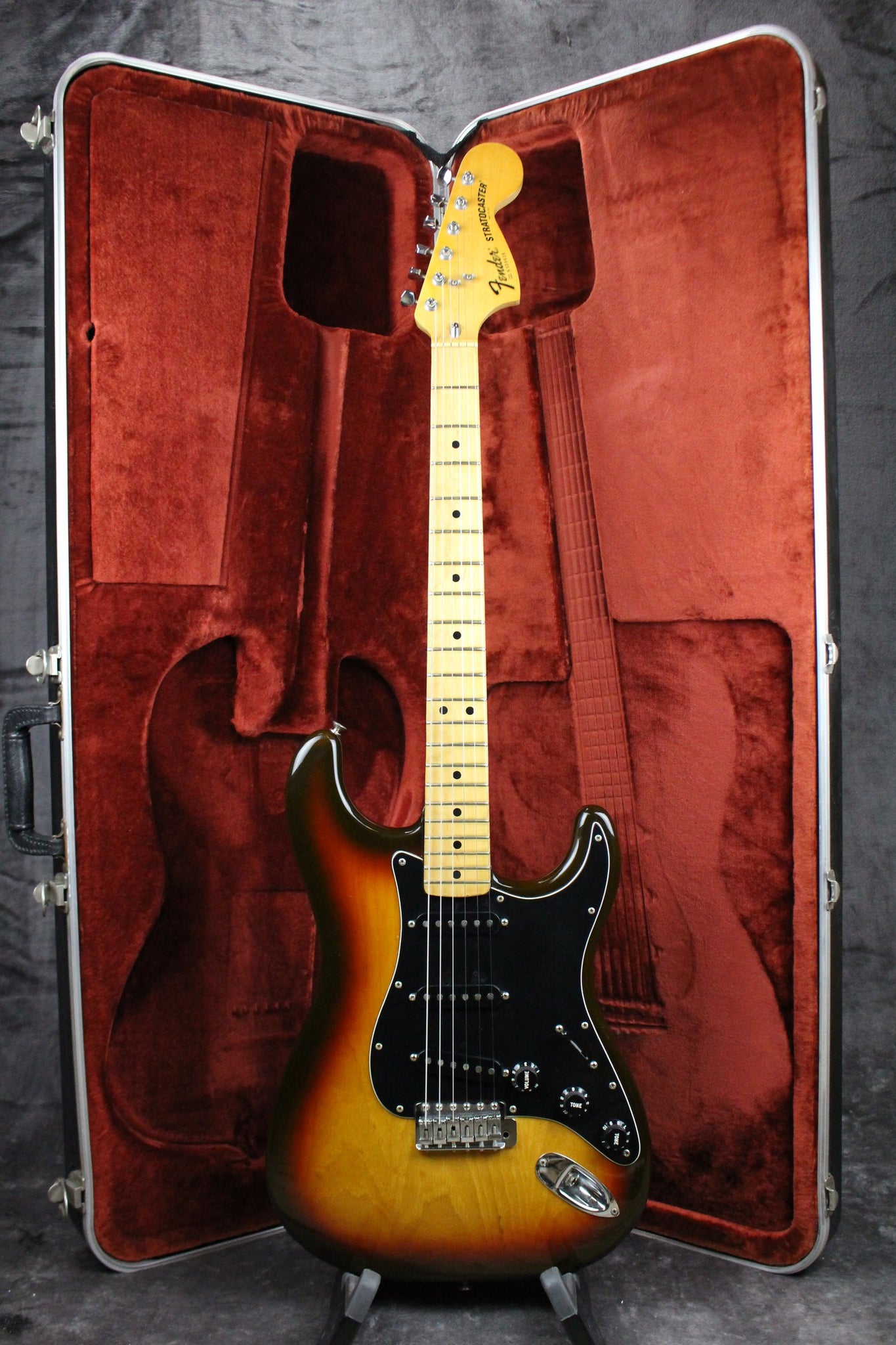 Case: This Fender Stratocaster ships in the original Fender molded plastic hard case with red interior, professionally packaged, and fully insured.