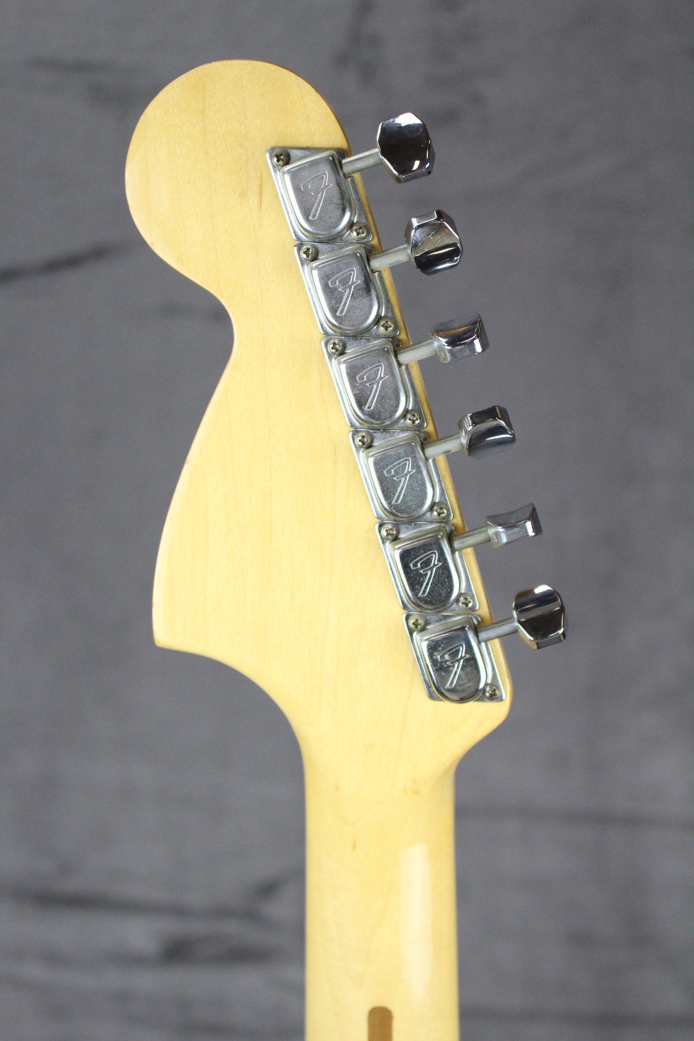Cosmetics: This vintage Fender is in wonderful shape, and you have to start looking hard to find any imperfections – there is normal pick wear on the pickguard, some light scuffs and ding in the body, a sign of ‘strap’ wear near the strap button on the upper horn and some light wear on the fingerboard edges, but overall you can tell this guitar was not played a lot and was well-cared for. The logo is in great shape and this guitar is ready for another 50 years of playing.