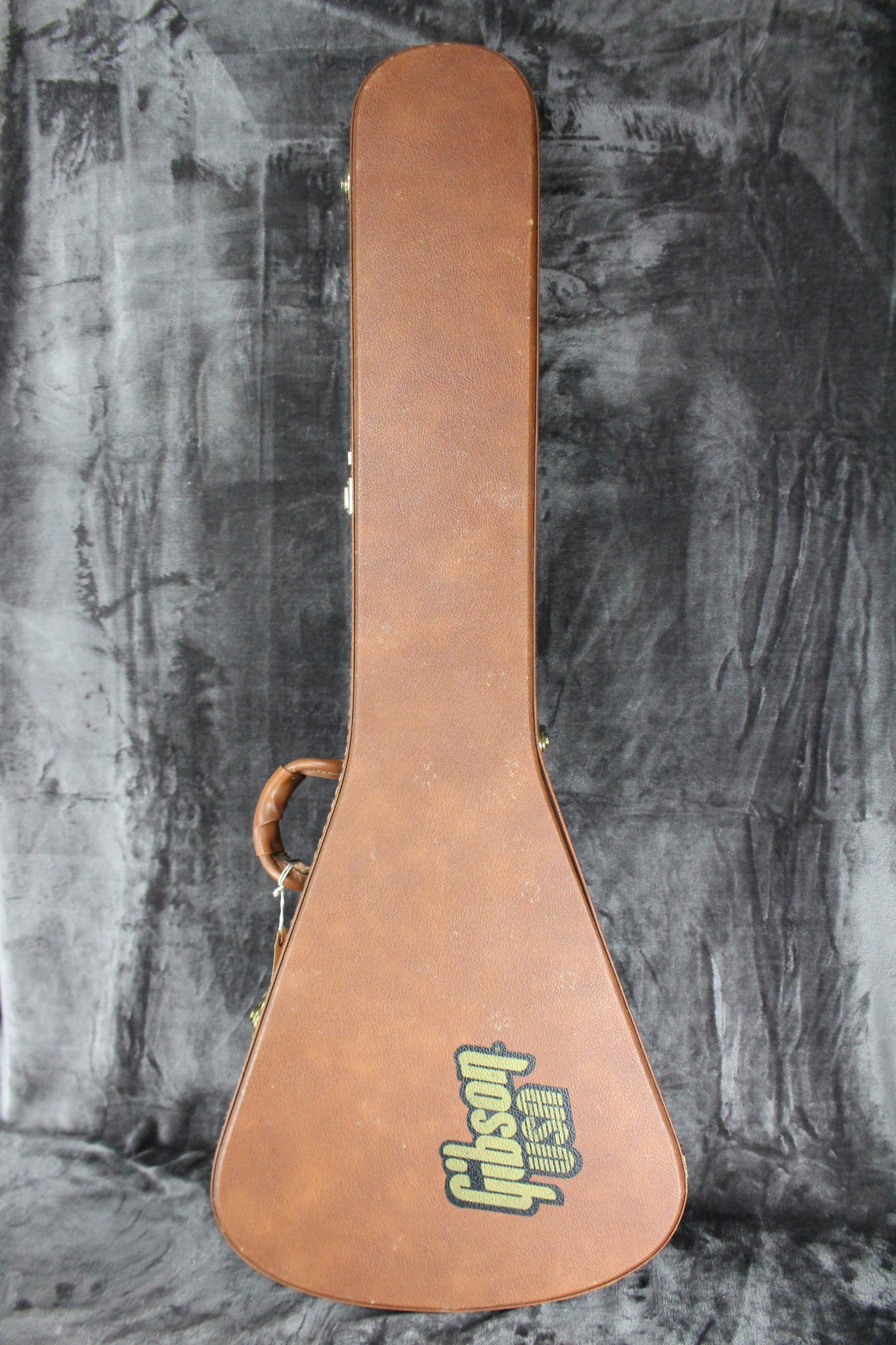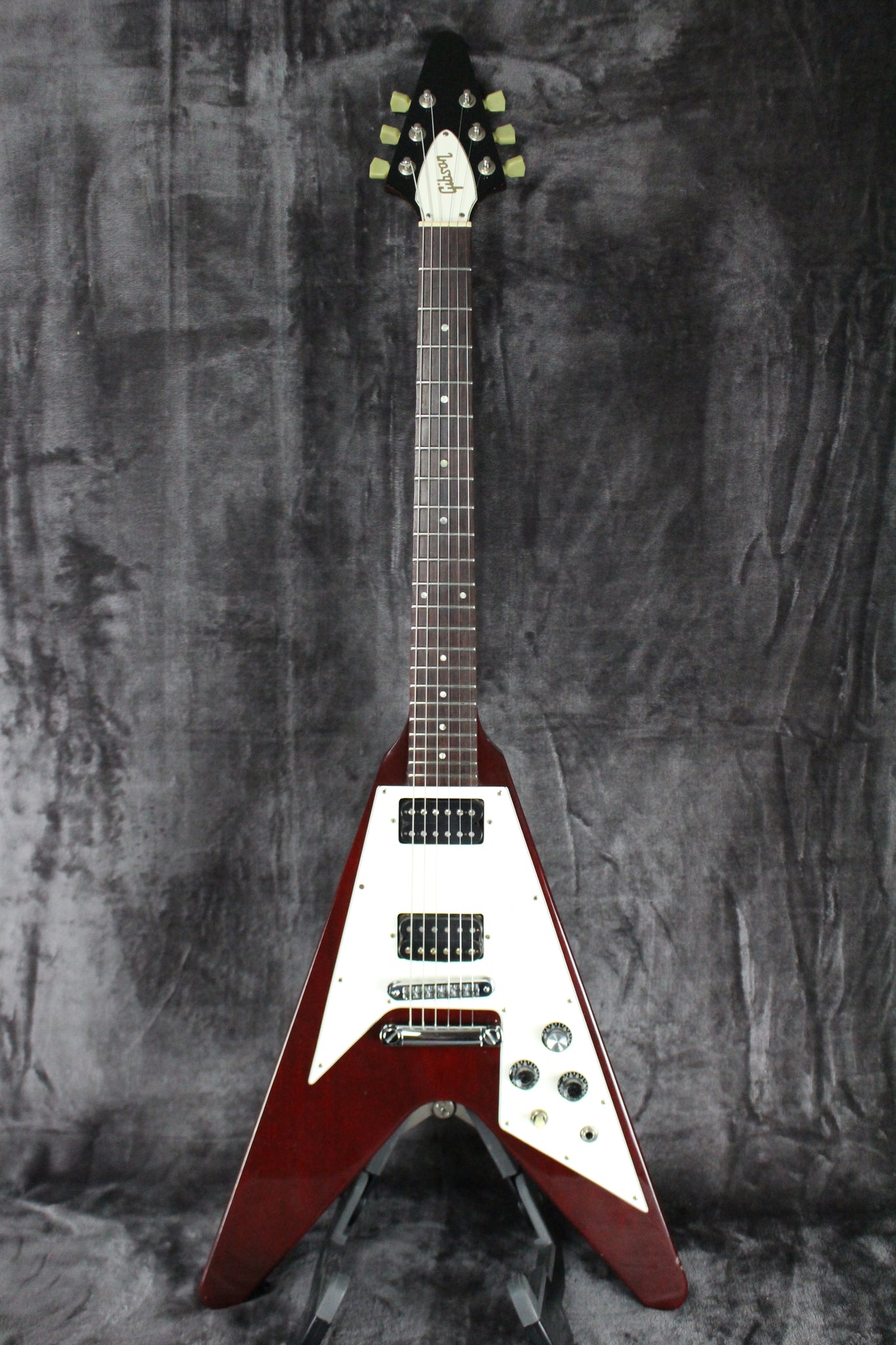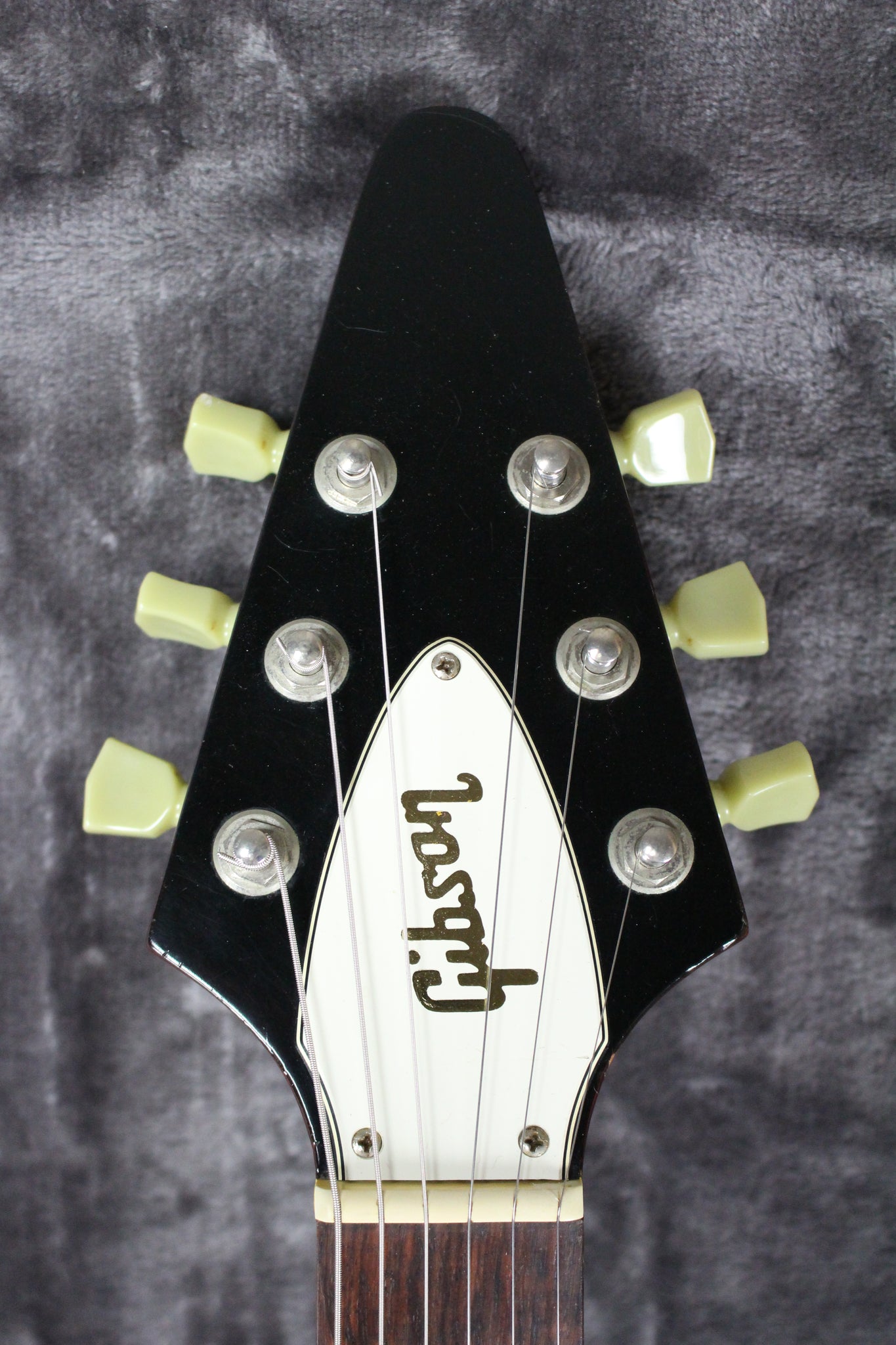 Summary: This 1992 Gibson Flying V '67 reissue is considered an iconic design by modern guitarists. It was first introduced in 1958, and in the following decades, it became increasingly popular, especially with hard rock and metal guitarists. It features a fast-playing mahogany neck with a rosewood fretboard. The iconically-shaped mahogany body is outfitted with humbucking pickups that accurately capture the unique fat-toned sound and rich sustain of this unique instrument.
