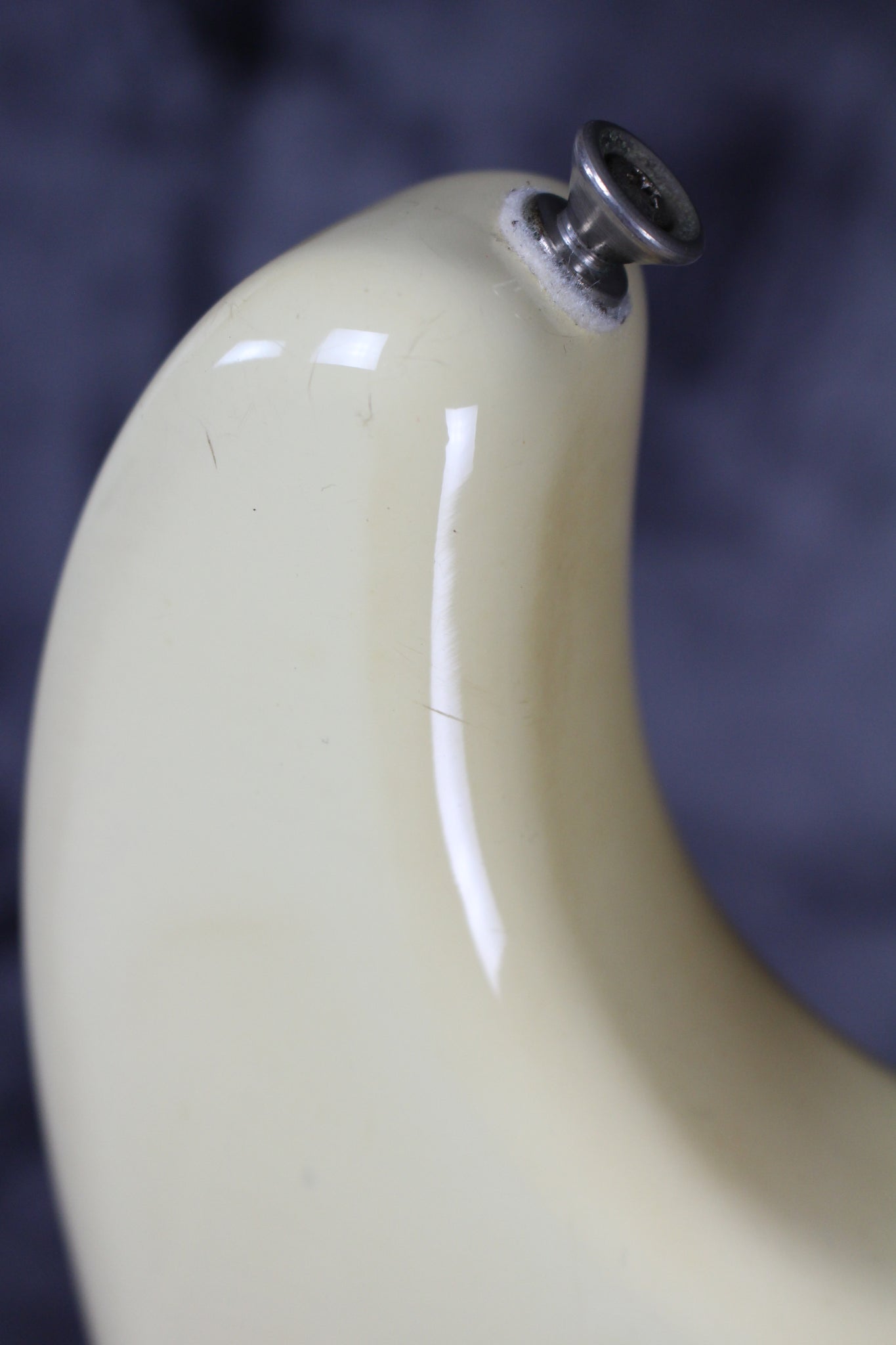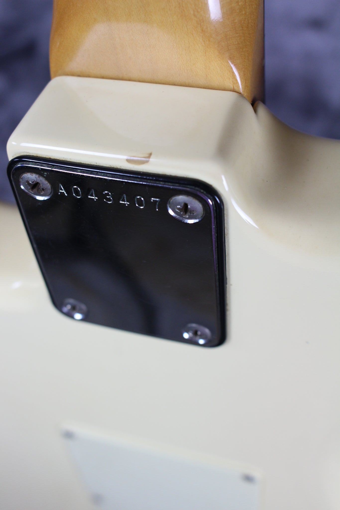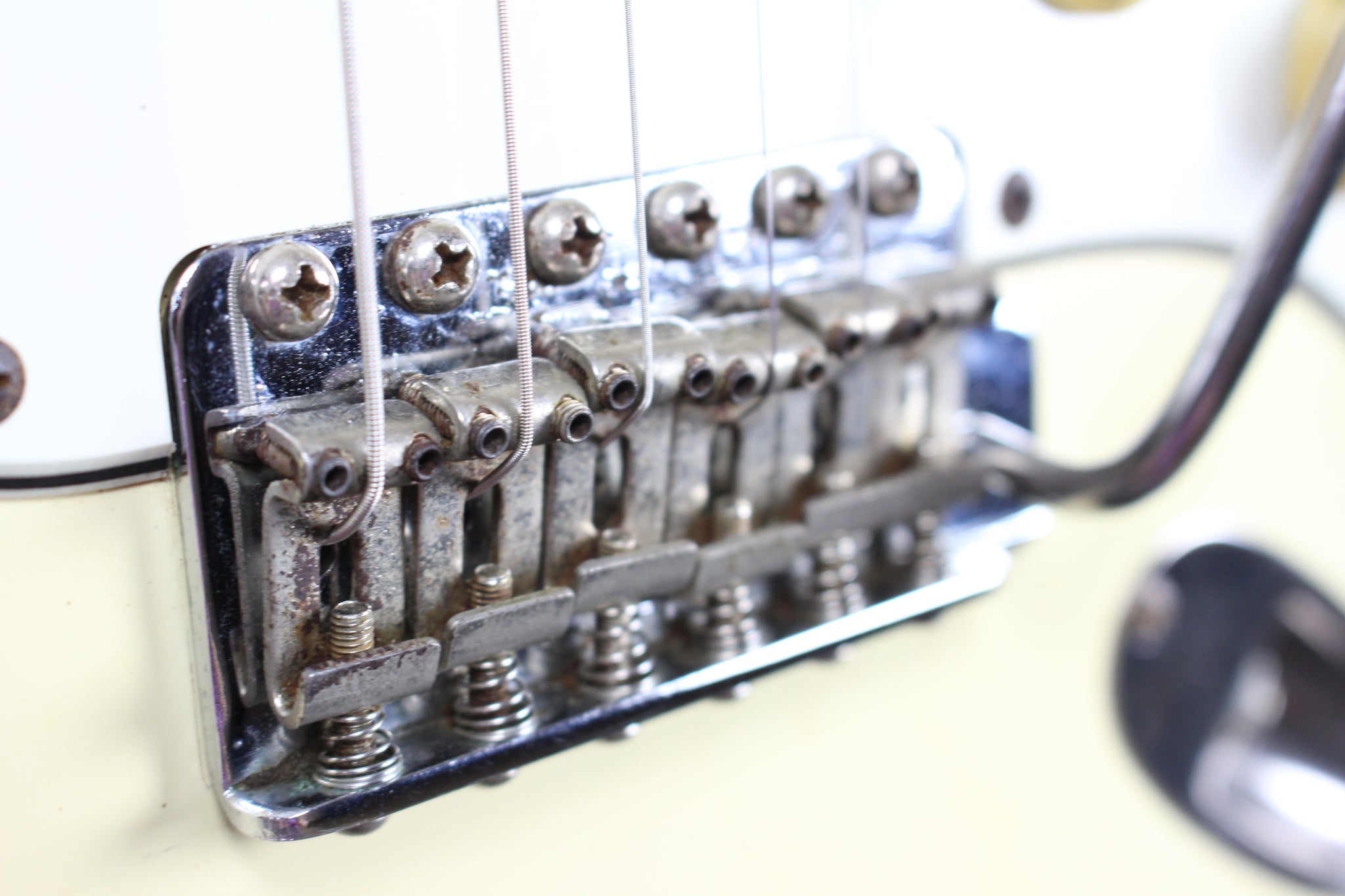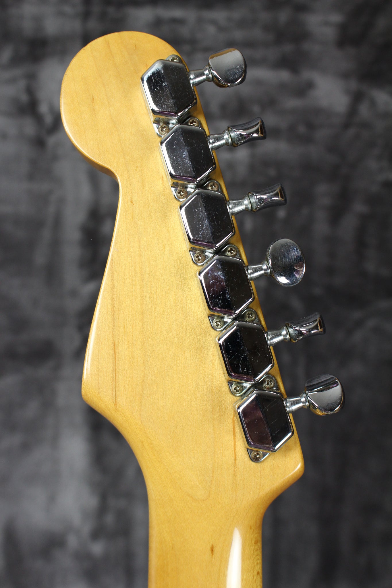Pickups/Hardware: Fender single coil pickups, standard hexagonal sealed tuning keys, vintage synchronized tremolo bridge, white plastic knobs, bone nut.