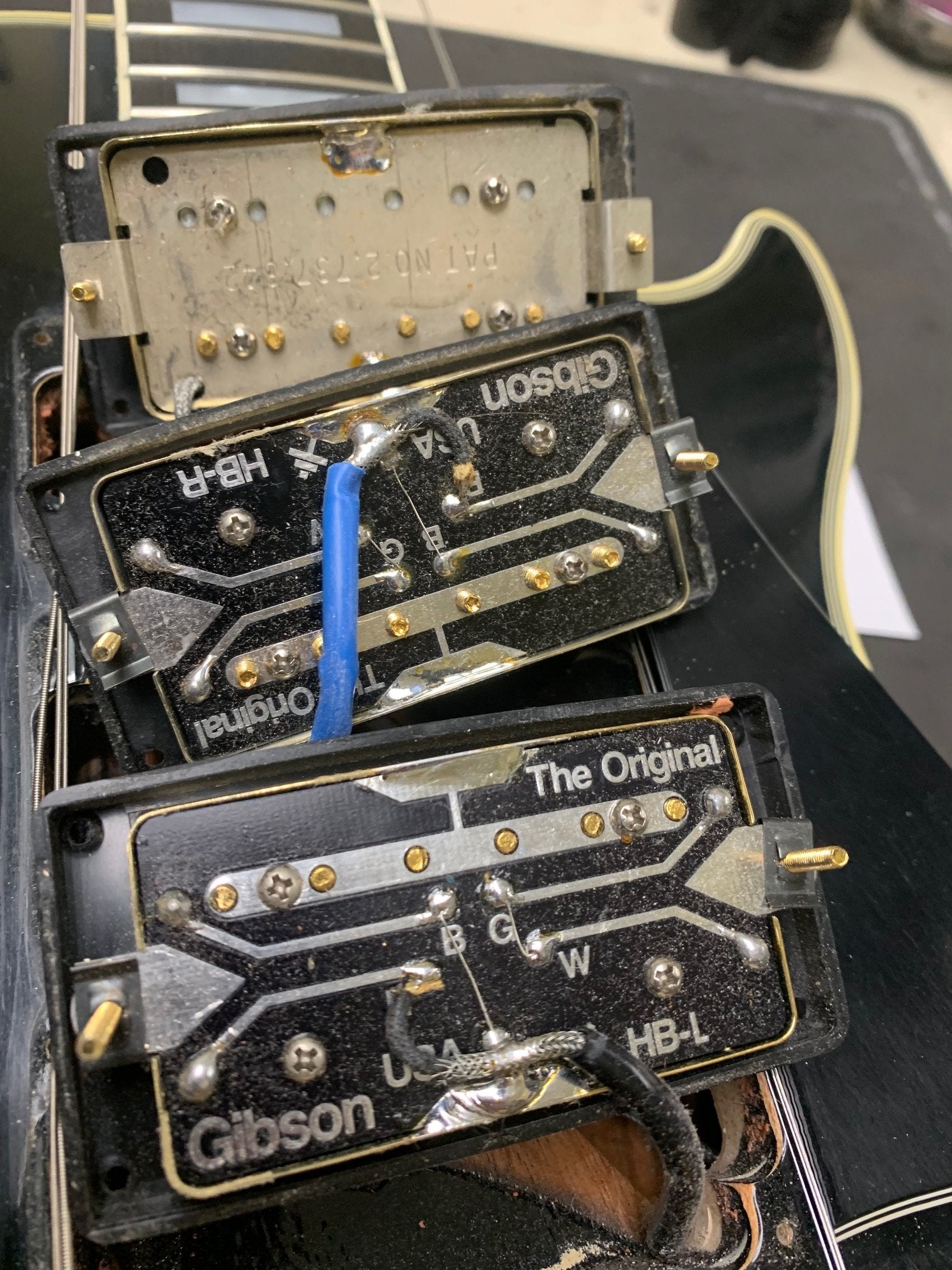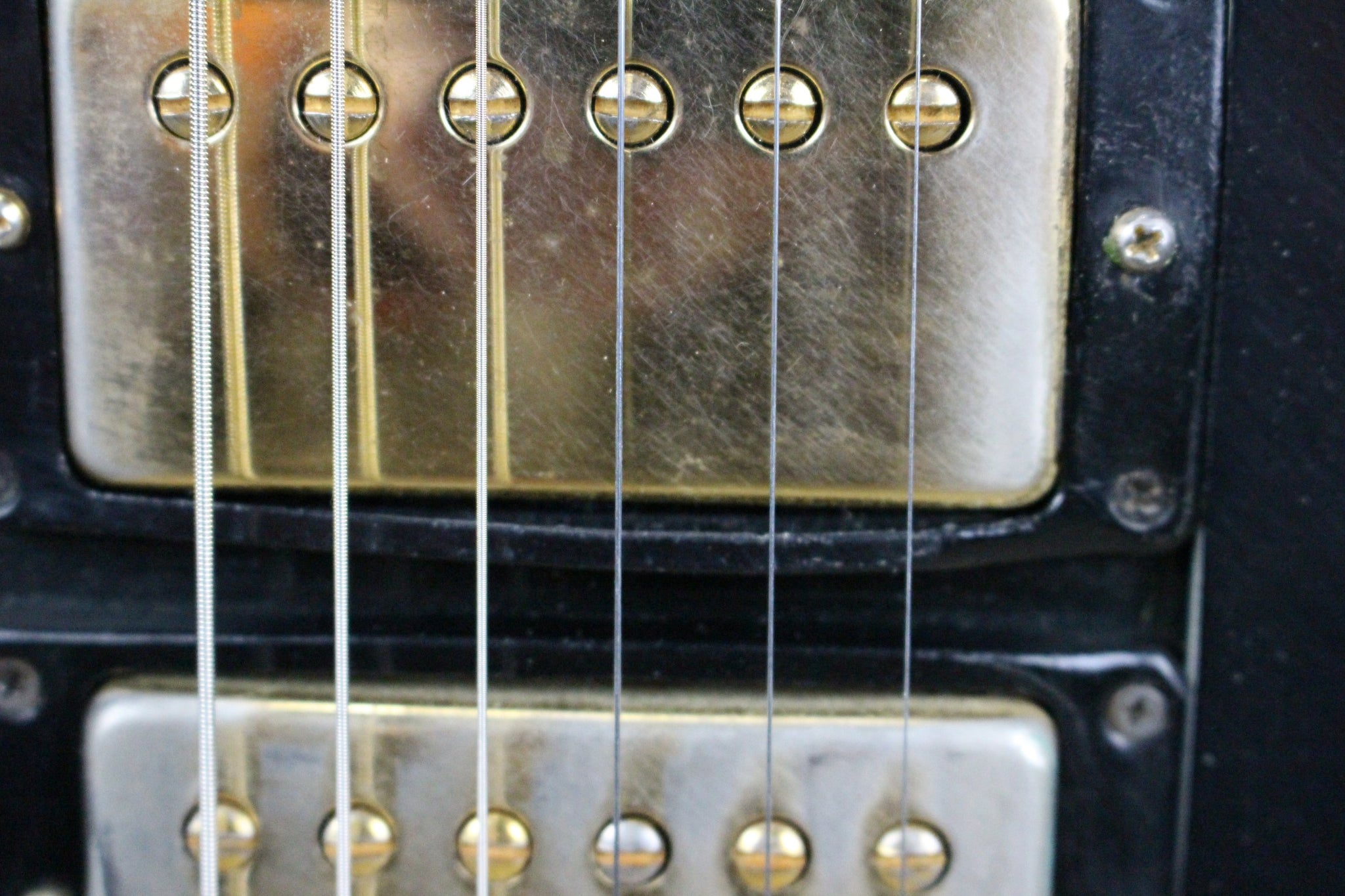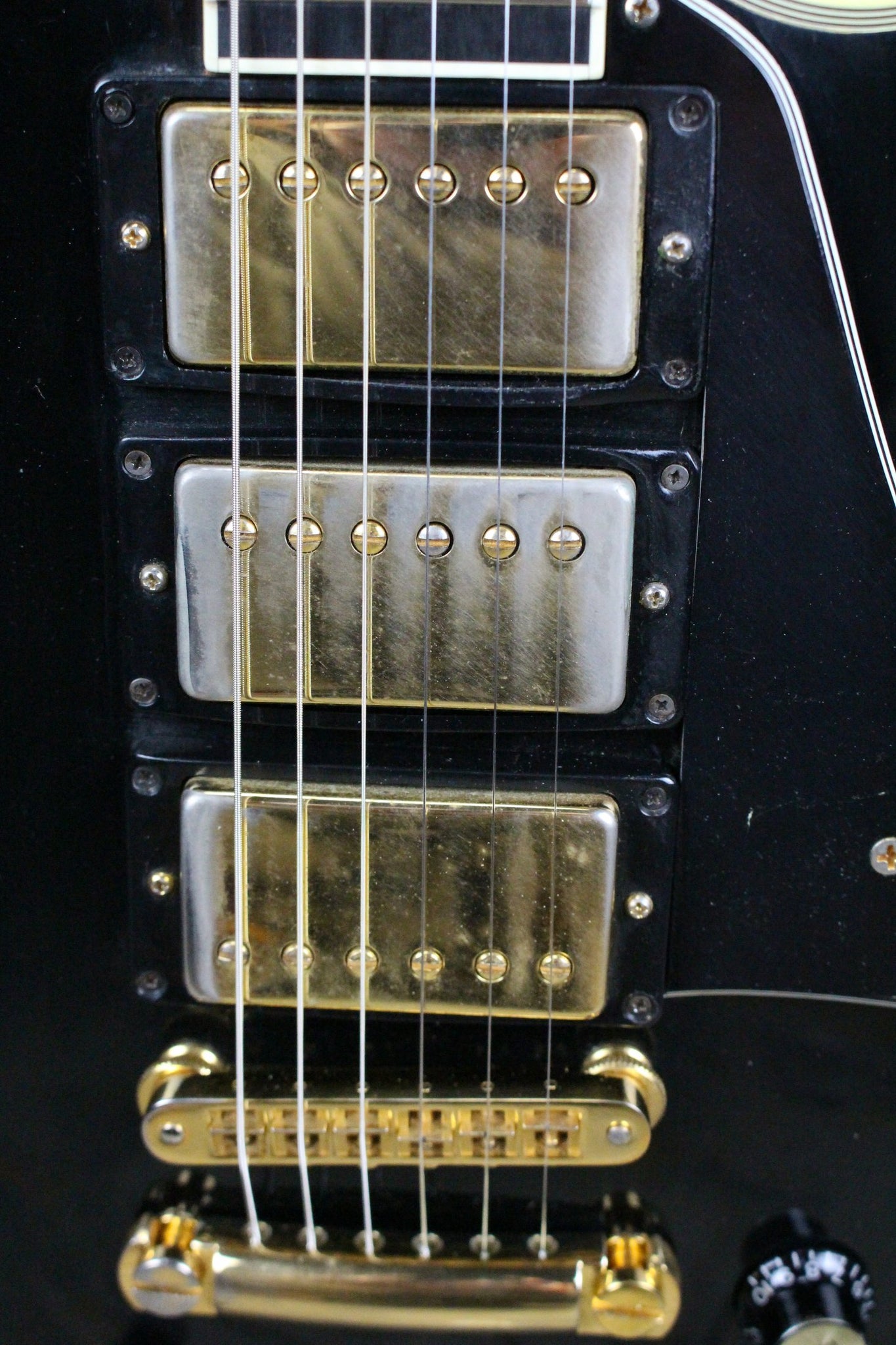 Pickups/Hardware: 3 Gibson humbucker pickups, gold hardware, gold Gibson tuning keys, Les Paul Custom truss rod cover, tune-o-matic bridge and stop tailpiece. Two volume knobs and two tone knobs and a 3-way switch, 5-ply pickguard.