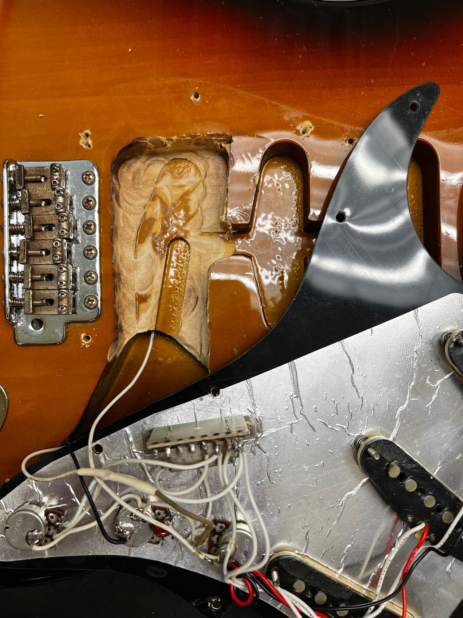 Modifications: Missing back plate, routed for humbucker, rewired electronics, new pickguard.