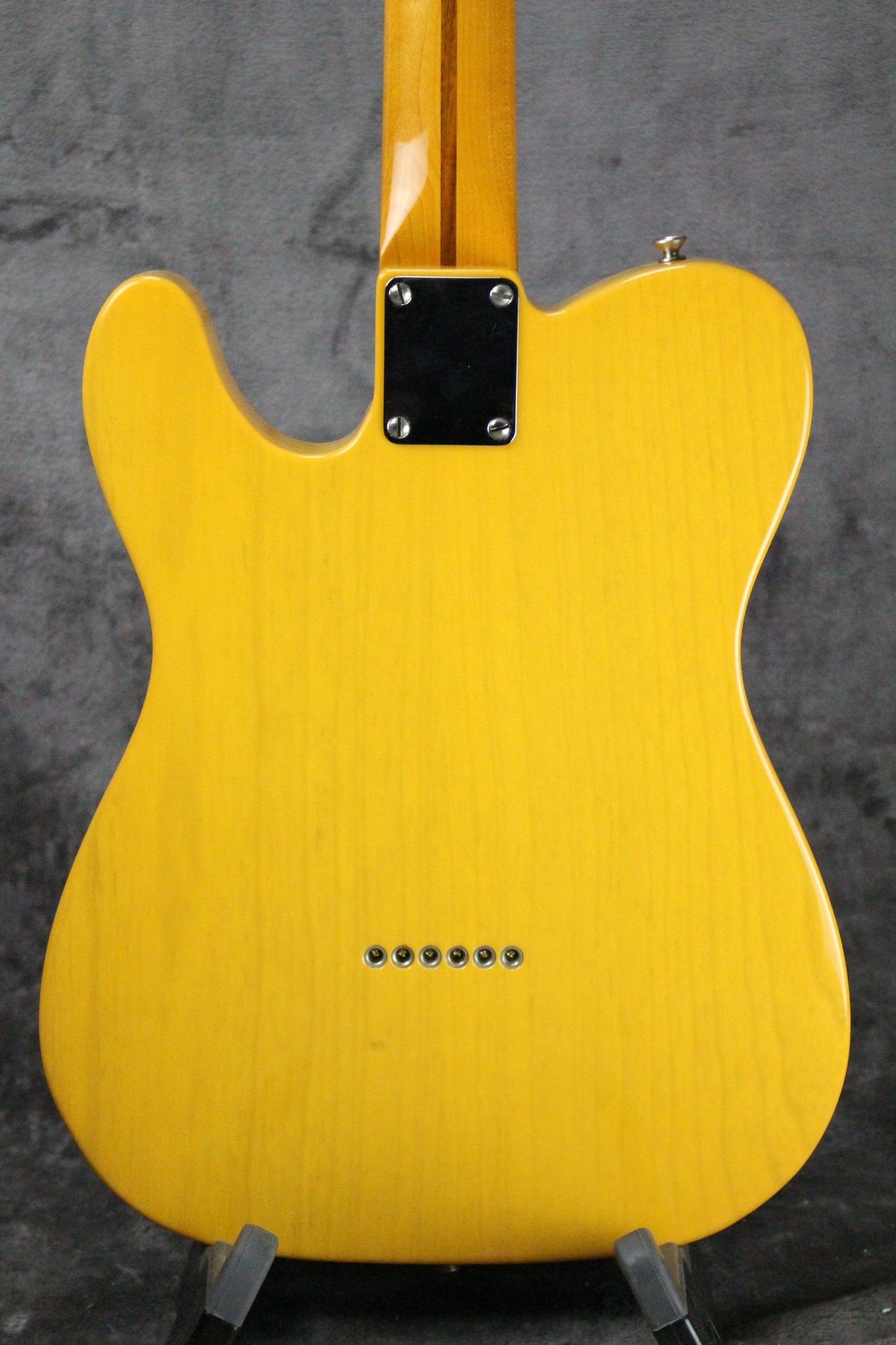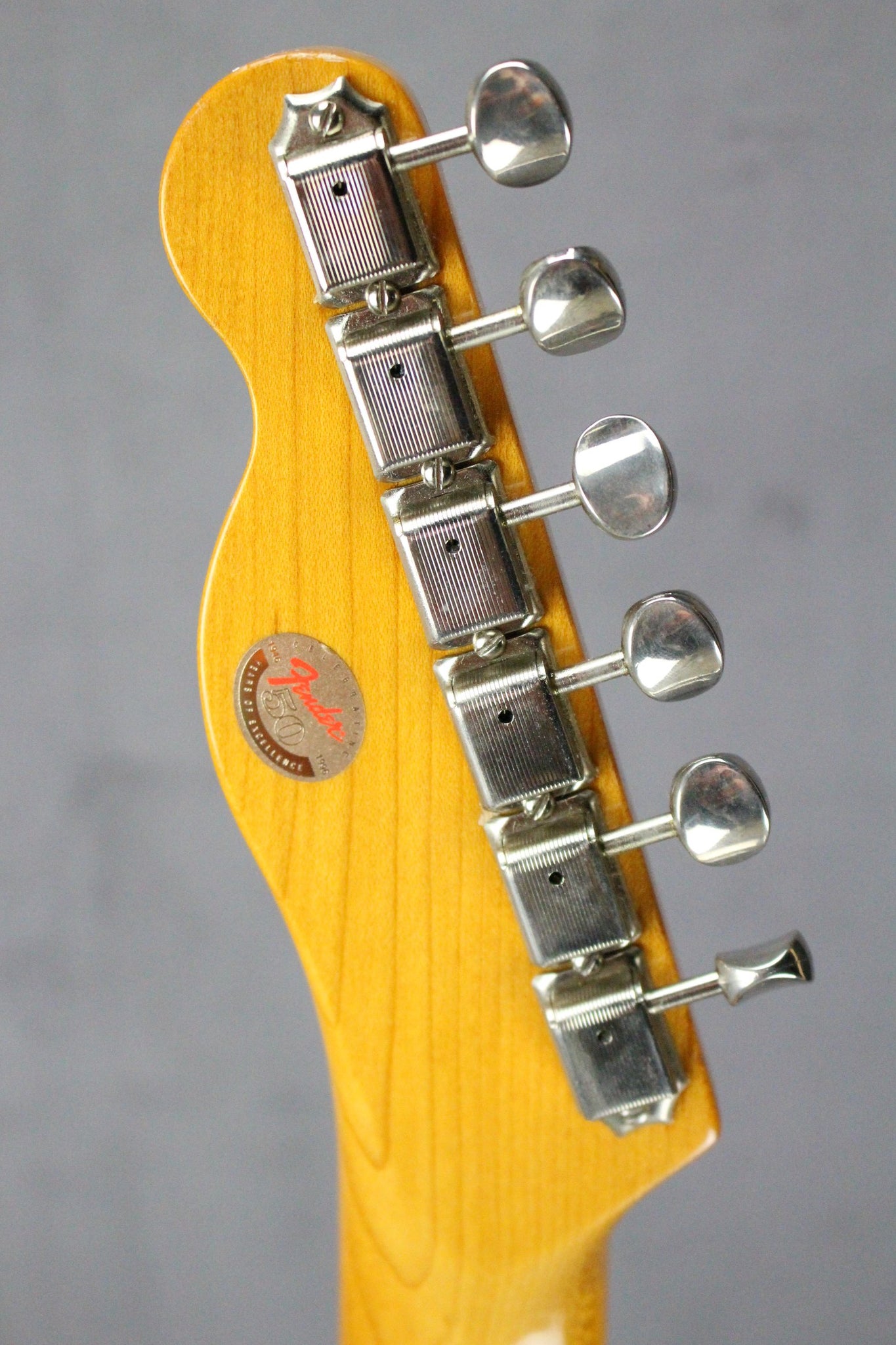 Pickups/Hardware: Single line vintage style tuning keys, two vintage style ’52 Tele Alnico pickups, black single-ply pickguard, master volume/master tone controls, three-way pickup selector, three brass saddles, string through the body.