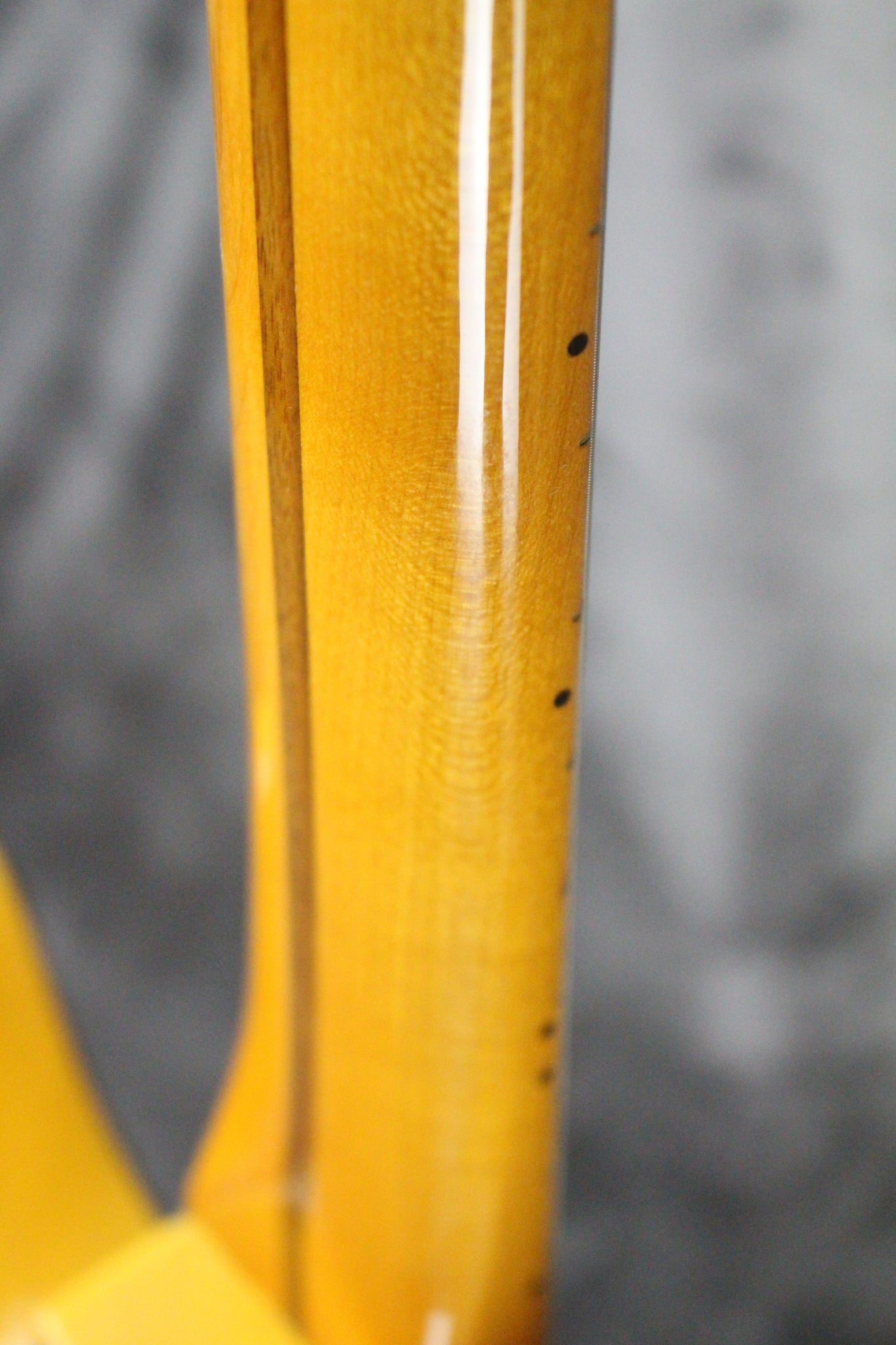 Neck: One piece Maple with a Walnut skunk stripe, 7.25” radius with a “U” shape, 25.5” scale length, 1.65” nut width, black dot inlays, bone nut, 21 small vintage style frets.