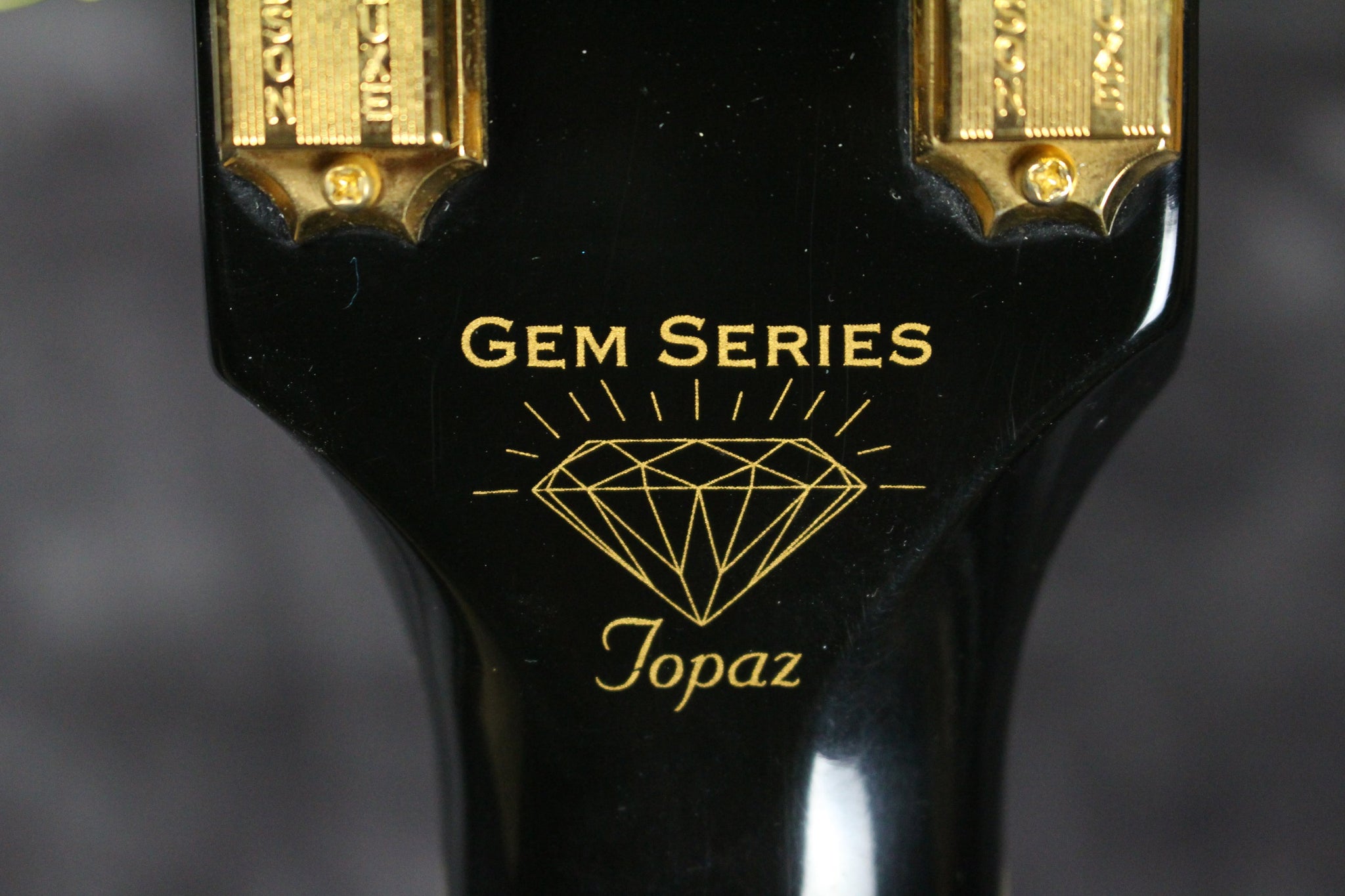 Summary: The Les Paul Gem Series from Gibson had P-90 pickups and special finishes in "gemstone" colors: Amethyst, Sapphire, Topaz, Emerald, and Ruby. This Les Paul Studio has the Topaz decal on the back of the headstock, gold hardware, a Rosewood fingerboard with pearl block inlays, and Gibson Deluxe keystone tuning keys. It is in fantastic condition and comes with a non-original hard-shell case.