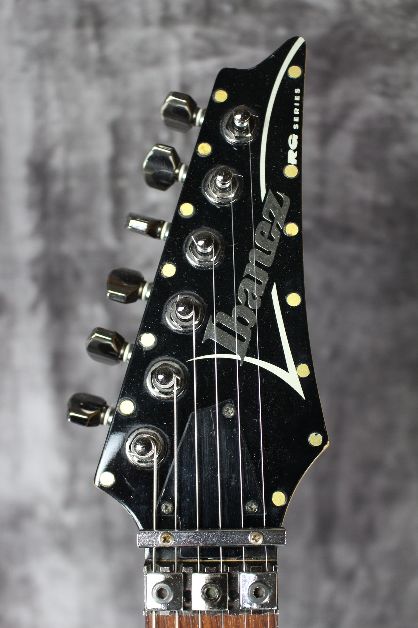 Summary: This 1996 Ibanez RG517, made in Japan, features a basswood body with special blue flaked finish. The neck is one-piece maple with a bubinga skunk stripe with a 24-fret rosewood fingerboard with dot position markers. It has non-original DiMarzio humbucking pickups flanking an Ibanez S1 single-coil controlled by a 5-way selector switch & an Edge double locking tremolo bridge and a locking nut.