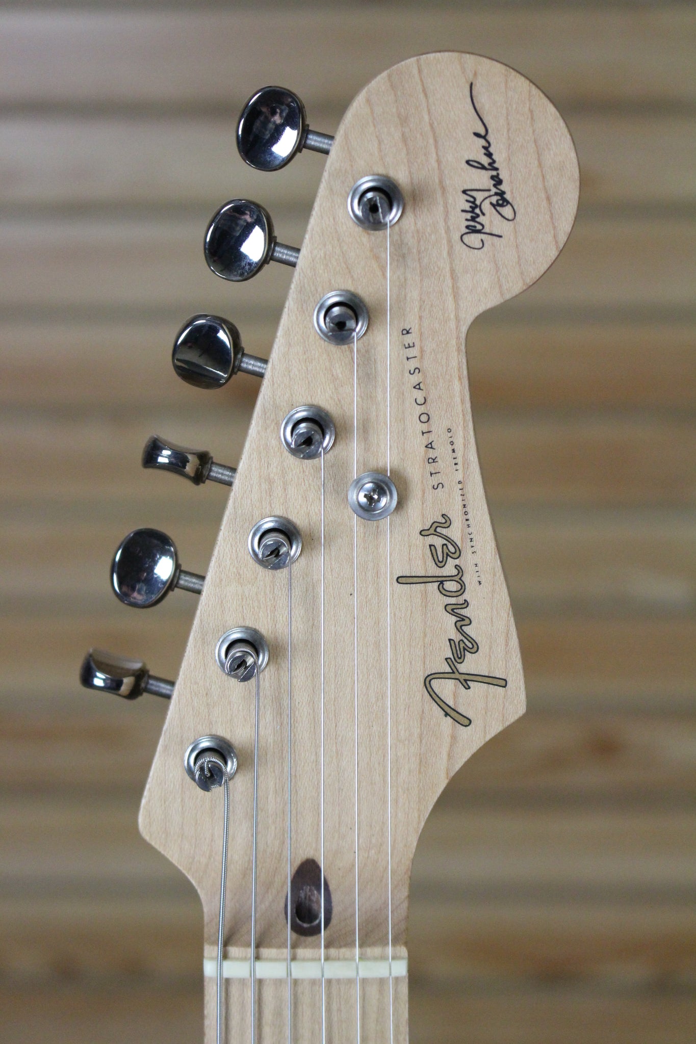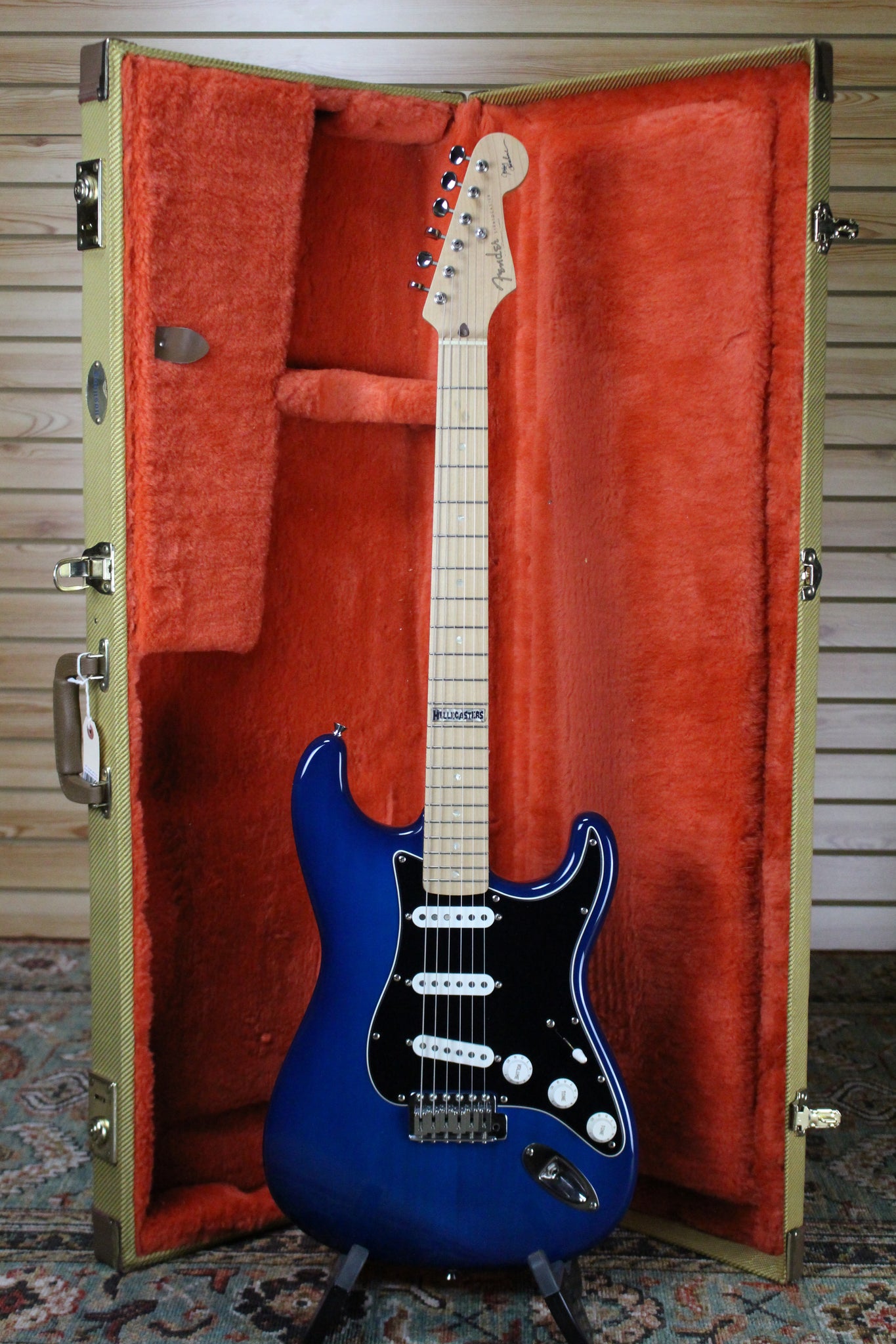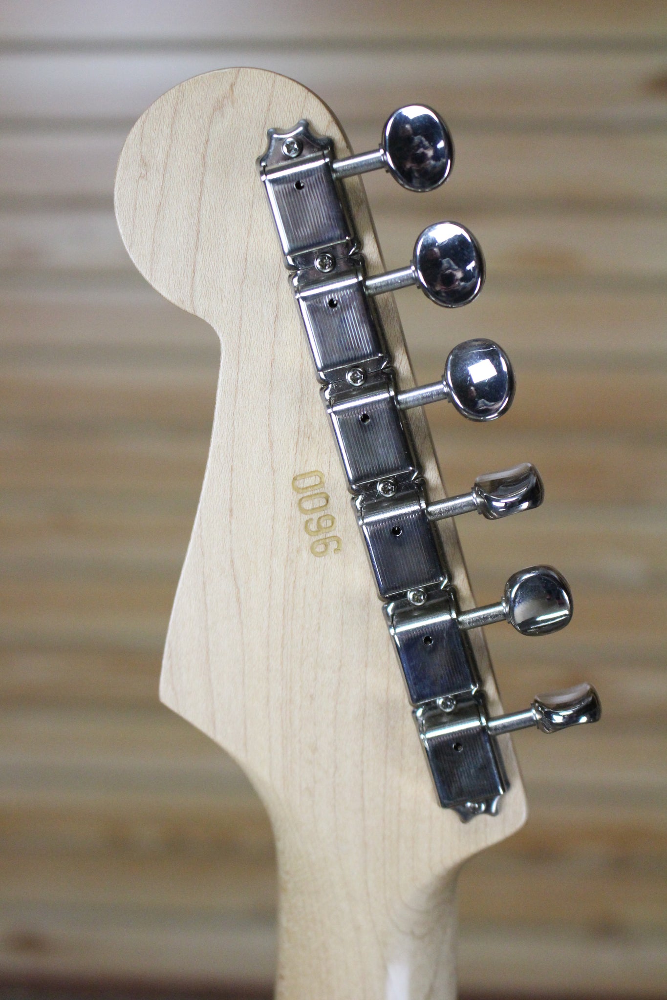 Pickups/Hardware: Neck & Middle: Seymour Duncan APS-2 (Alnico II) single coils, Bridge: Seymour Duncan Tele-style Strat-sized pickup (middle tone pot becomes a 2-way switch that adds the neck pickup in the 2 and 4 positions (for all-on in those) with the "4" position having a further altered tone cap, all stock), blue sparkle pickguard, vintage style tuning keys, vintage style bridge, white plastic knobs, bone nut.
