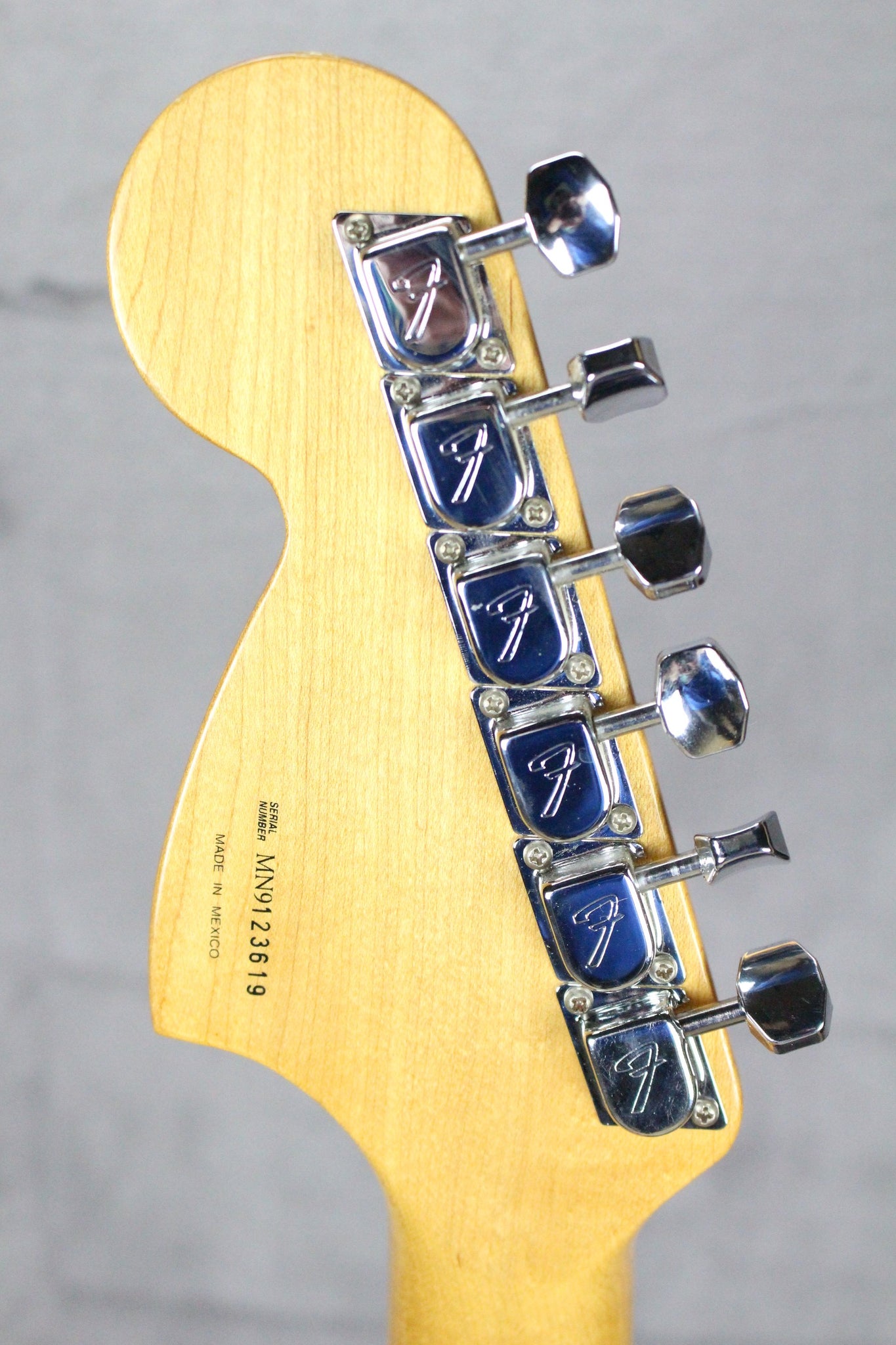 Pickups/Hardware: Two Seymour Duncan Hot Rails/One Cool Rail (Middle) pickups, master volume/two tone controls (push/pull on the bottom tone knob that splits the pickups), the mini toggle adds the neck pickup to any position on the pickup selector, three-way pickup selector, Fender logo tuning keys, Vintage style tremolo system, black 3-ply pickguard.