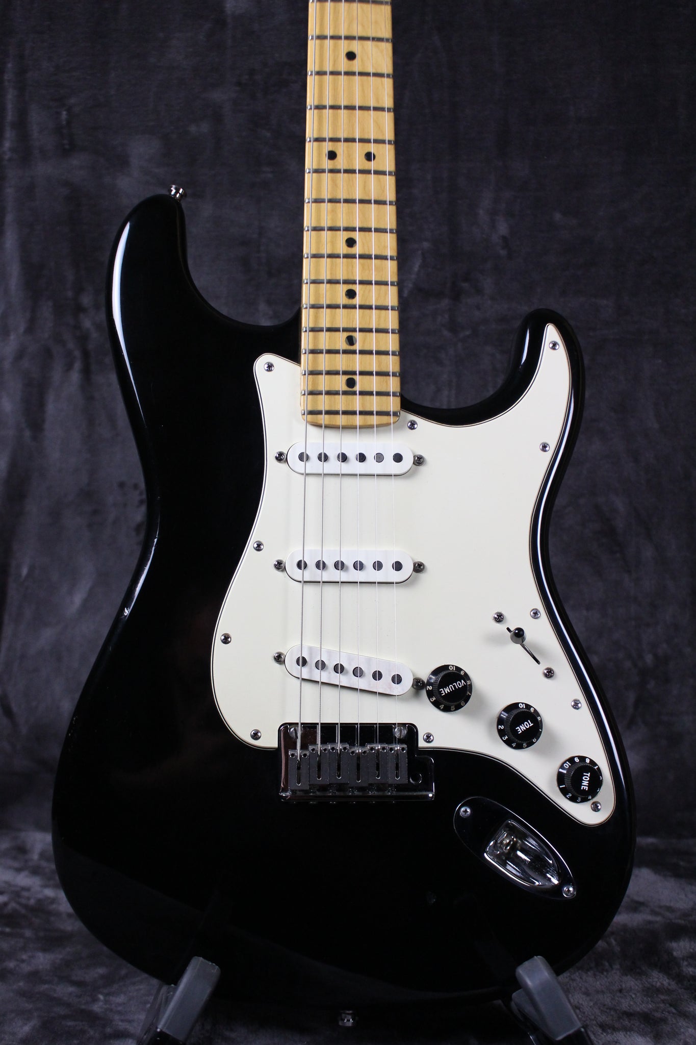 Pickups/Hardware: American Single-Coil Strat pickups (Master Volume, Tone 1. (Neck Pickup), Tone 2. No-Load Tone Control (Middle and Bridge Pickups), Fender/Schaller Deluxe Staggered Cast/Sealed tuners, 2-Point American Series Synchronized Tremolo with Stainless Steel Saddles, parchment plastic knobs, bone nut.