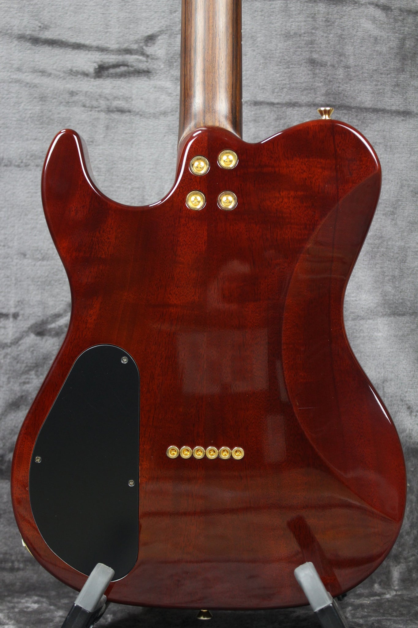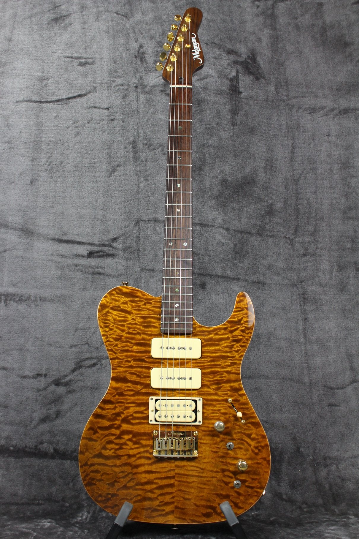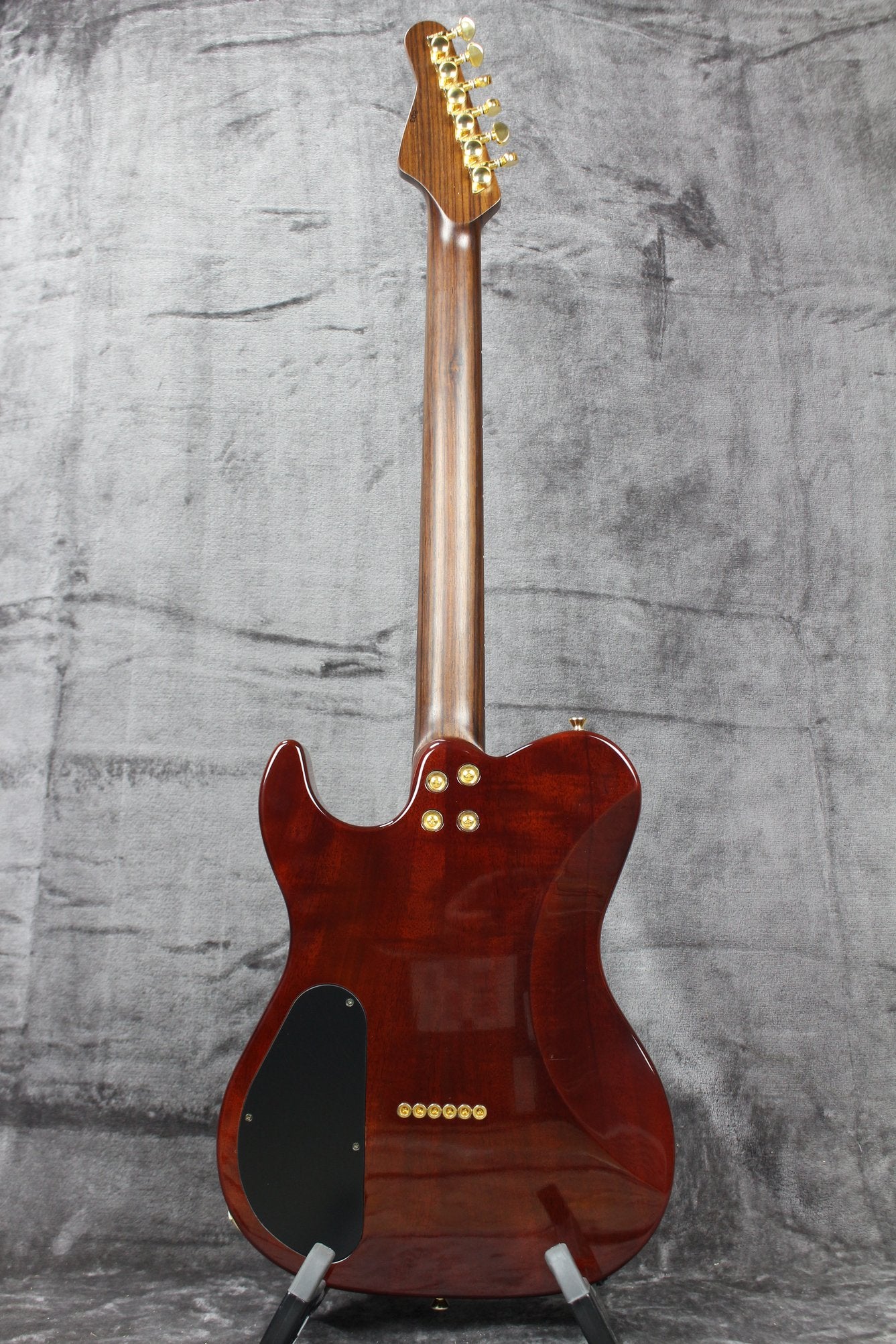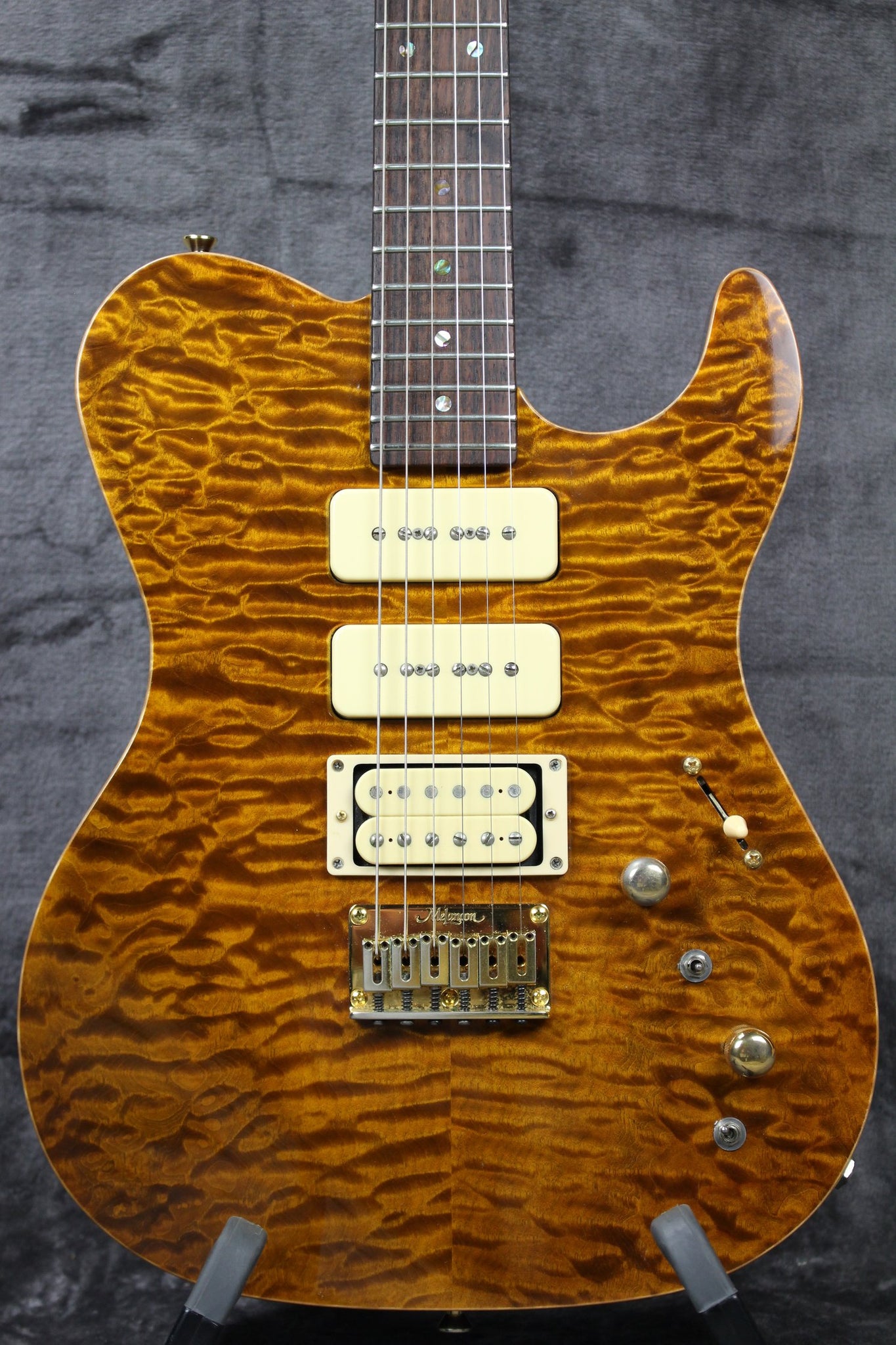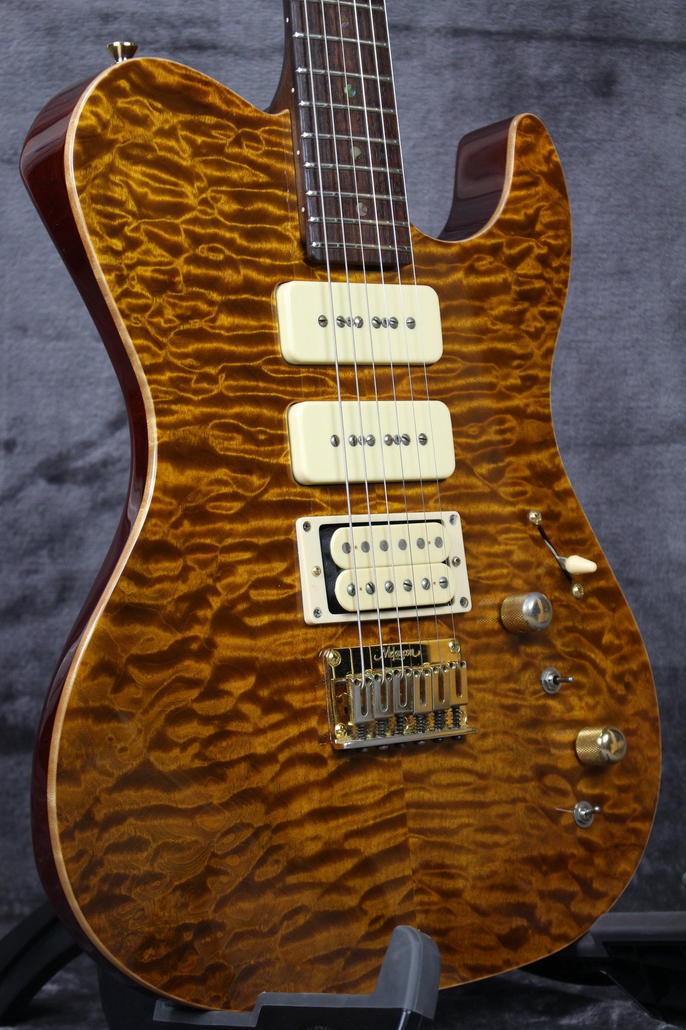 Body: Tiger-eye 2A quilted top North American maple, mahogany back, natural binding.