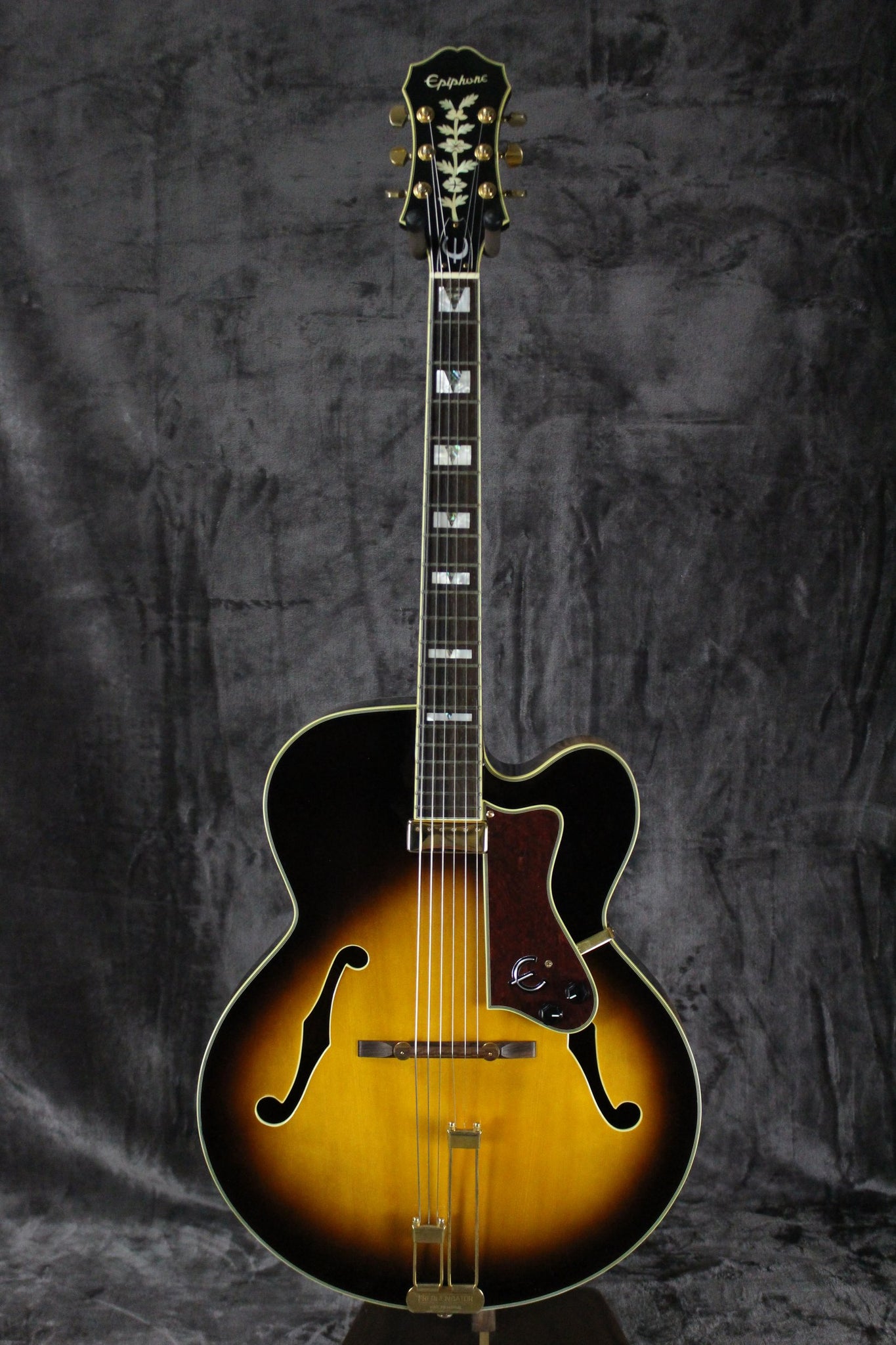 This 2004 Epiphone Emperor features a Spruce top in Antique Sunburst, a single floating mini-humbucker, V-Block inlays, and a frequensator tailpiece.