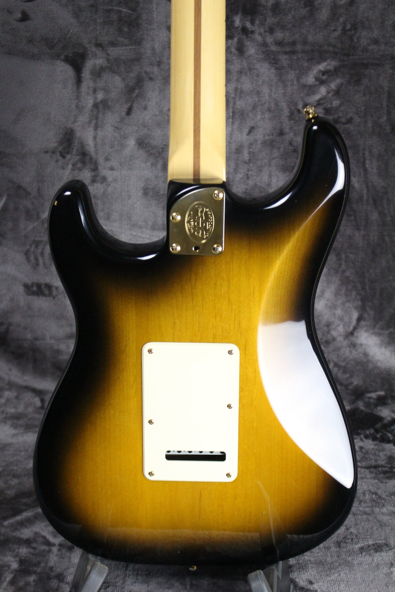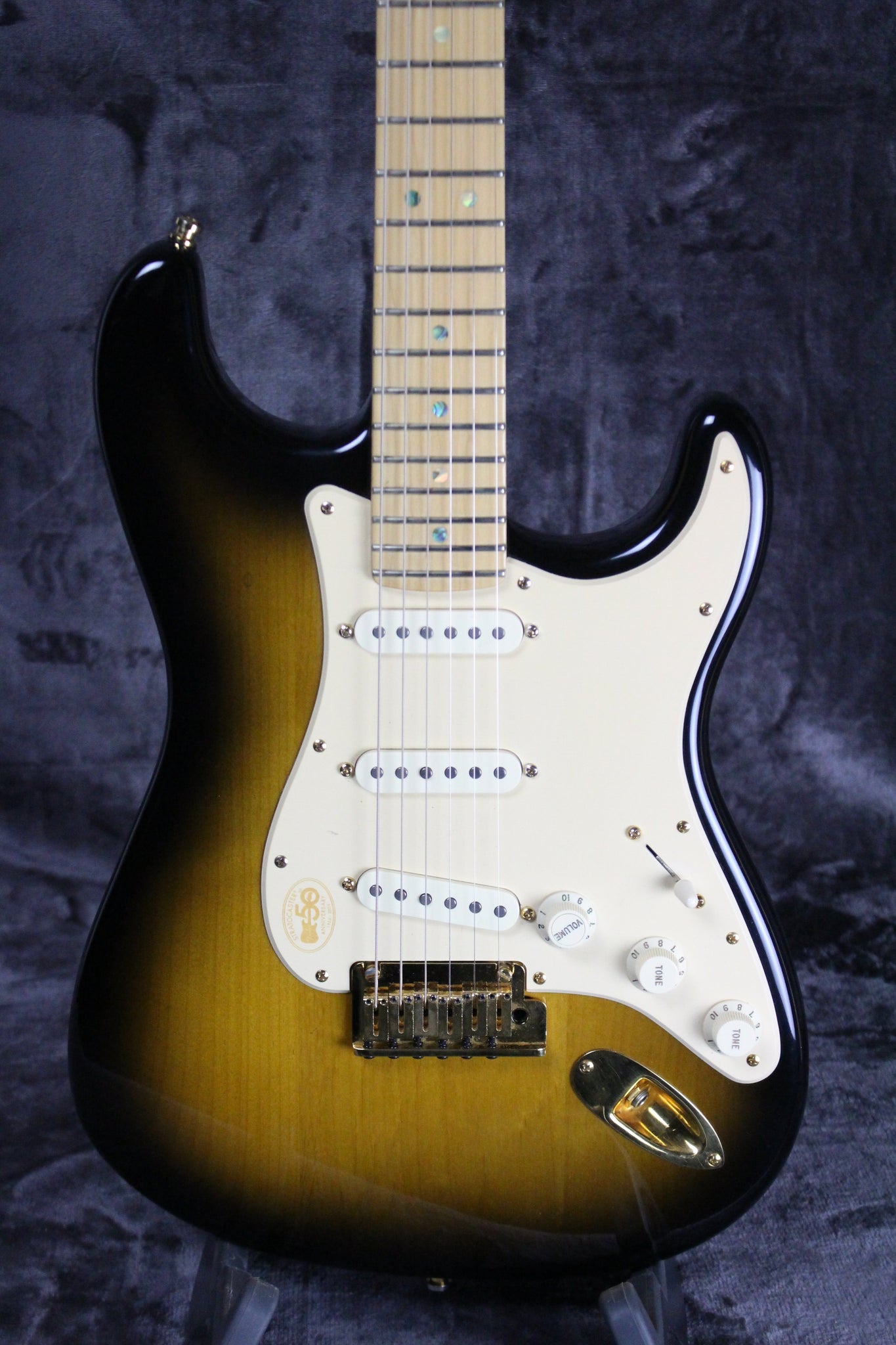 Pickups/Hardware: Three SCN Noiseless single pickups, Master Volume (with S-1 Switch), Tone 1. (Neck Pickup), Tone 2. (Middle and Bridge Pickups; No-Load Tone control), S-1 switch controls include (S-1 Up: Pos 1. Bridge, Pos 2. Bridge/Mid, Pos 3. Mid, Pos 4. Mid/Neck, Pos 5. Neck. S-1 Down: Pos 1. Bridge/Mid (Series), Position 2. Bridge/Mid, Pos 3. Mid (No Tone Control), Pos 4. Neck Parallel with Cap and Series with Mid Pos 5. Neck/Mid (Series)), gold locking tuning keys, bone nut, 2-Point Deluxe Synchronized Tremolo with Pop-In Arm, 1-Ply Beveled Parchment Vinyl with Laser Etched 50th Anniversary Commemoration pickguard.