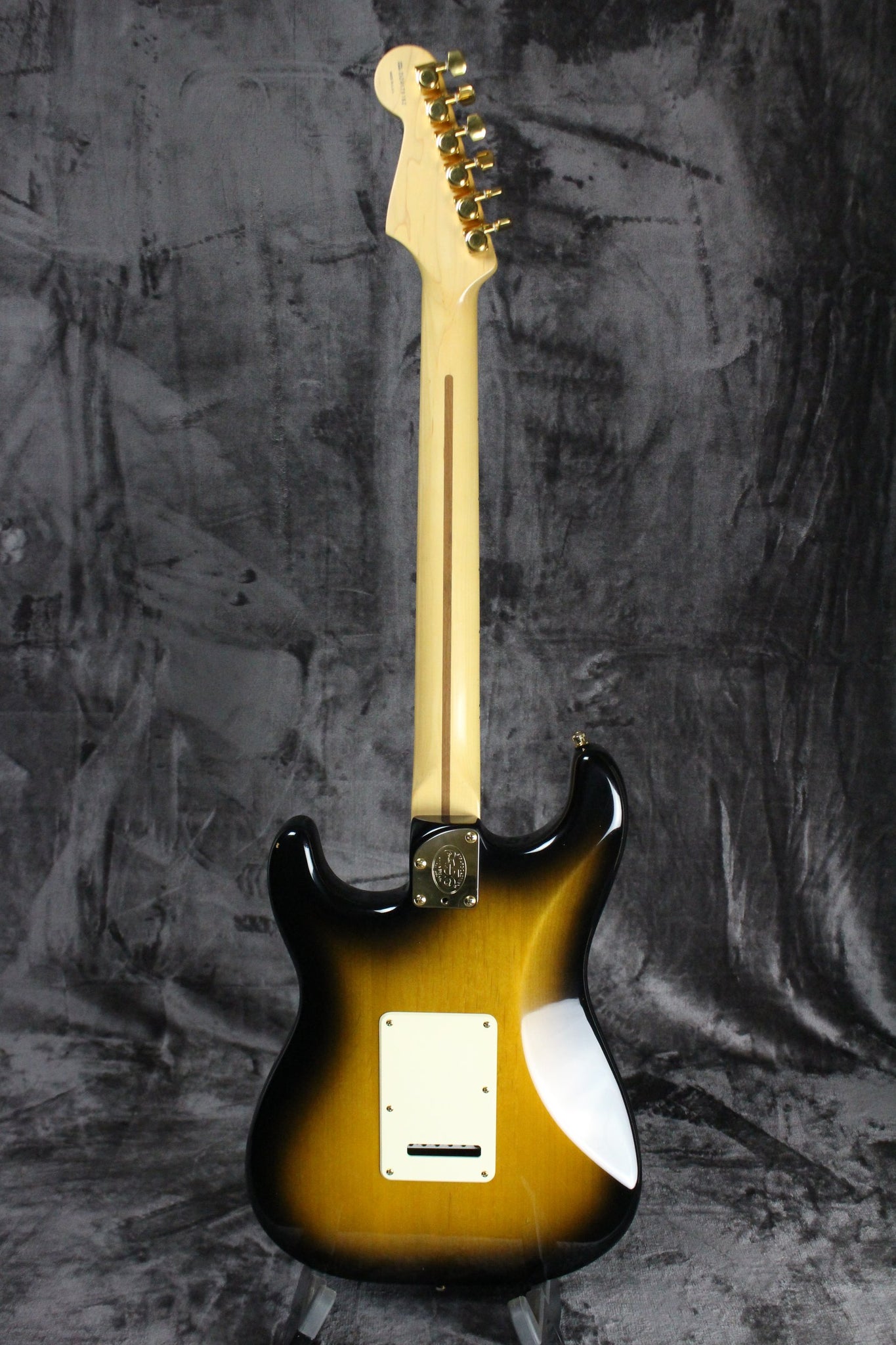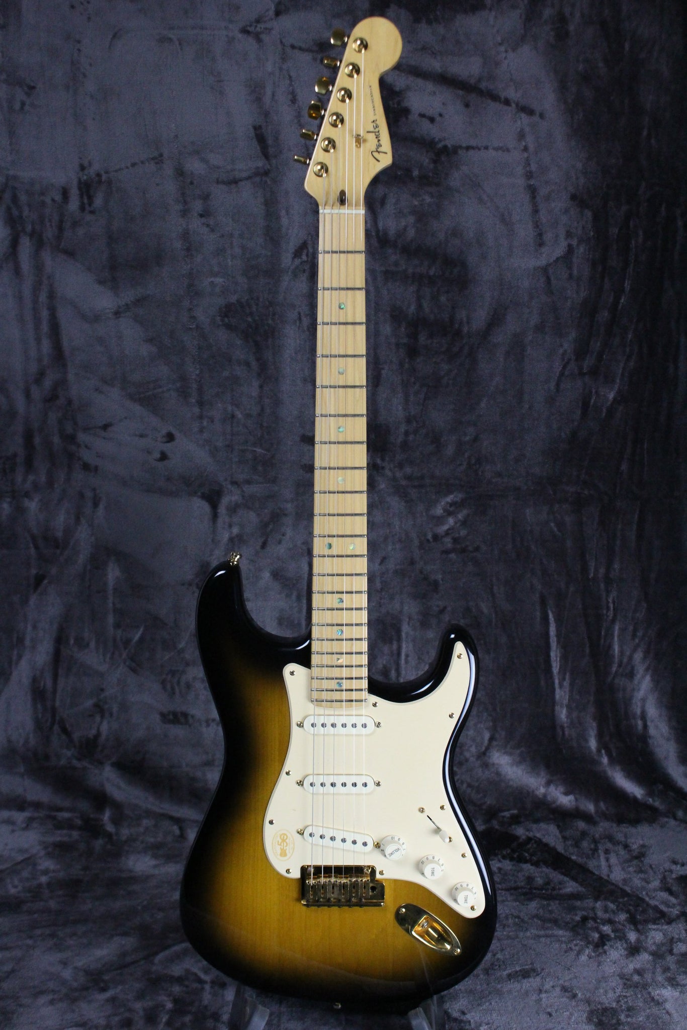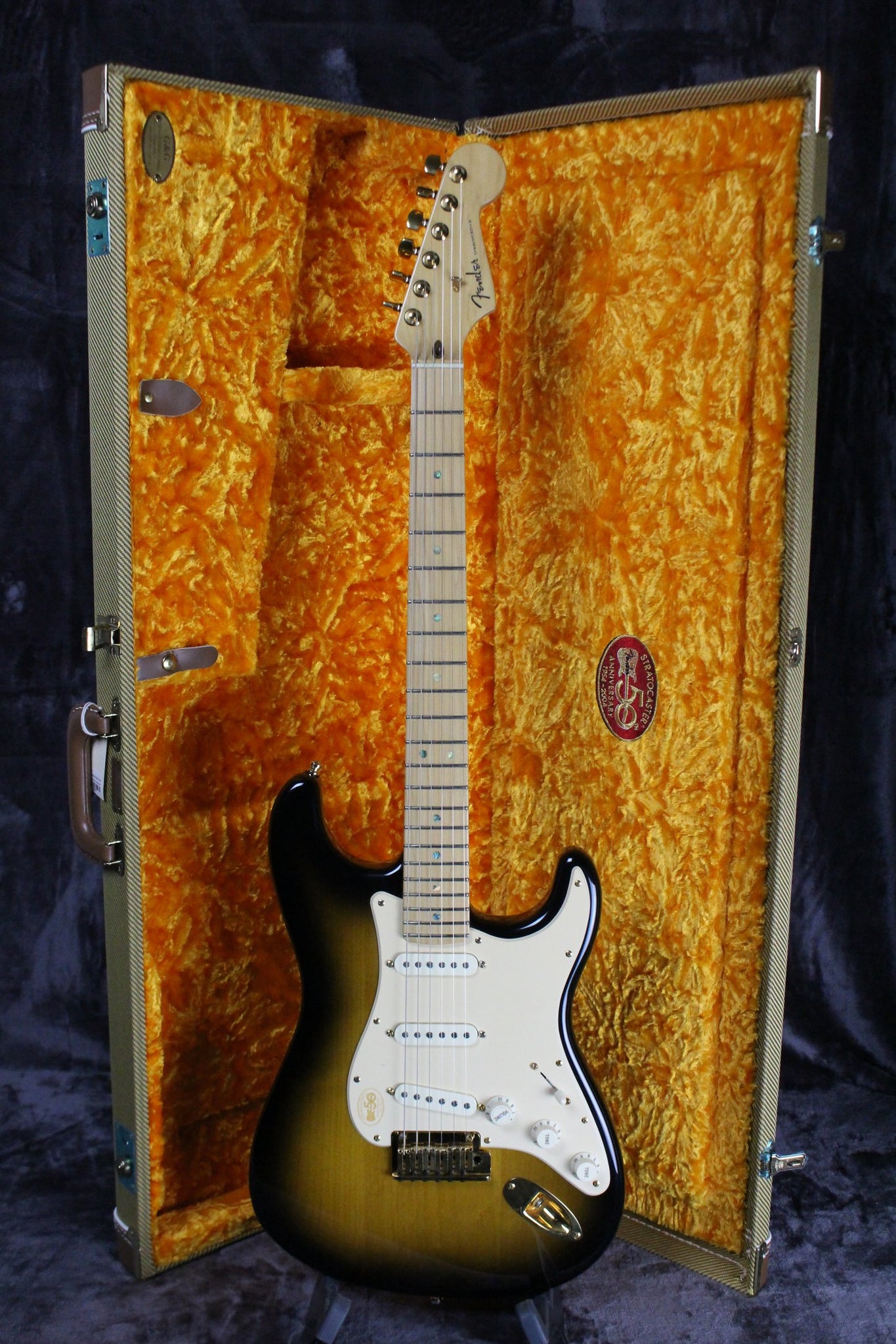 Summary: Produced for the 50th anniversary of the birth of the original Stratocaster in 1954, the 50th Anniversary American Deluxe Stratocaster featured the pinnacle of modern guitar innovation, including three Samarium Cobalt Noiseless Strat pickups, S-1 switching, modern "C" neck shape, 2-point synchronized tremolo with a pop-in arm, staggered locking tuning machines, and a commemorative 50th anniversary hard-shell case.