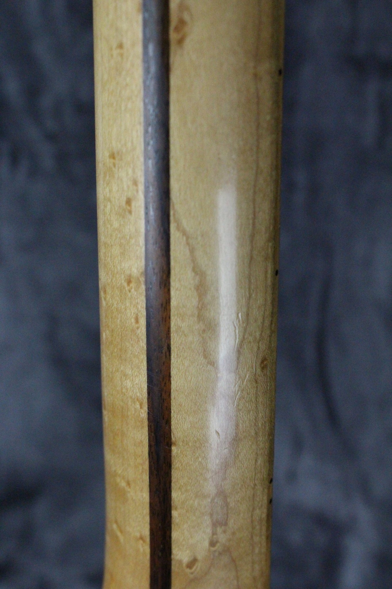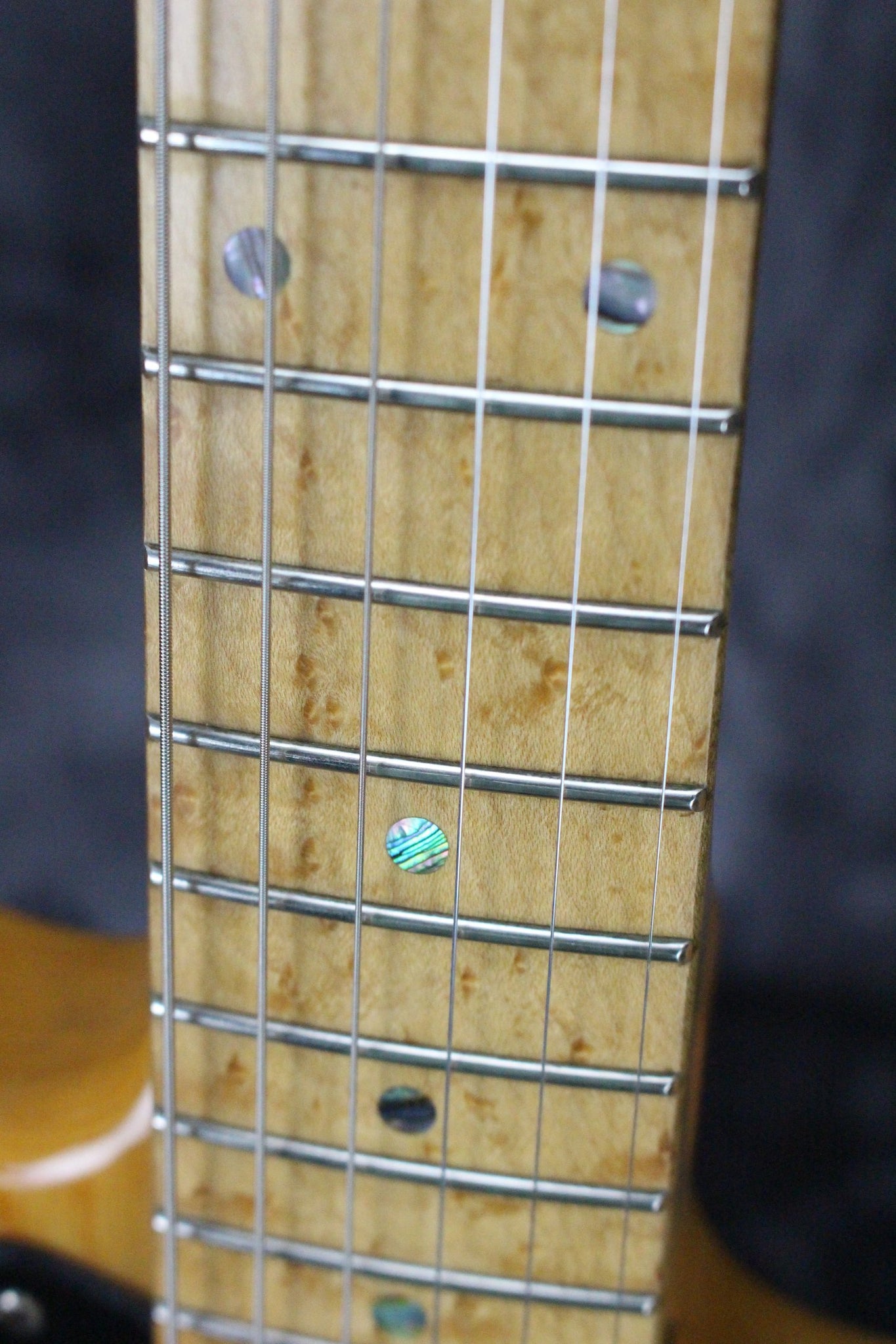 Neck: Birdseye Maple, 25.5” scale length, 1.6875” nut width, 9.5” radius, “V” shape, 22 frets.