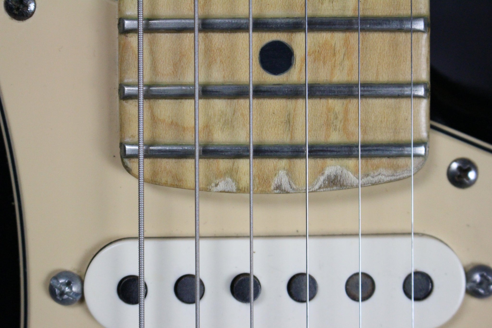 Pickups/Hardware: Three American single coil pickups, Schaller tuning keys, bone nut, Callaham saddles, master volume/2x tone controls/5-way pickup selector, cream 3-ply pickguard.
