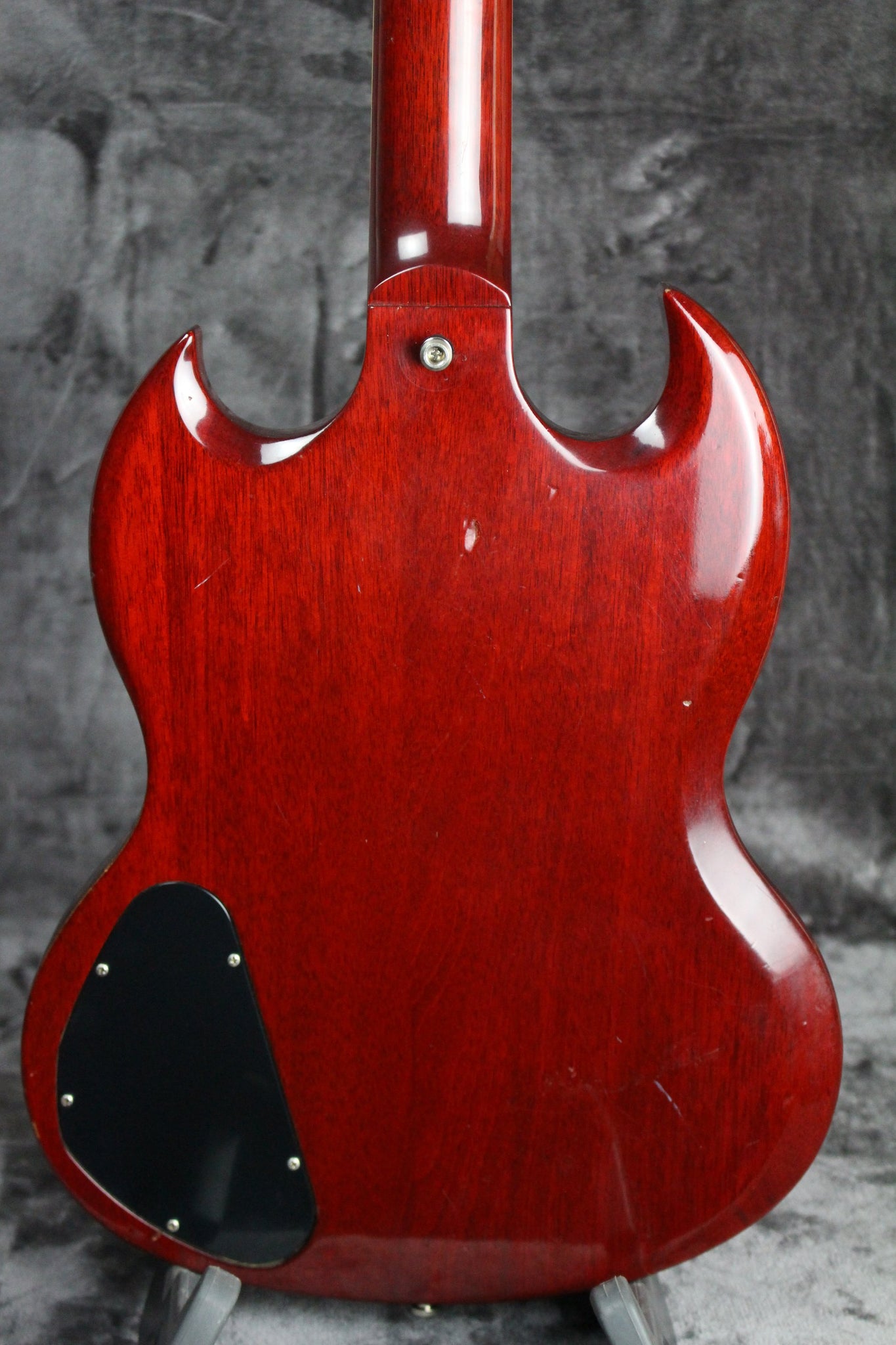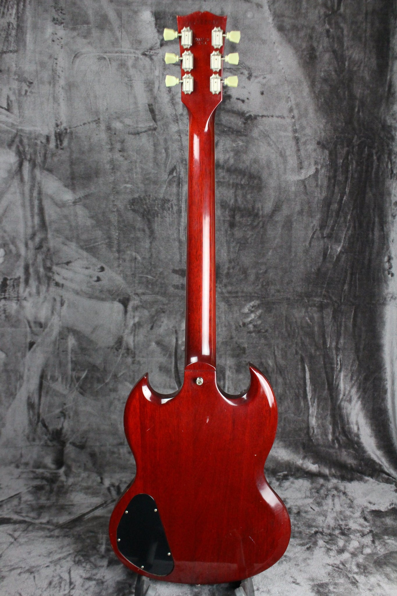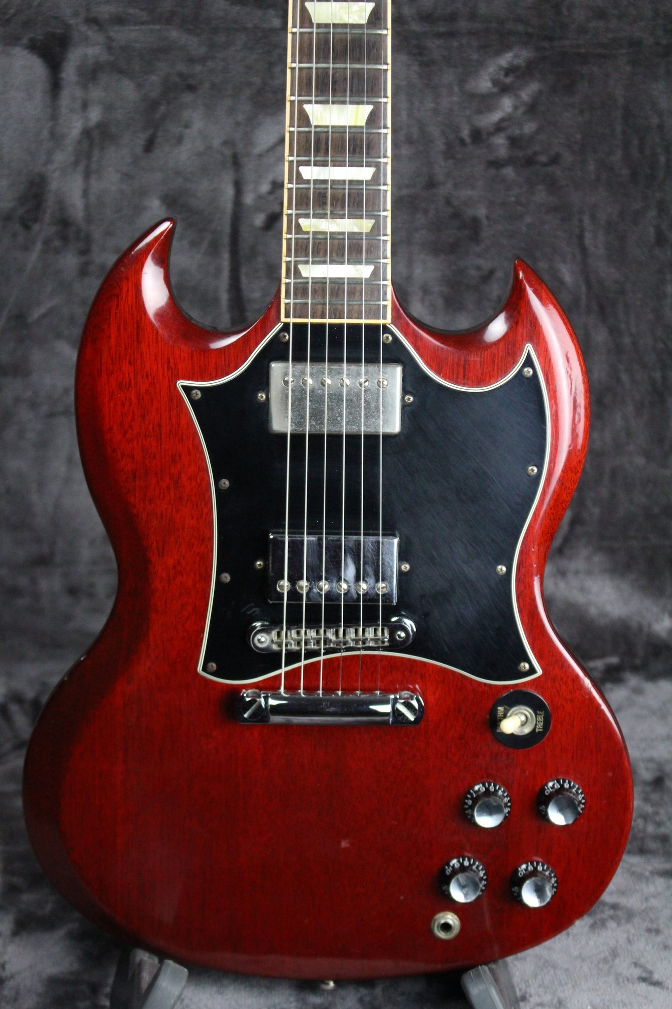 Summary: The Gibson SG Standard, famous for its comfortable, fast-action neck, is a perennial favorite among us here at Empire Guitars. A rounded profile mahogany neck, bound rosewood fingerboard, long tenon 19th fret neck joint, and a solid mahogany body provide the backbone for singing sustain. The 490R and 490T pickups provide the power to drive. It has a five-ply, full-face pickguard, two volume/two tone controls, and a three-way pickup selector. This SG Standard has been gigged with but cared for and it still has a ton of life left in it.