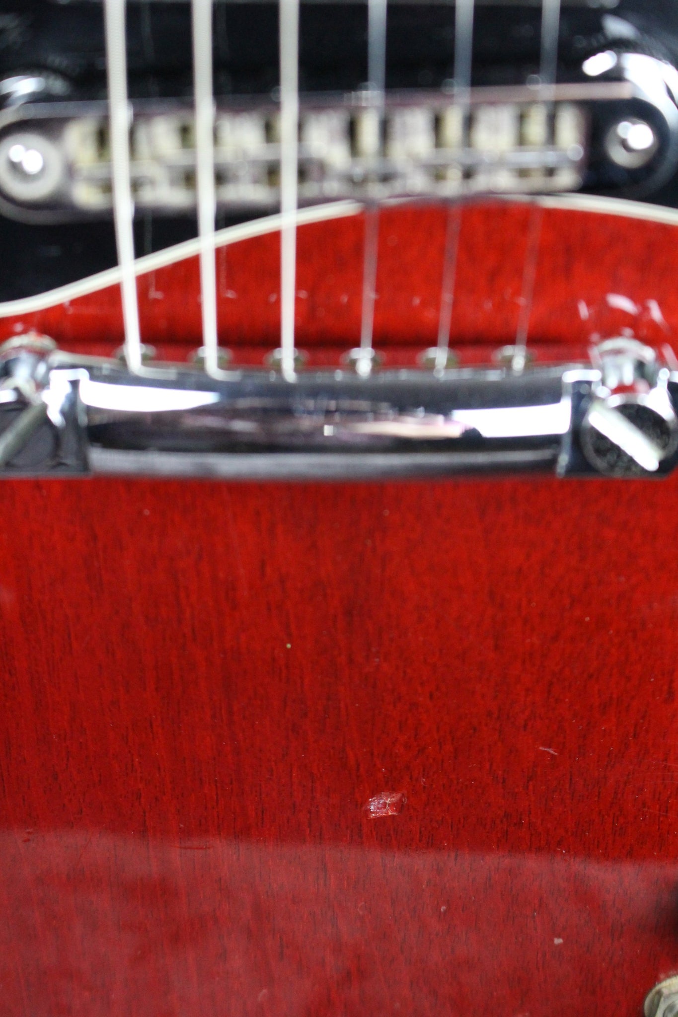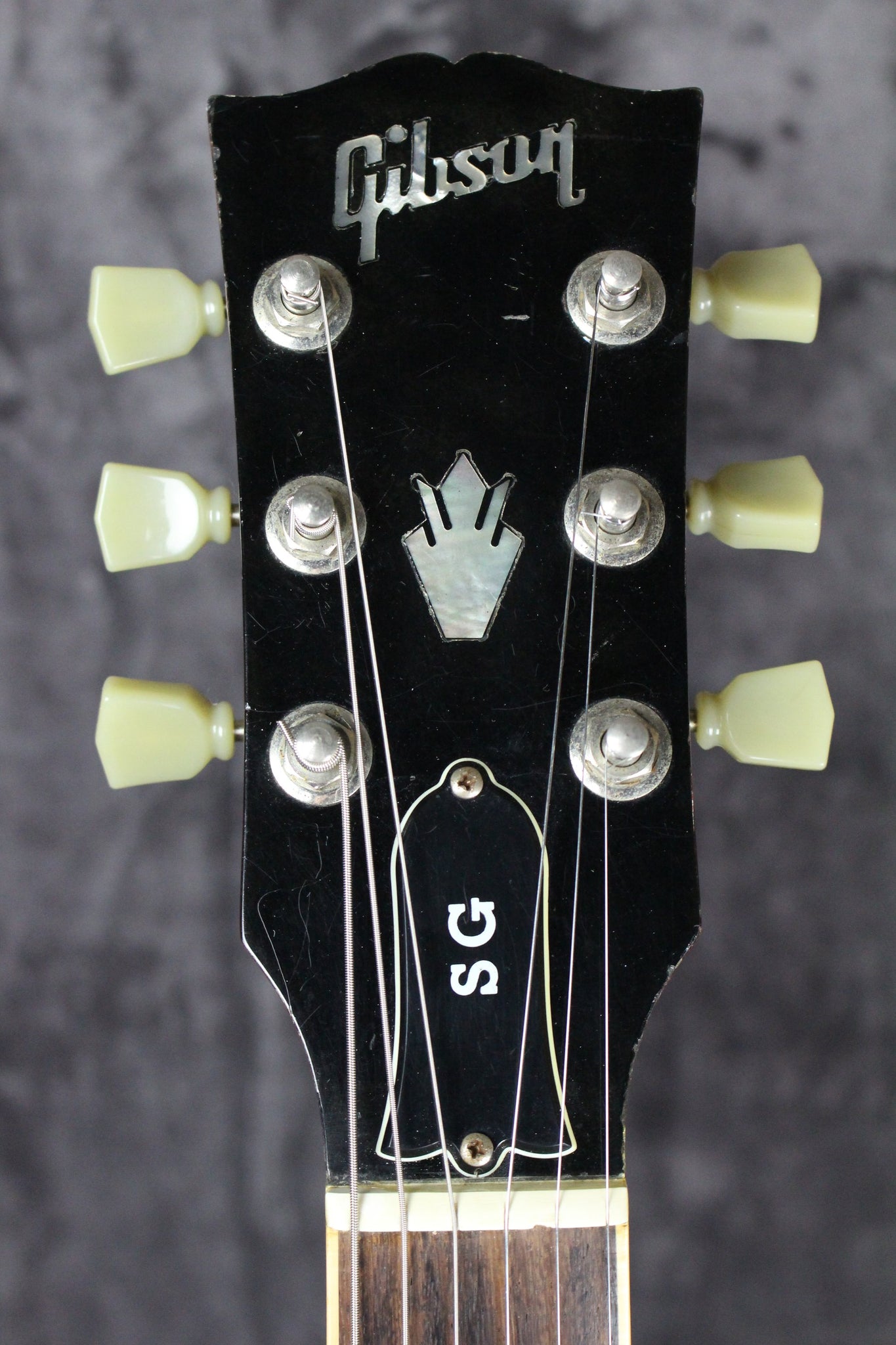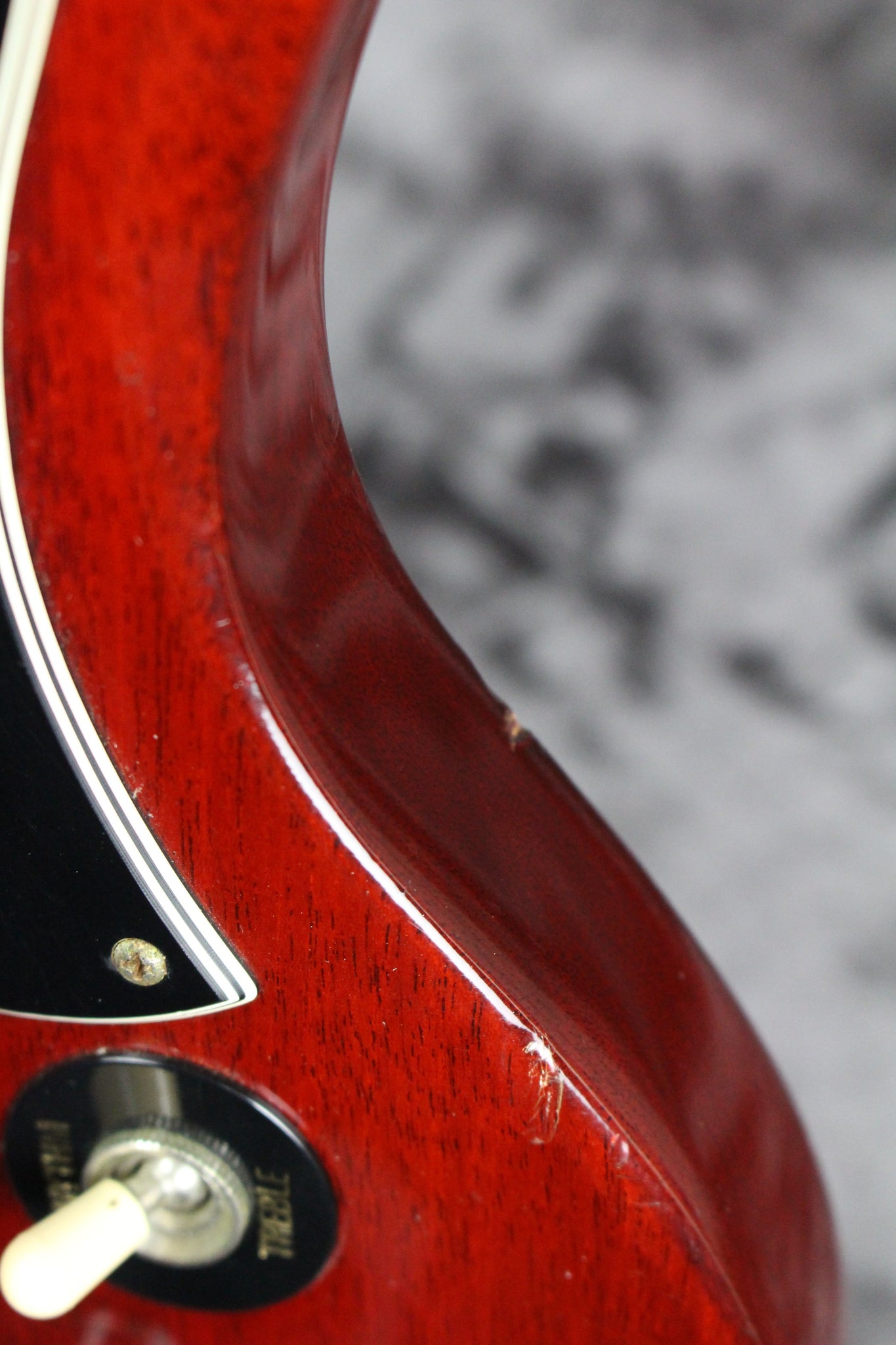 Cosmetics: This guitar has light surface scratches throughout. There are various nicks, dings, and scratches on this guitar. There is noticeable wear on the edges of the headstock. There is a tiny chip in the nut between the G and the B string. The frets have very light wear. The pickguard has regular wear, and the back of the neck is in great shape. Overall, this guitar has a few cosmetic issues but it plays great and sounds fantastic.
