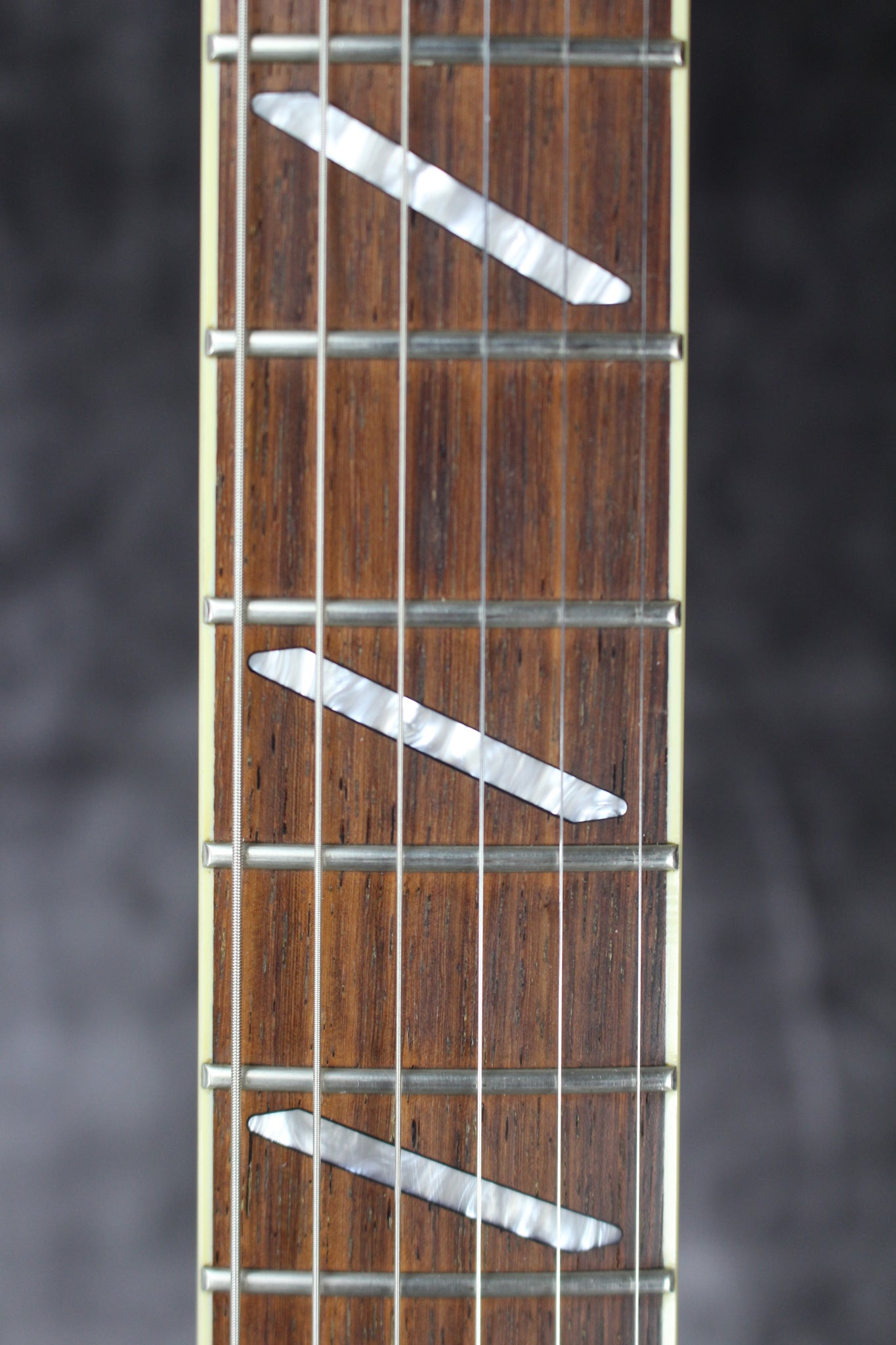 Neck: Mahogany with a bound Rosewood fingerboard, 25” scale length, 1.62” nut width, 22 frets, pearloid inlays.