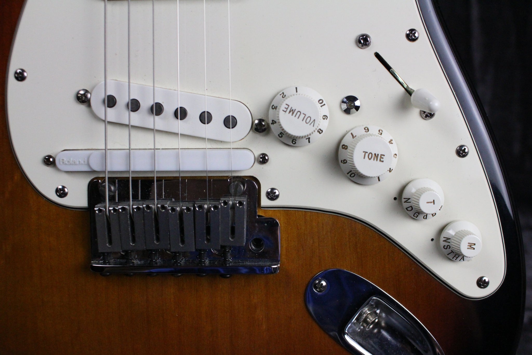 Pickups/Hardware: Three single coil pickups, Roland GK pickup, five-way pickup selector, master volume/master tone, two rotary knobs for modeling selections, Fender closed gear tuning keys.