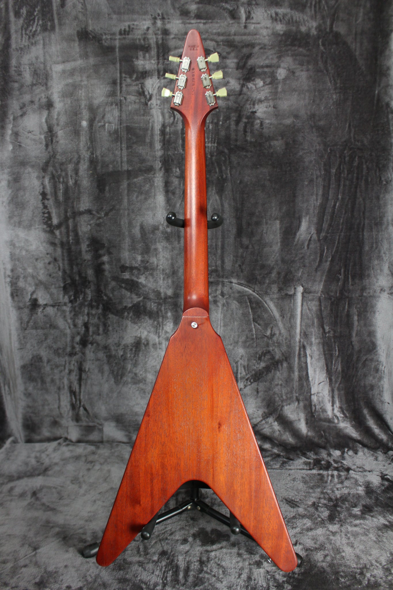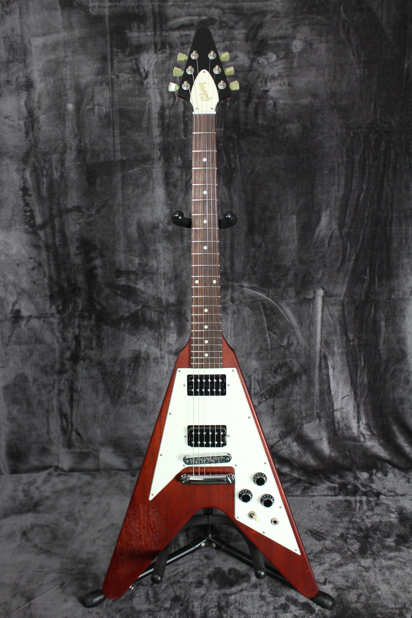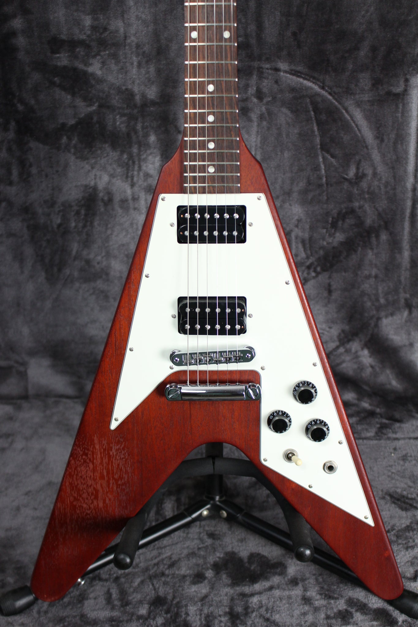 Summary: This 2007 Gibson Flying V Faded is a great, straight ahead guitar. It pairs Mahogany for the body and neck, with Rosewood for the fingerboard and that’s it for woods. To simplify the guitar, an ABR type tune-o-matic bridge and stop tailpiece set are installed in place of the original string-through design. Wiring is pretty standard, with a pair of uncovered humbucking pickups controlled by a pickup selector, individual volume controls, and a master tone.